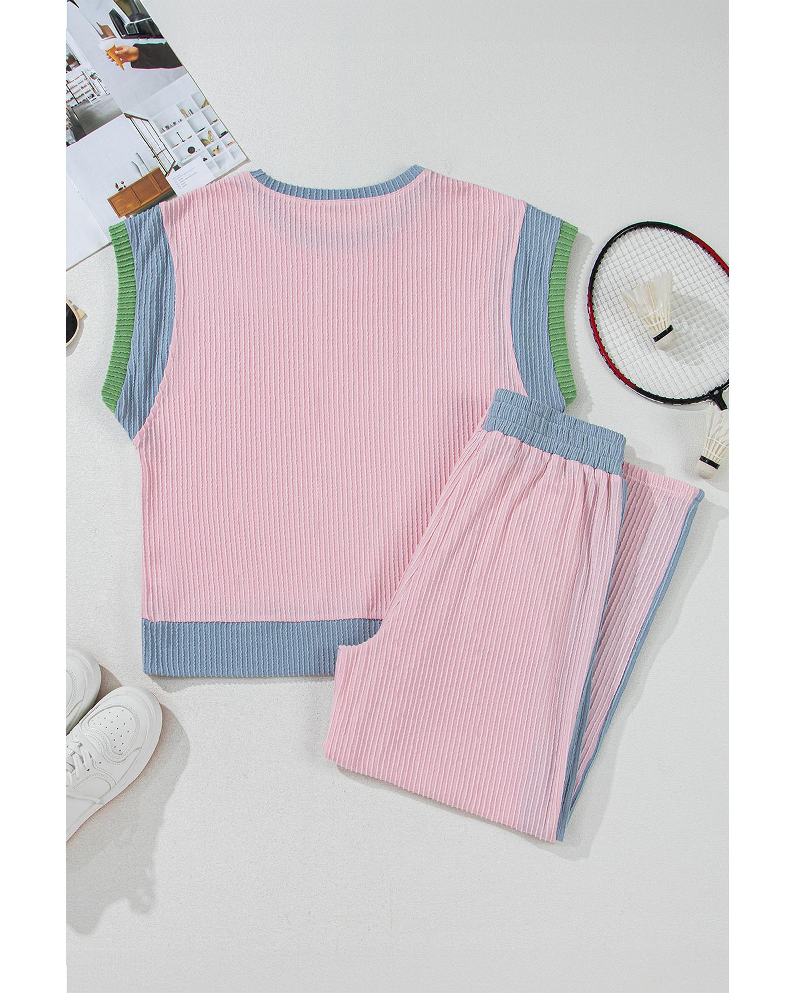 Pink Corded Colorblock Patchwork Short Sleeve Top and Loose Pants Set – S