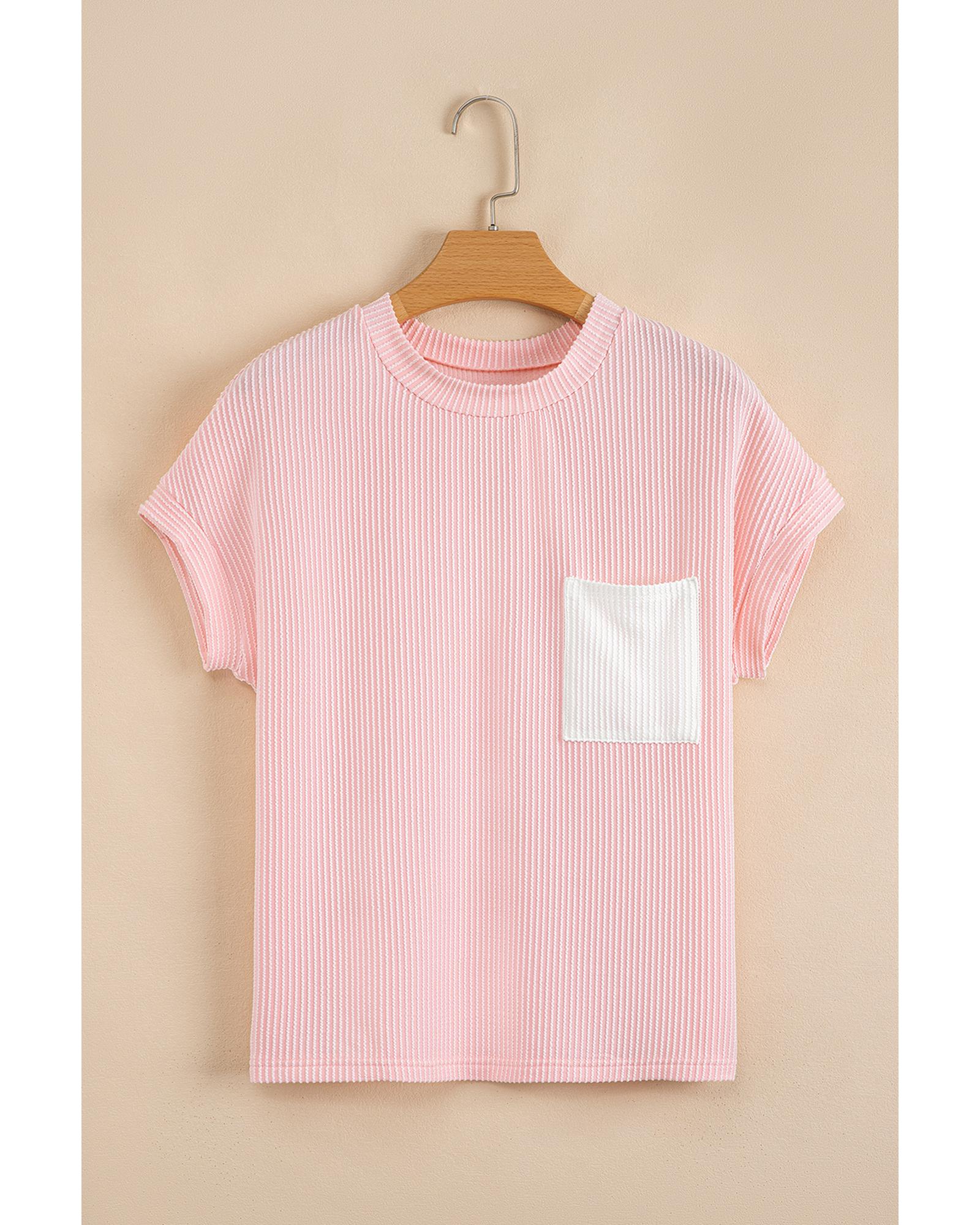 Pink Corded Knit Color Block Pocketed Crew Neck T Shirt – S