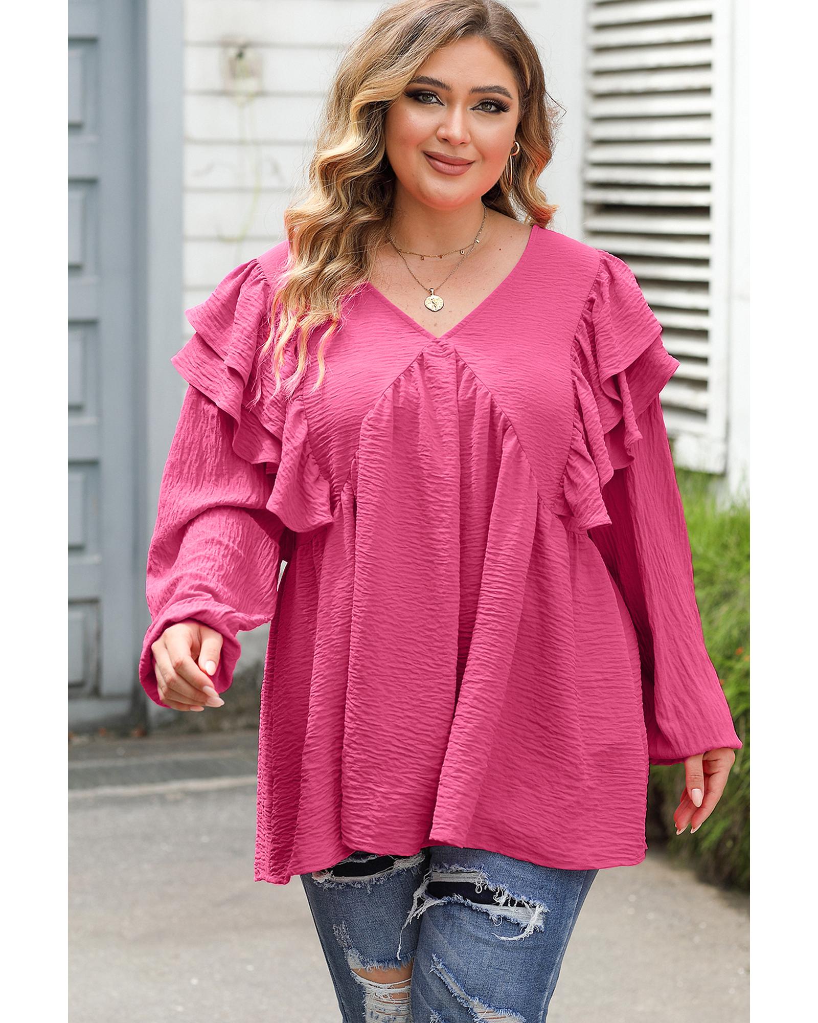 Pink Crinkle Ruffled V Neck Plus Size Blouse - 2X