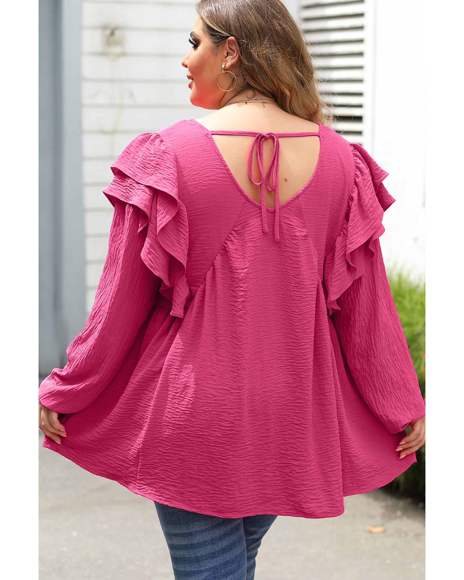 Pink Crinkle Ruffled V Neck Plus Size Blouse - 1X