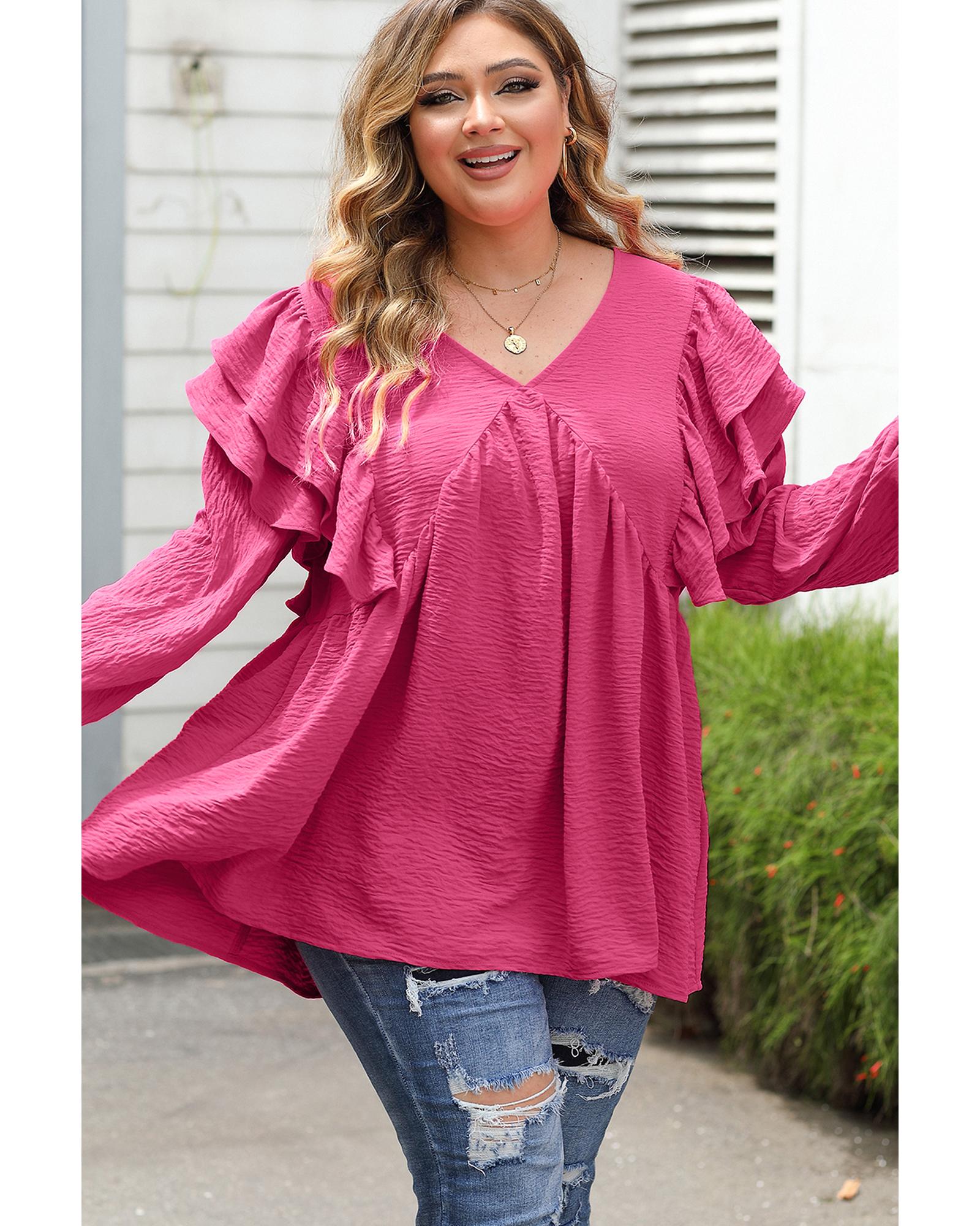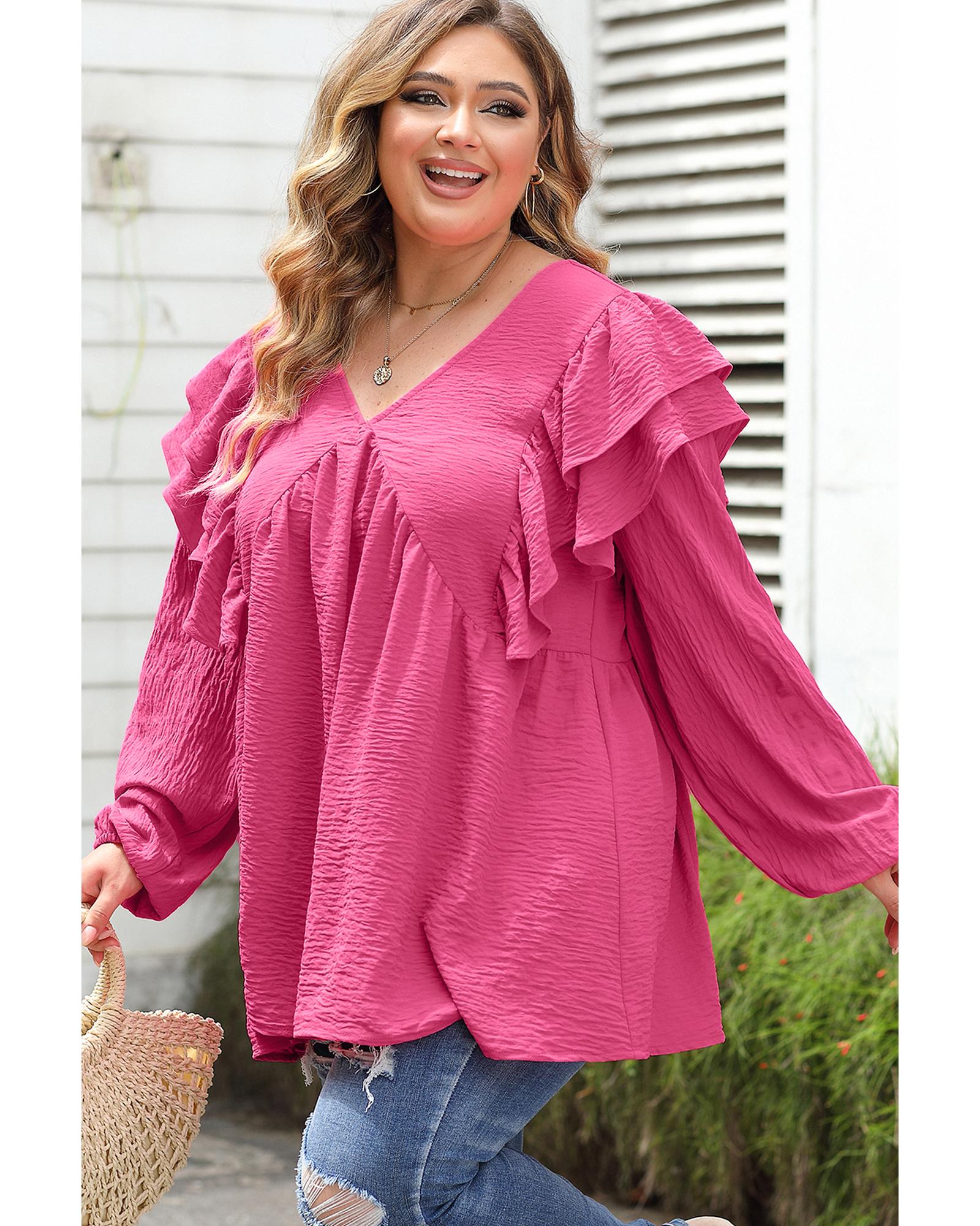 Pink Crinkle Ruffled V Neck Plus Size Blouse - 2X