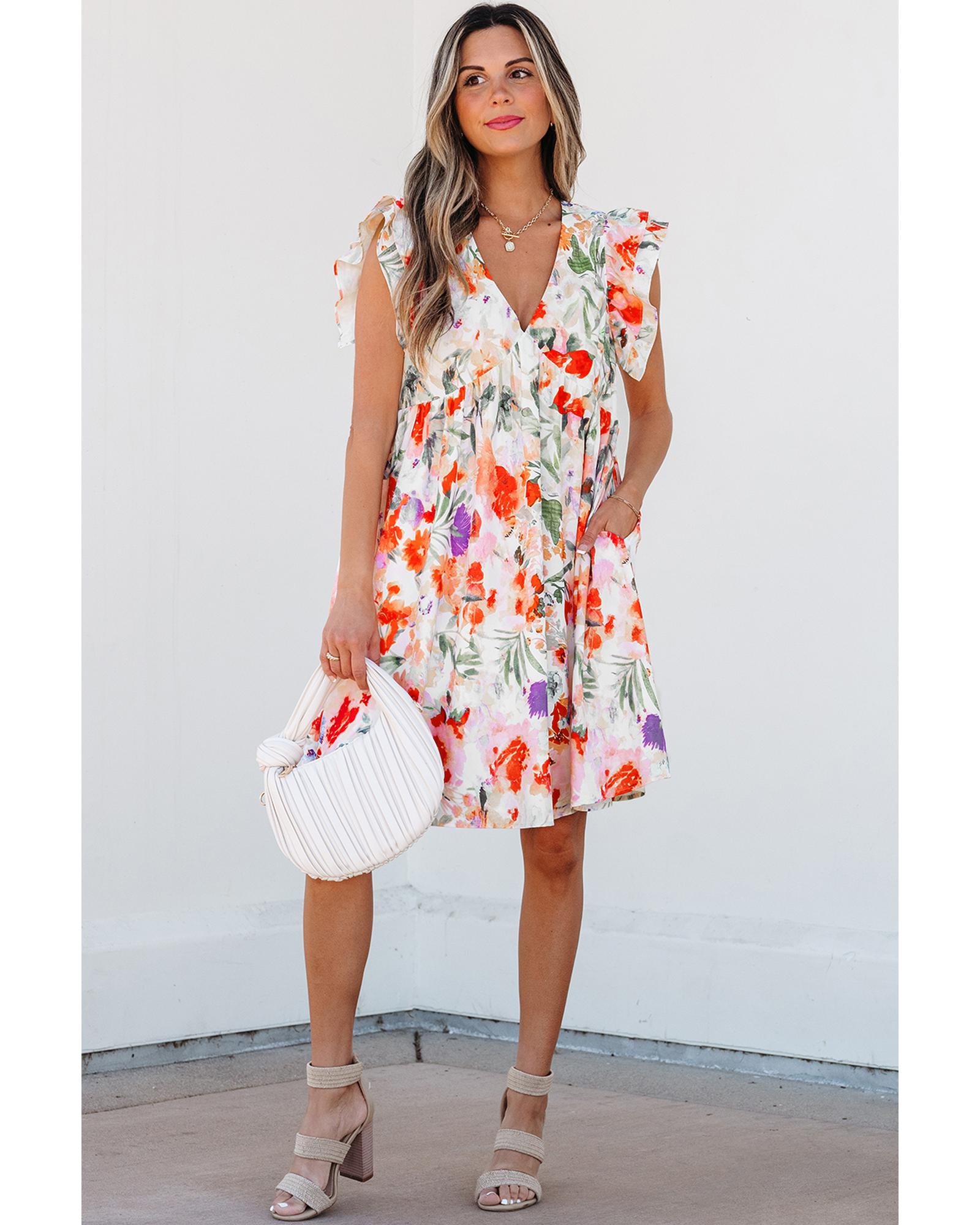 Pink Floral Double Ruffle Sleeve V Neck High Waist Mini Dress – M