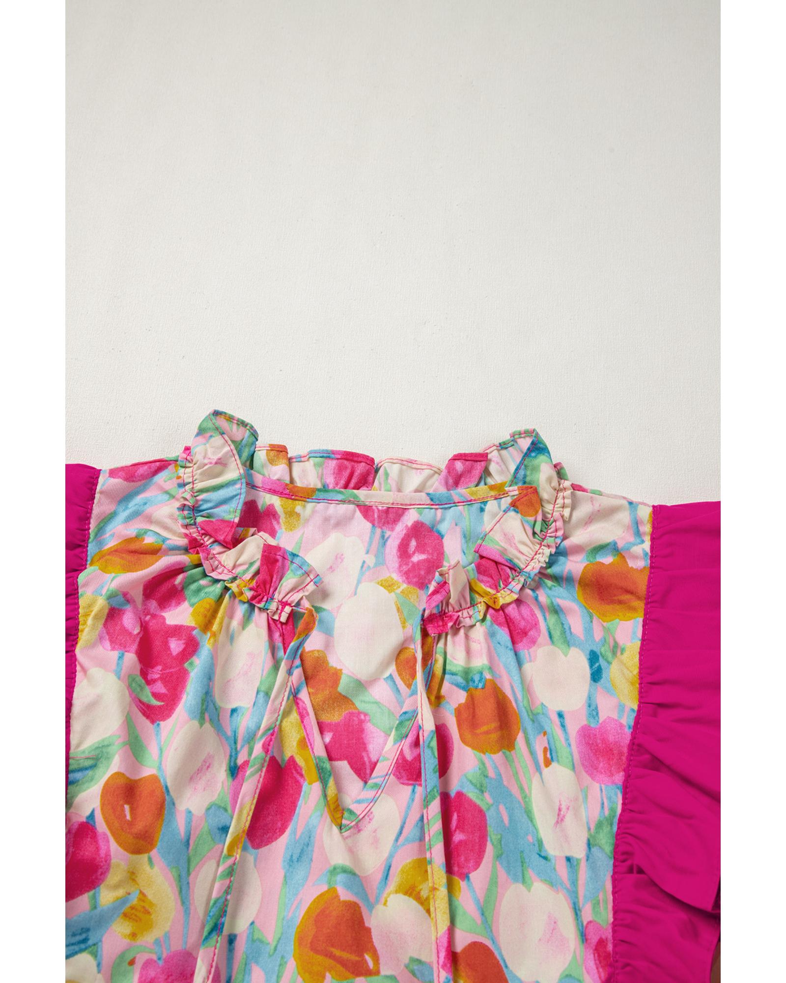 Pink Floral Layered Ruffle Flutter Sleeve Tie V Neck Blouse – M
