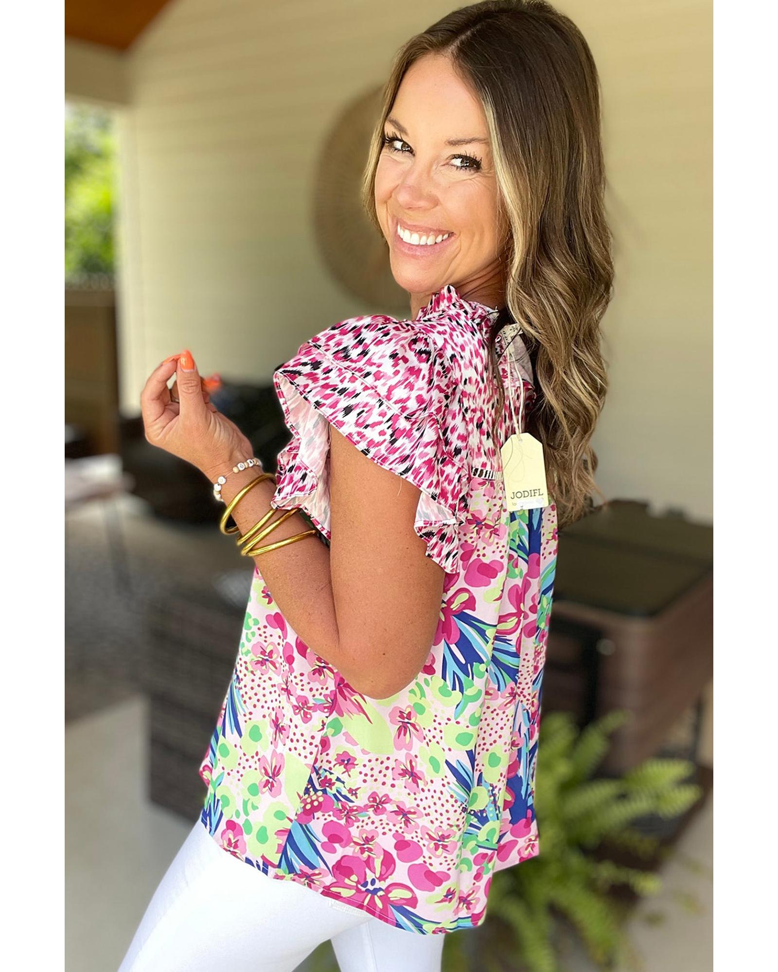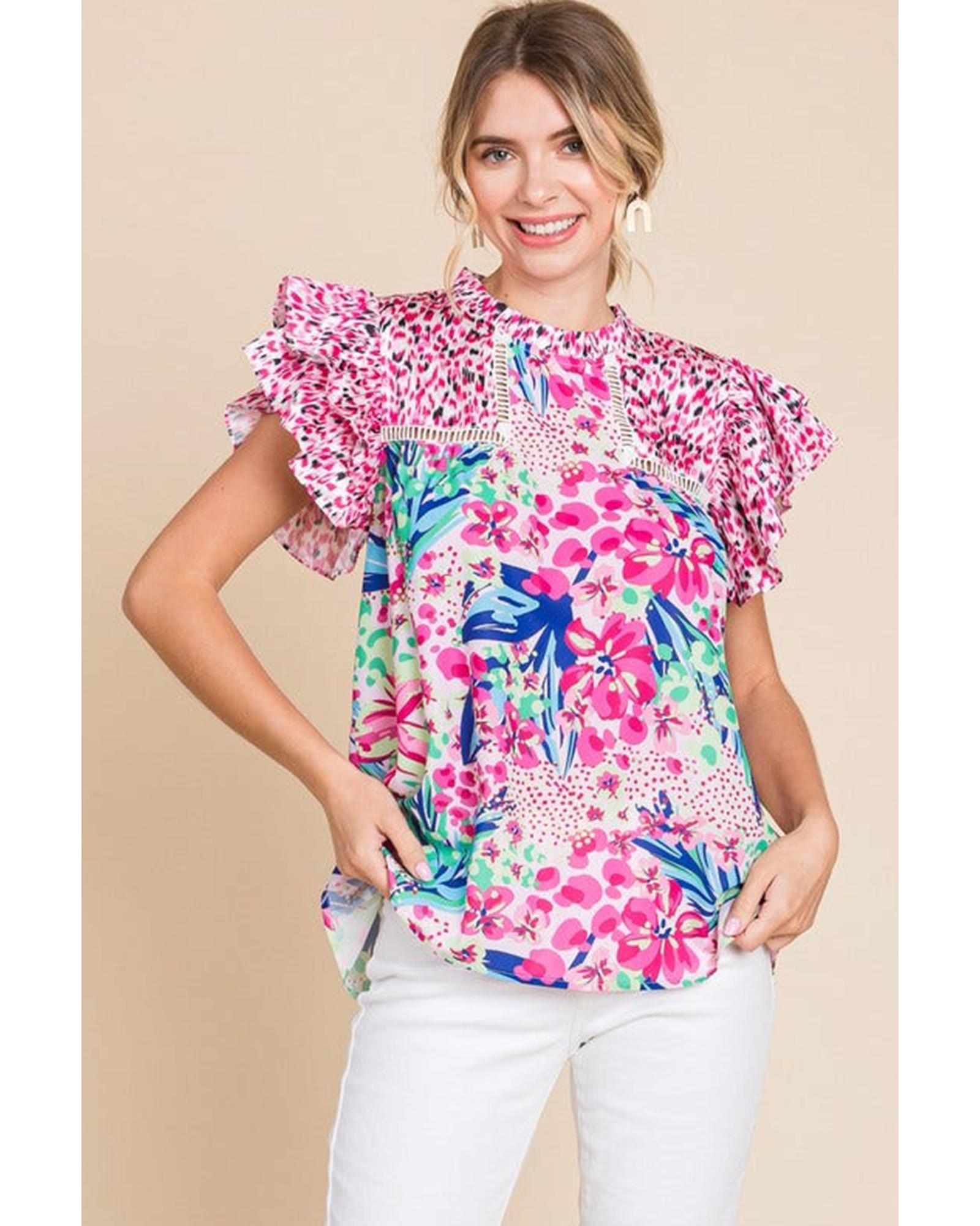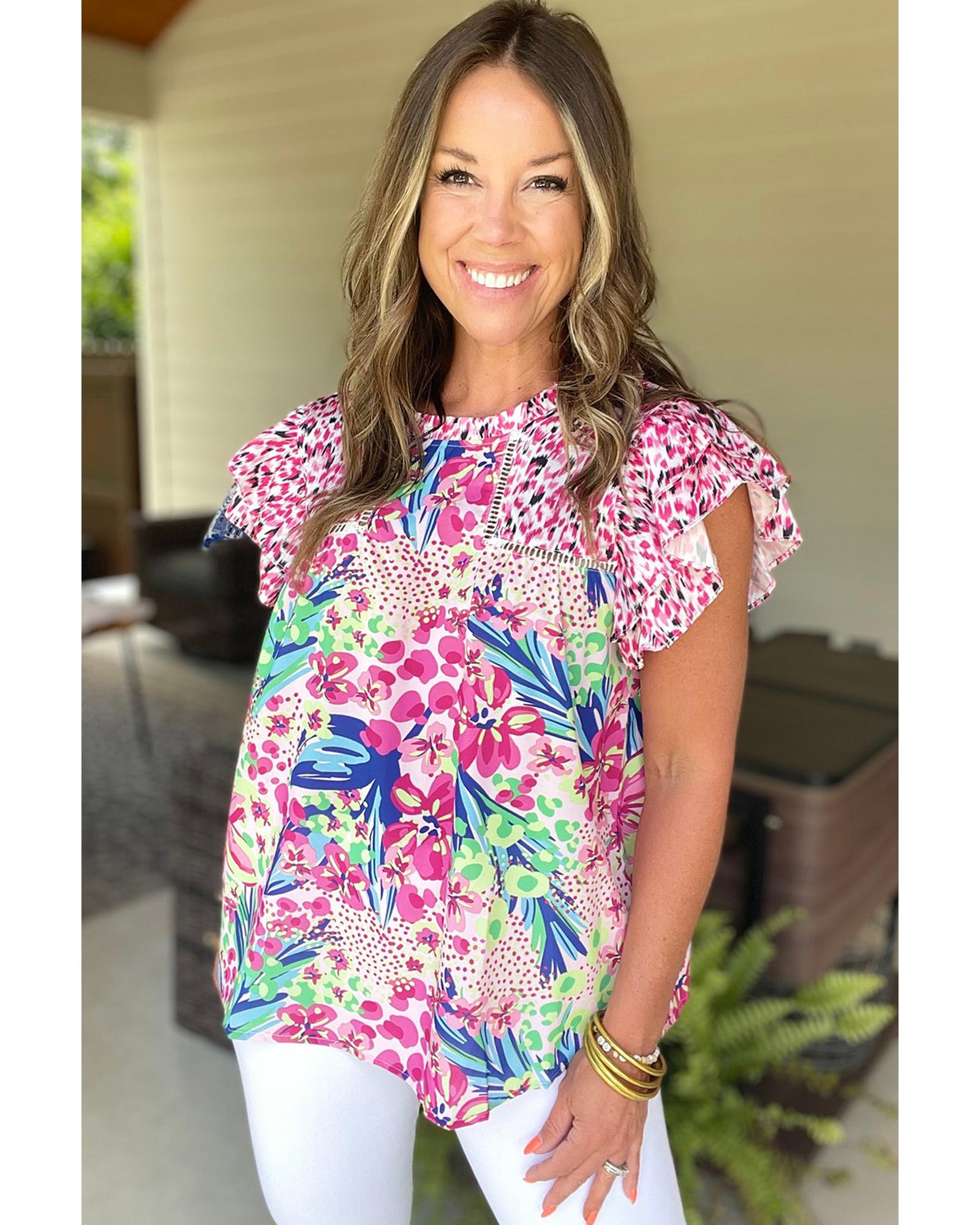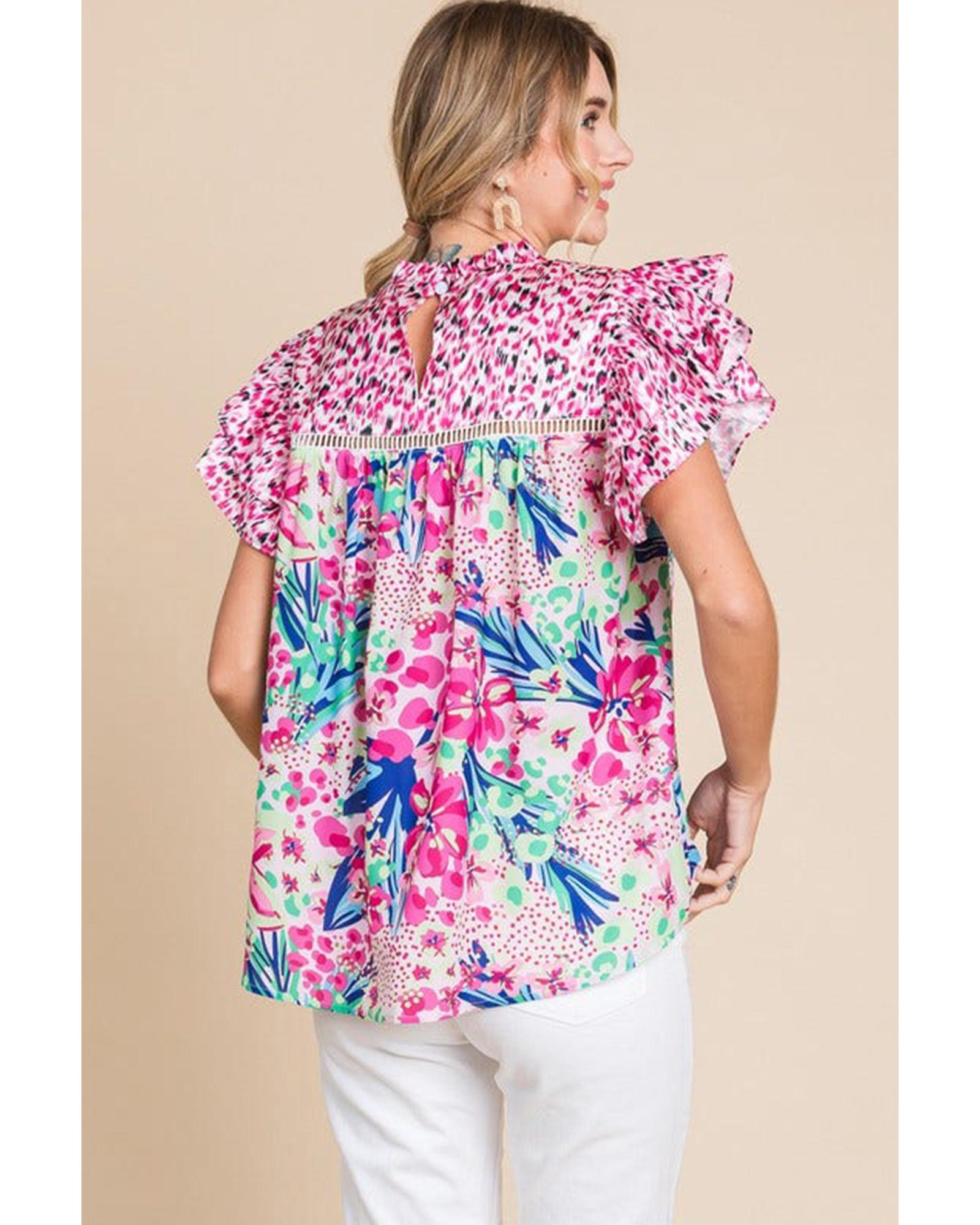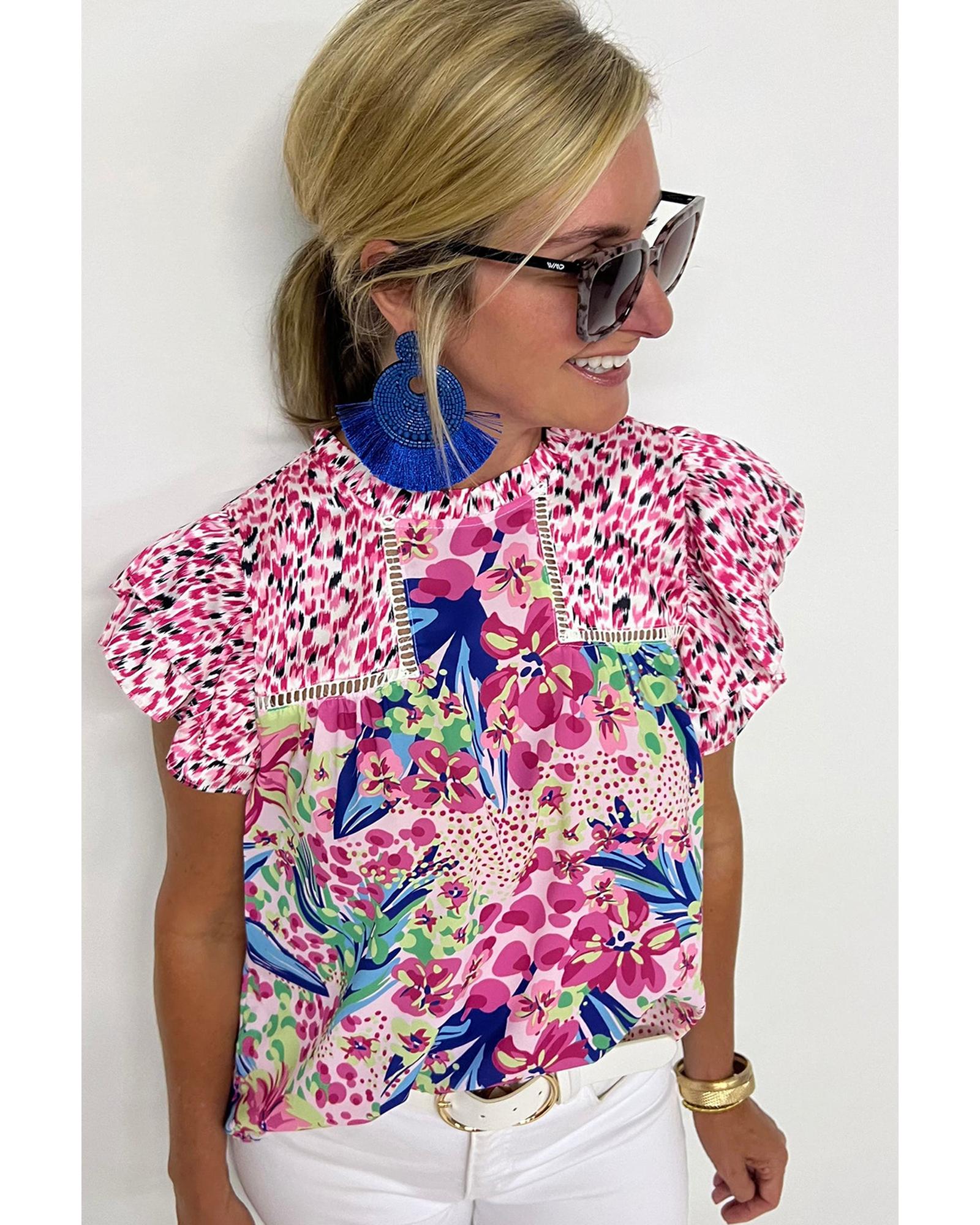 Pink Floral Mixed Print Ruffle Cap Sleeve Blouse – S