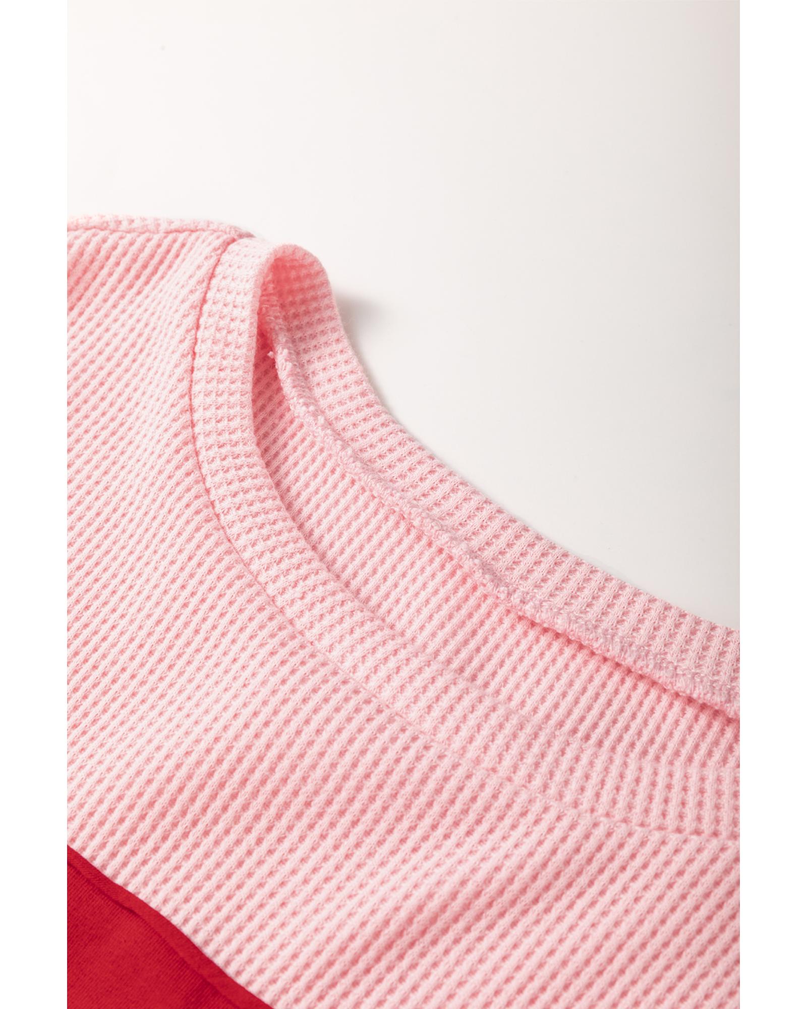 Pink Floral Patch Color Block Striped Sleeve Textured Top – M