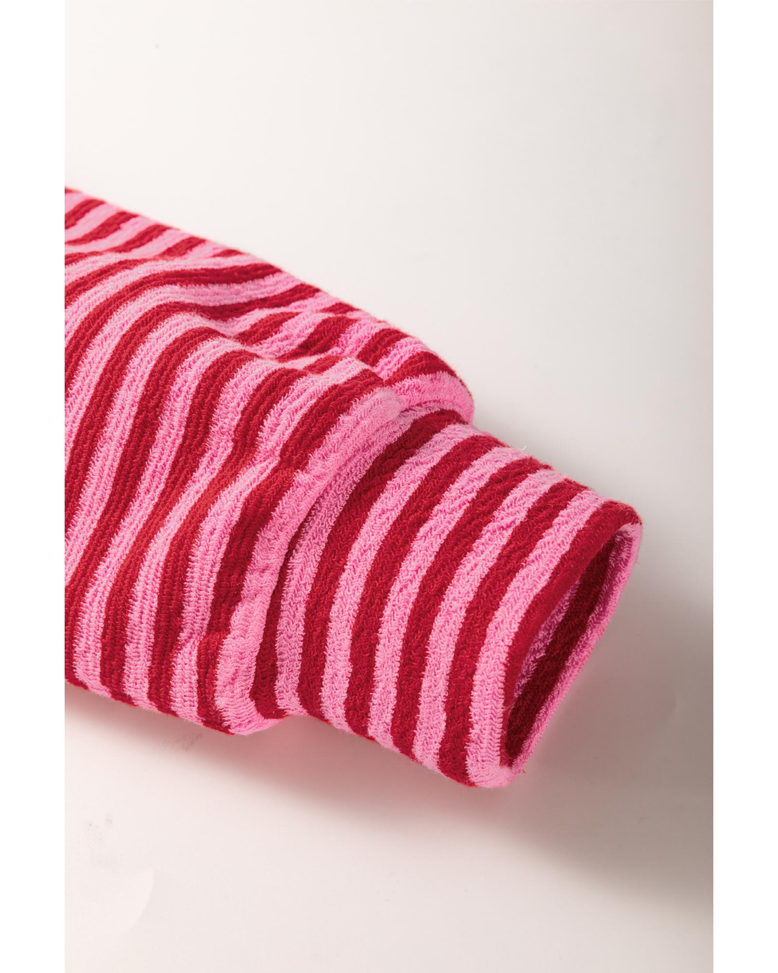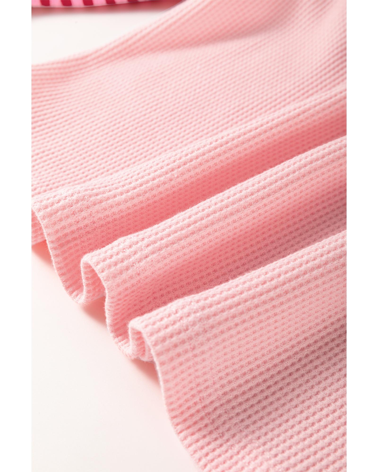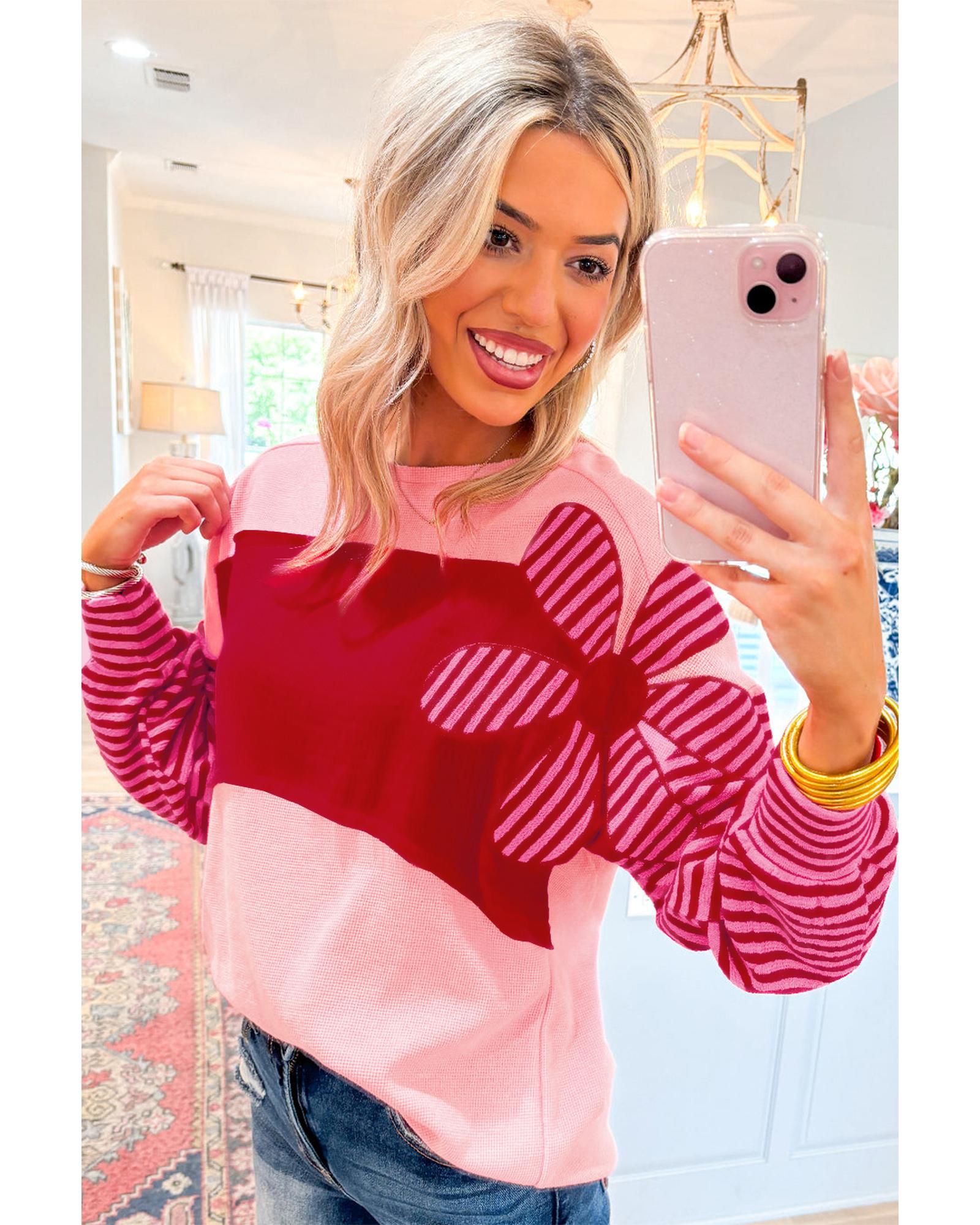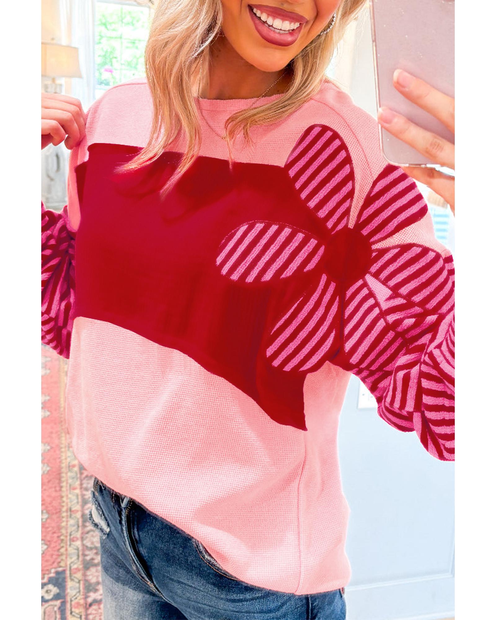 Pink Floral Patch Color Block Striped Sleeve Textured Top – XL
