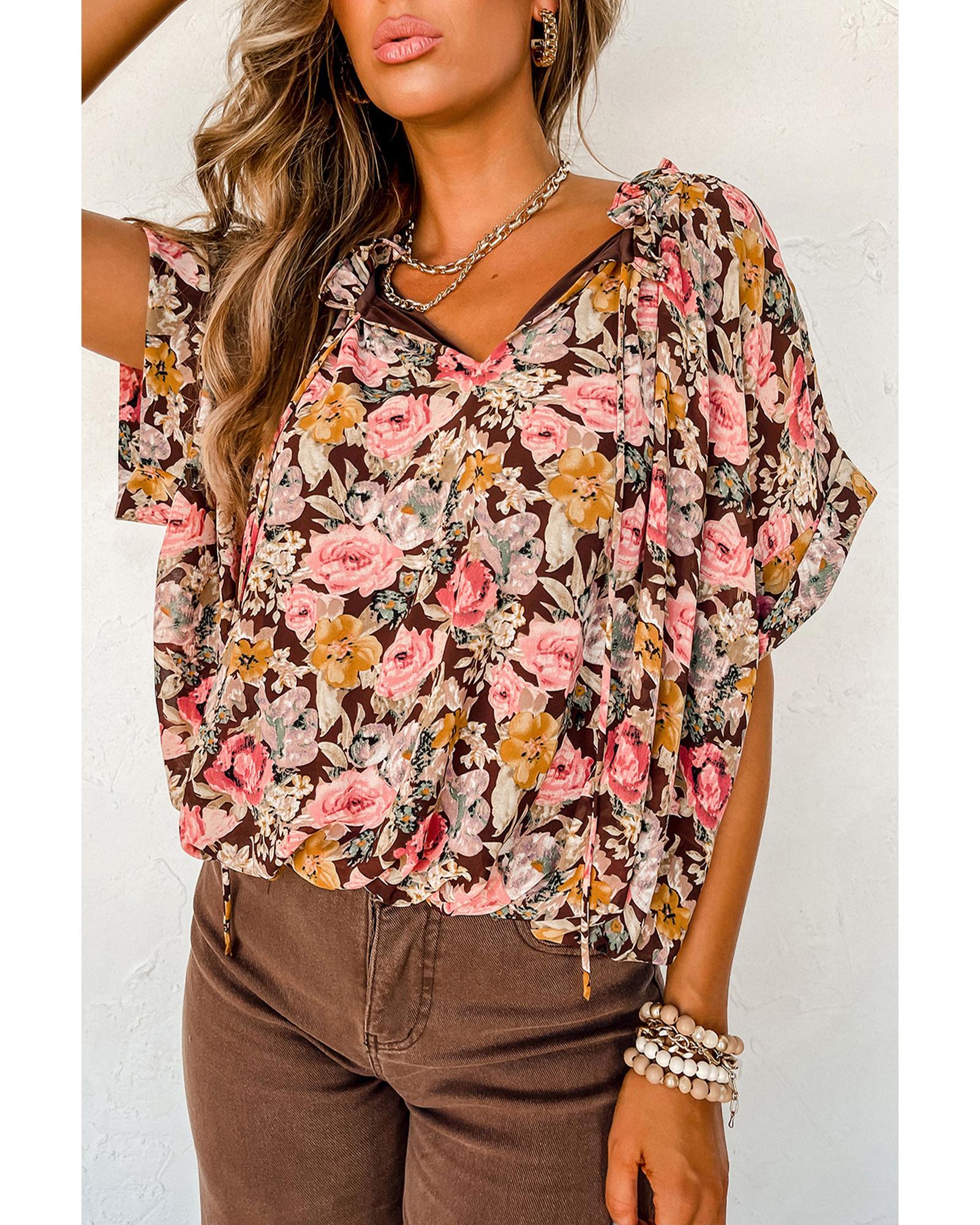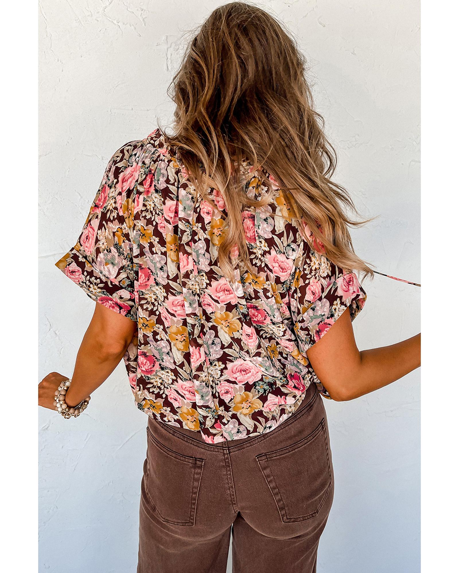 Pink Floral Print Bubble Hem Split Neck Blouse – M