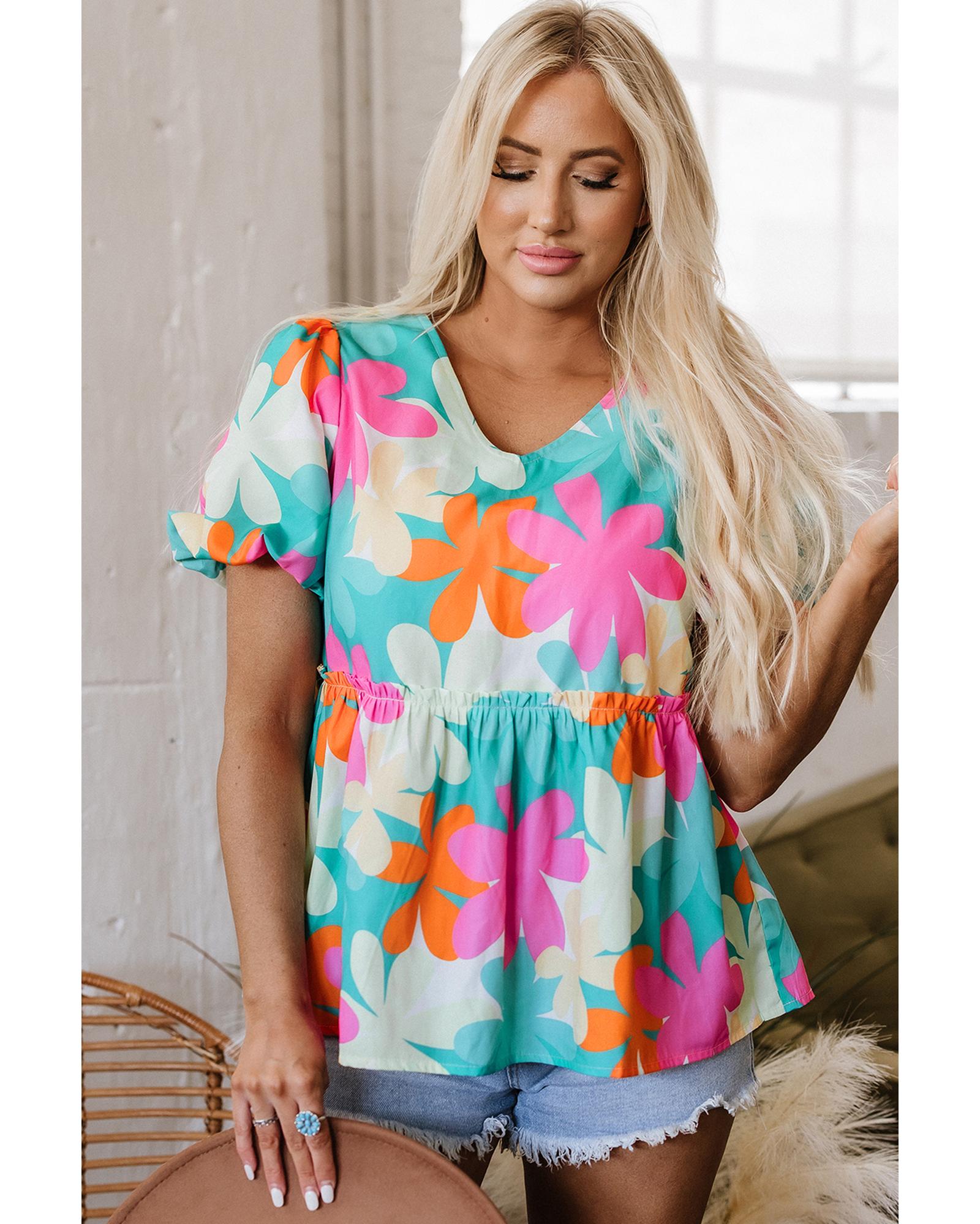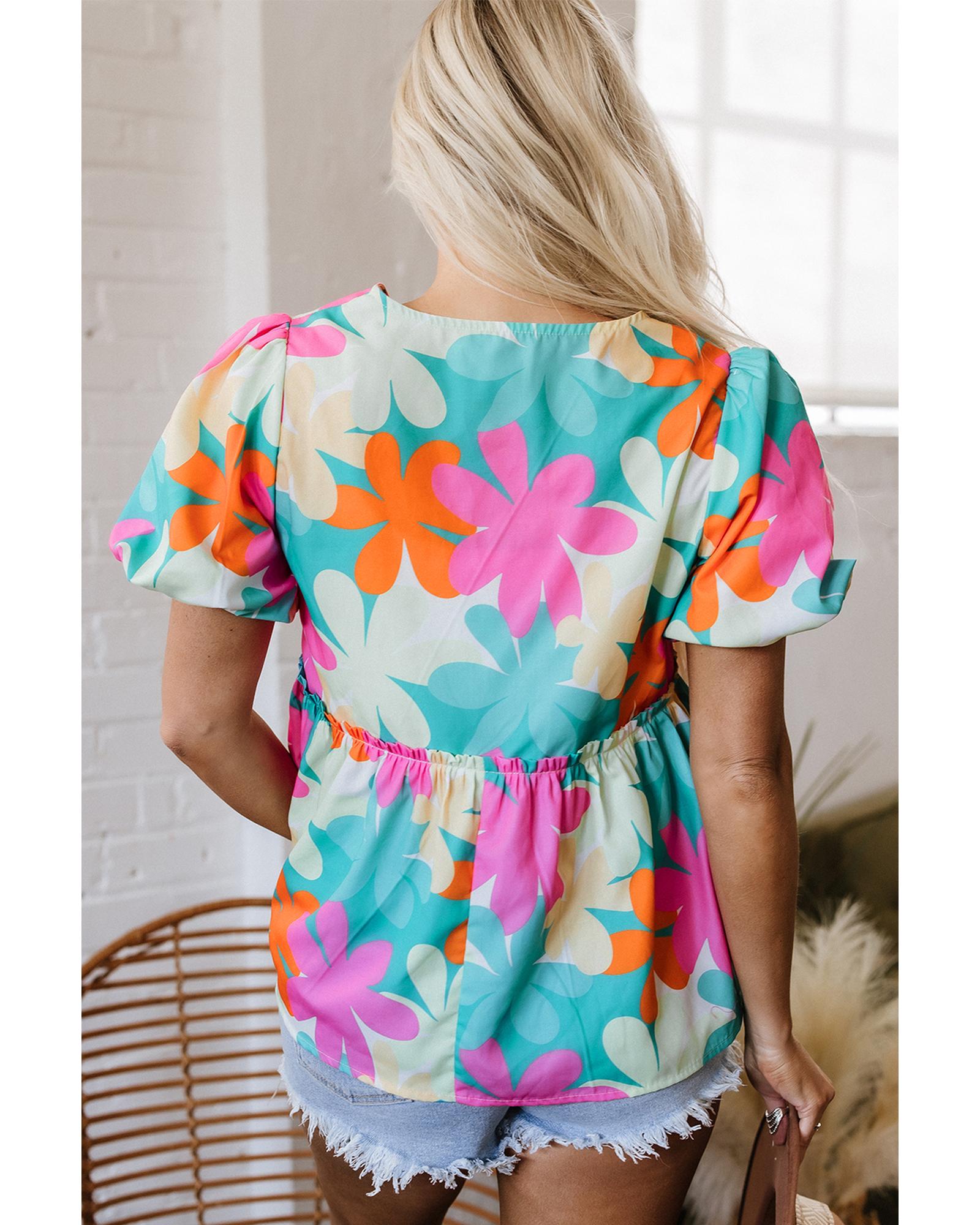 - Pink Floral Print Bubble Sleeve V Neck Peplum Blouse