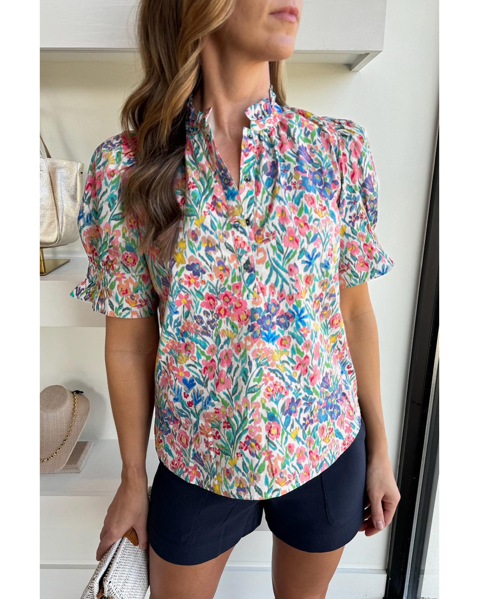 Pink Floral Print Button Split Neck Puff Sleeve Blouse – L