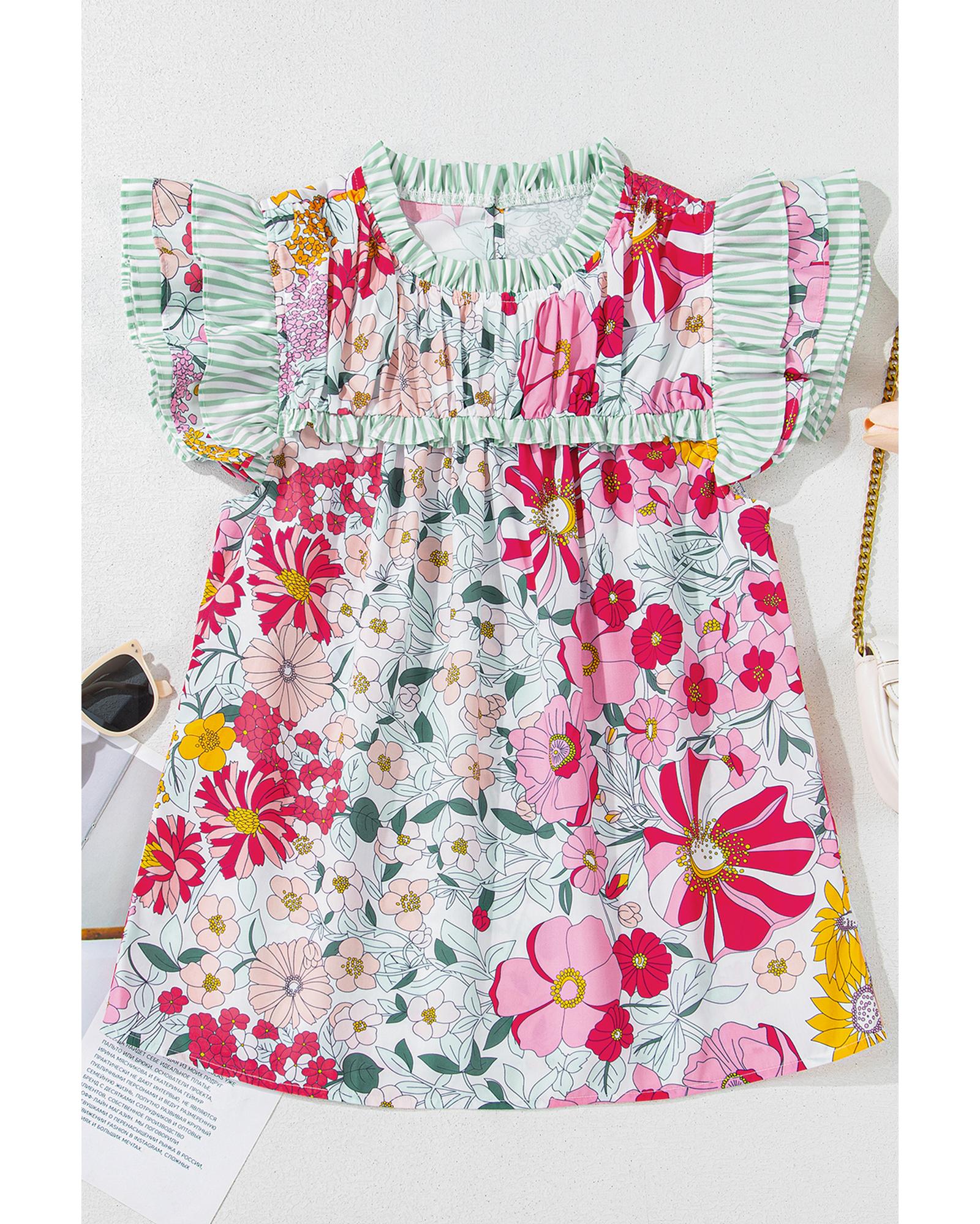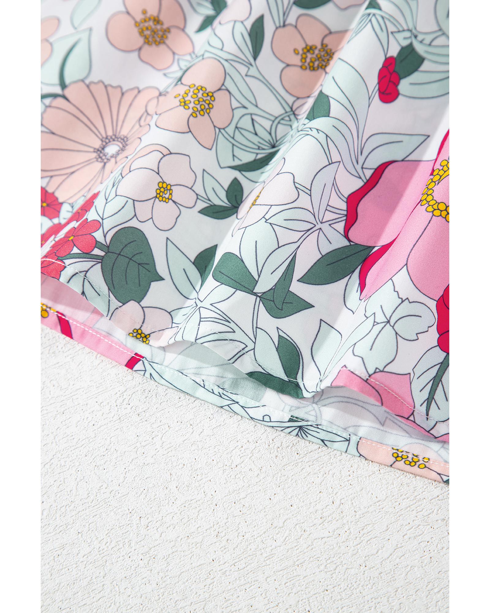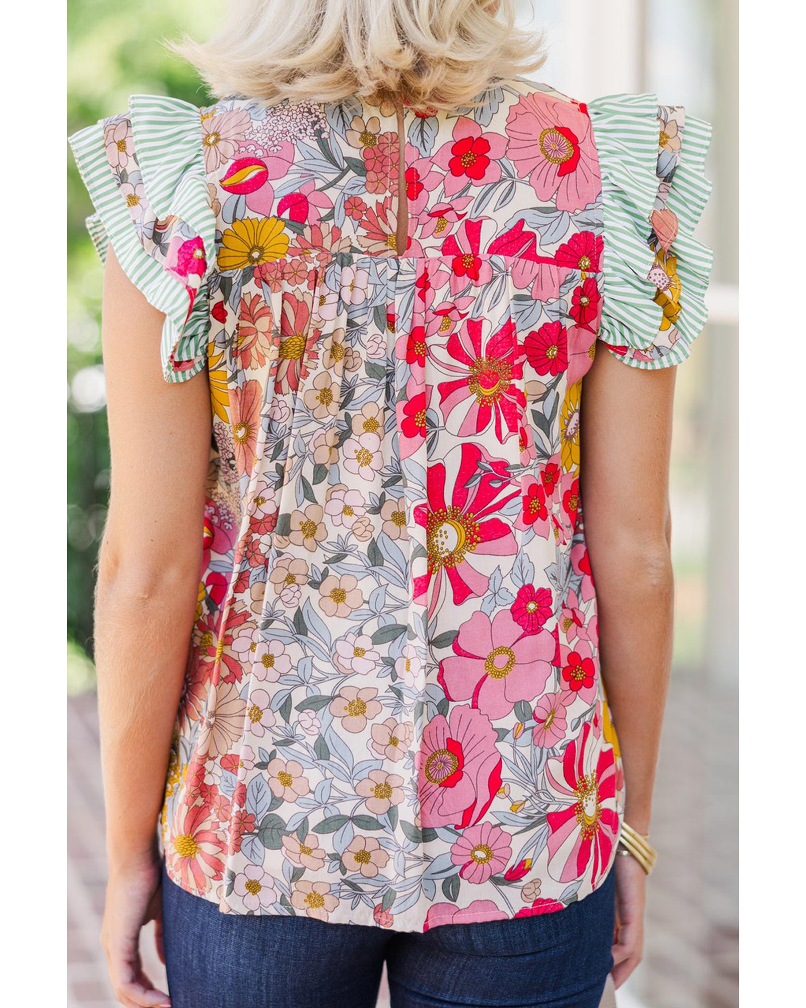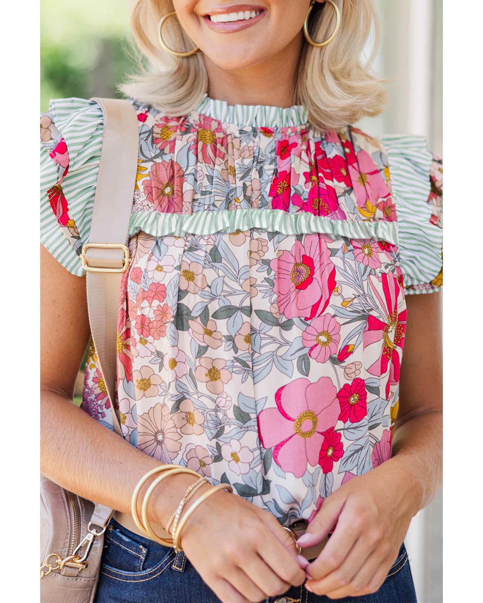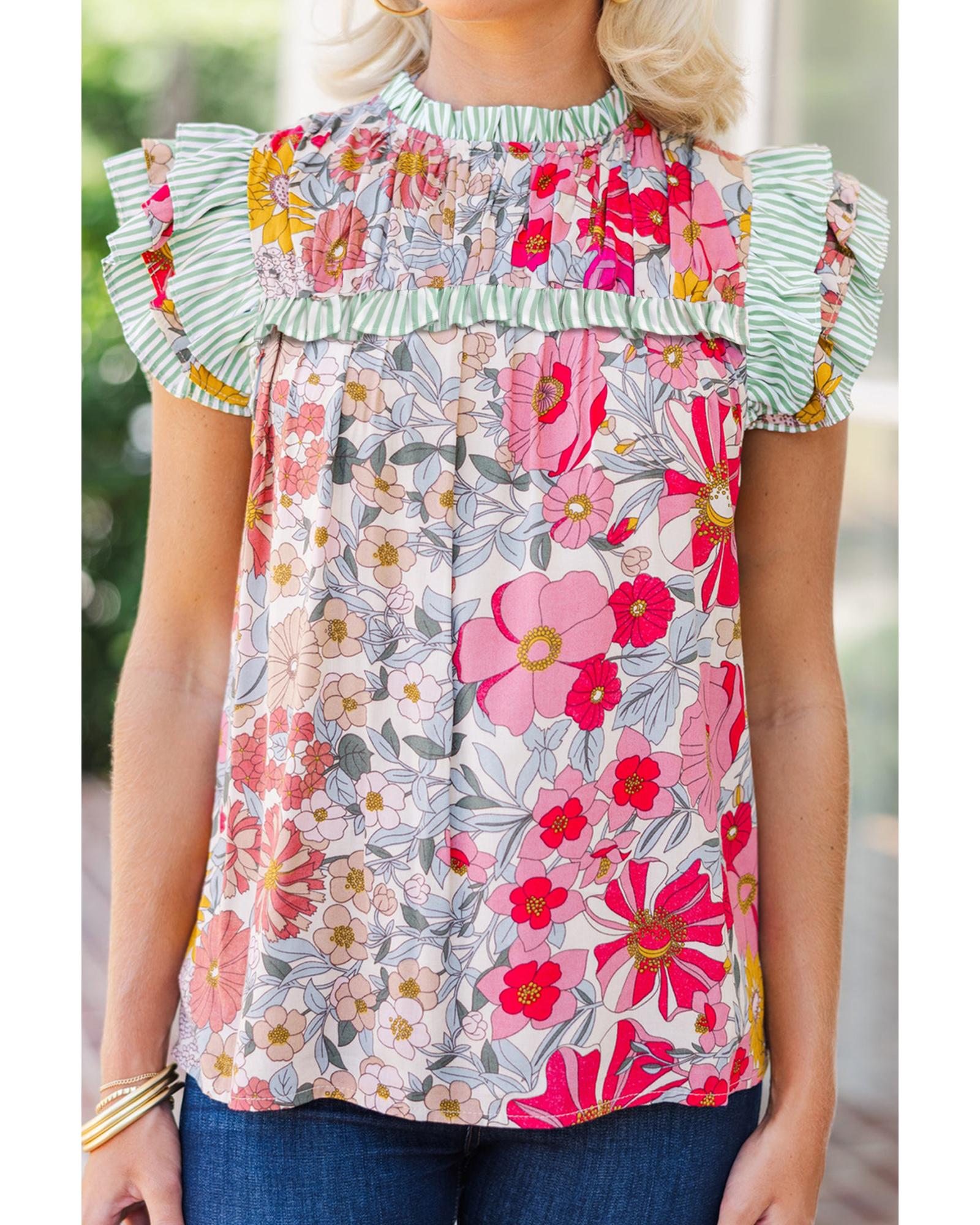 Pink Floral Print Contrast Ruffle Trim Short Sleeve Blouse – M
