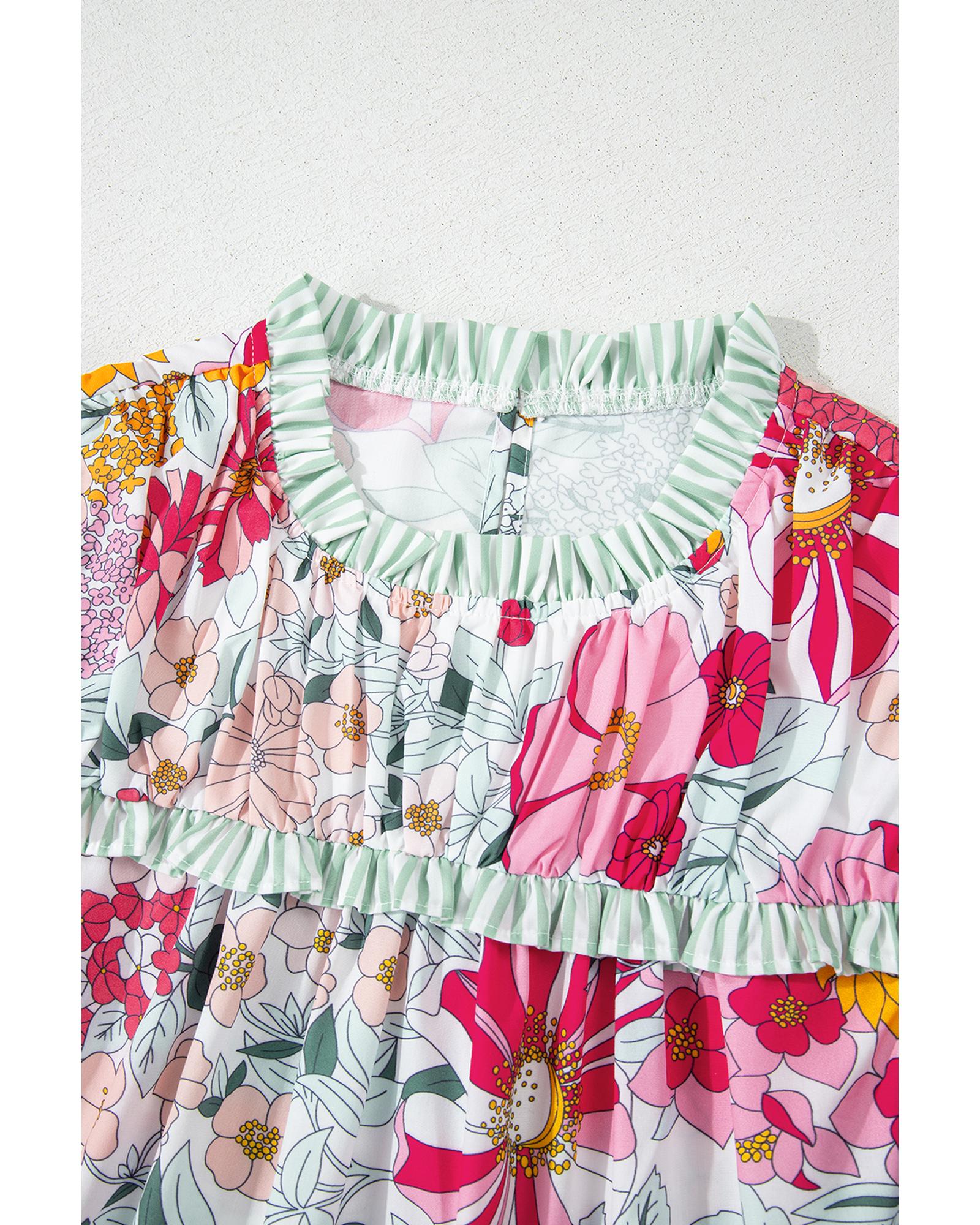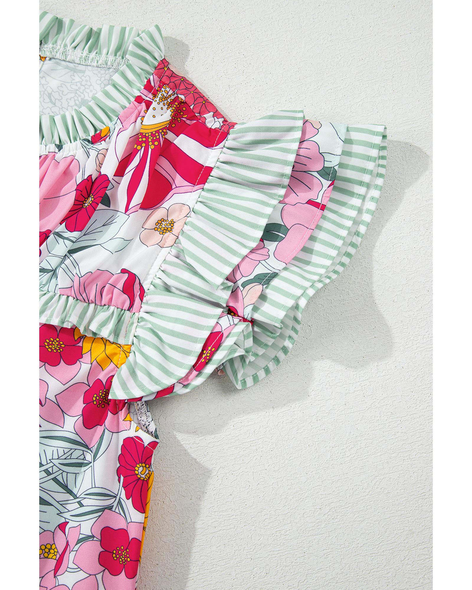 Pink Floral Print Contrast Ruffle Trim Short Sleeve Blouse – S