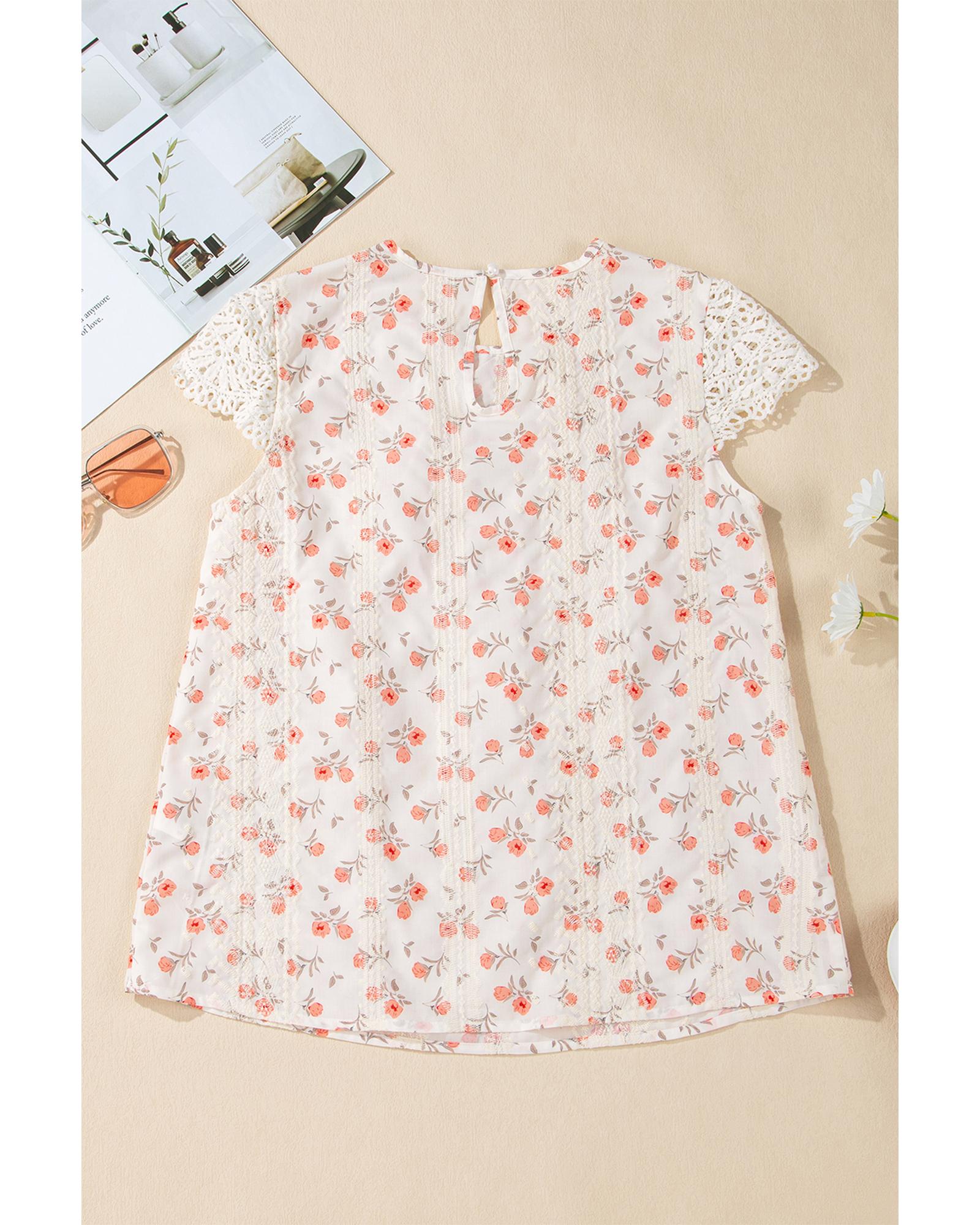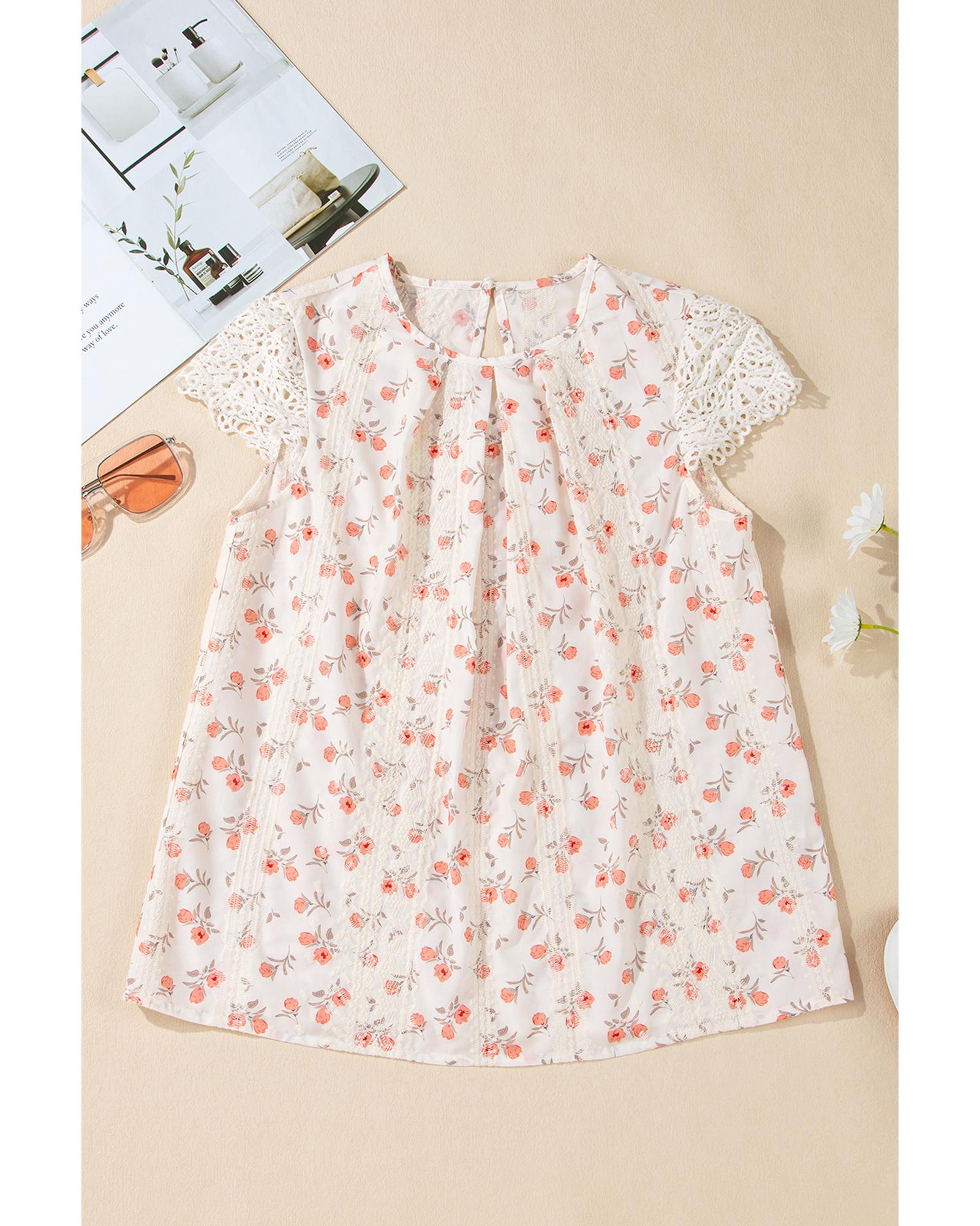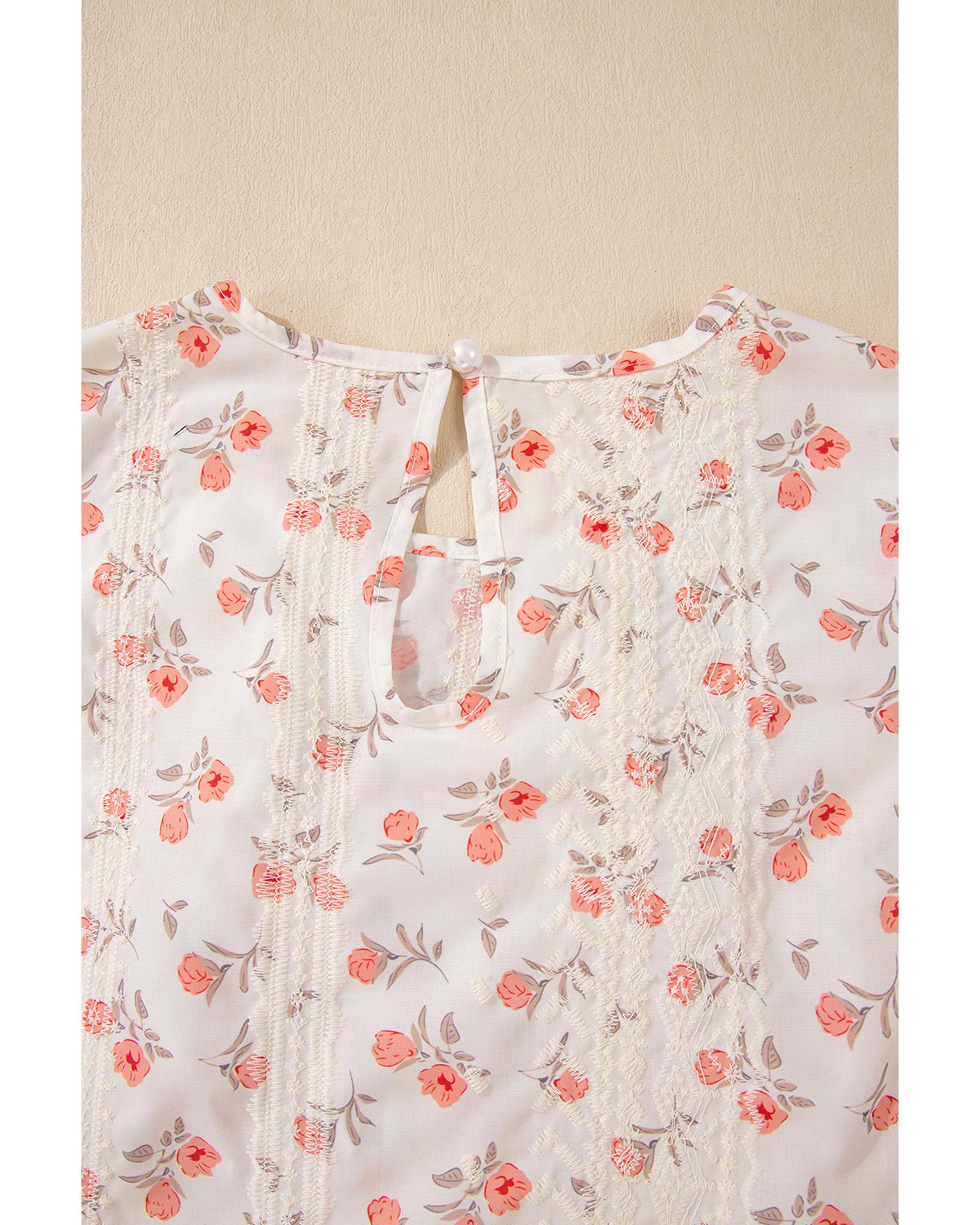 Pink Floral Print Embroidery Detail Crochet Cap Sleeve Blouse – L