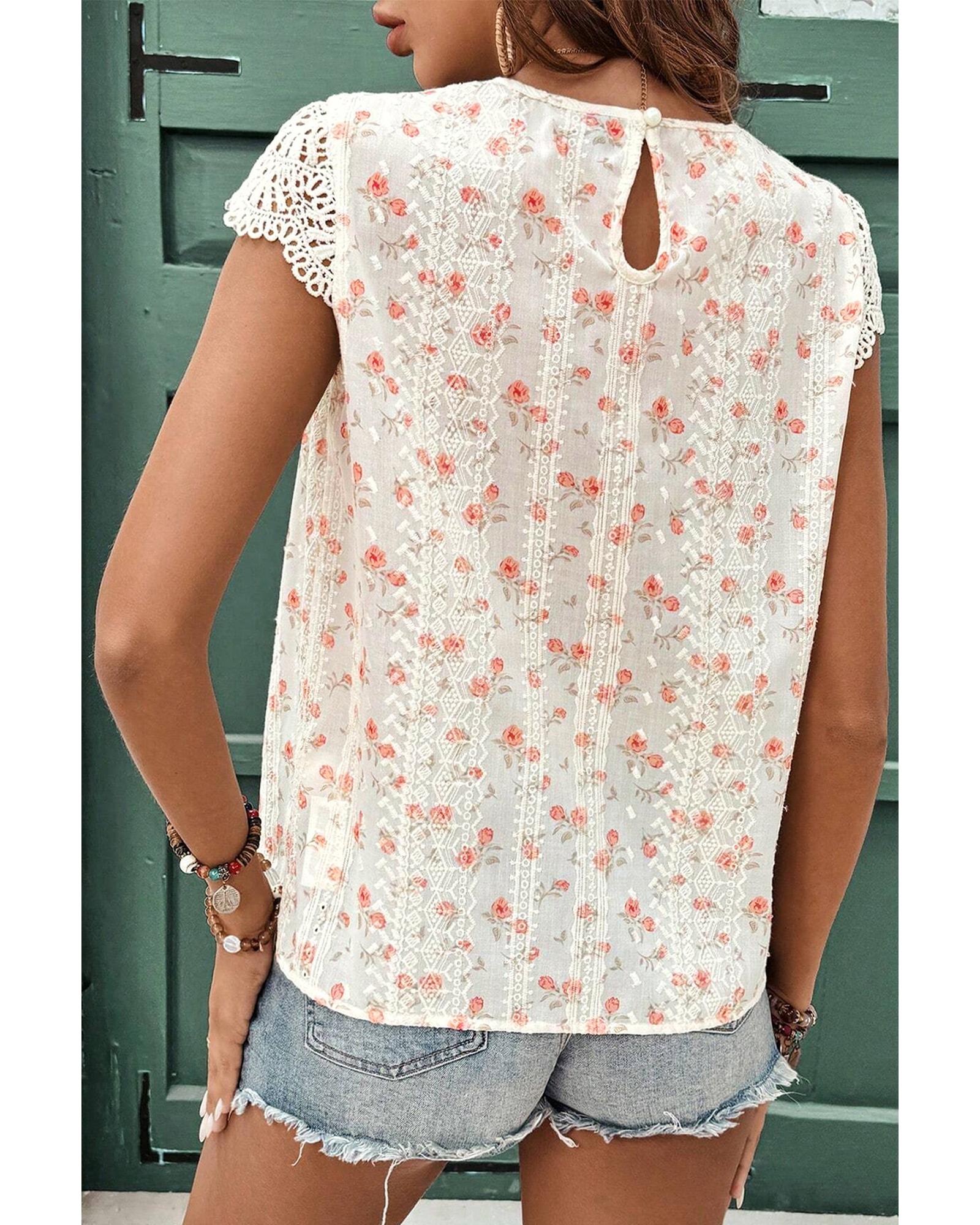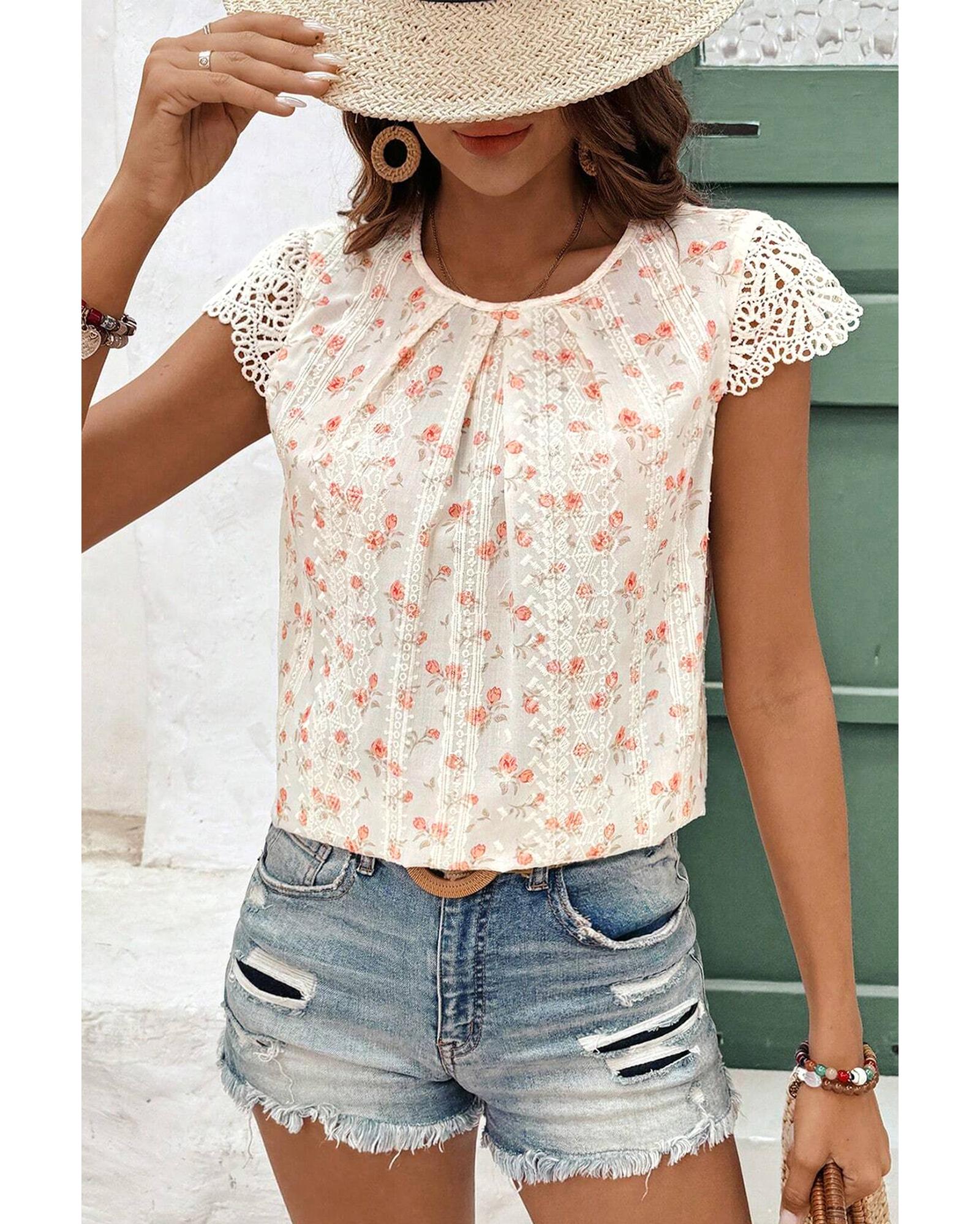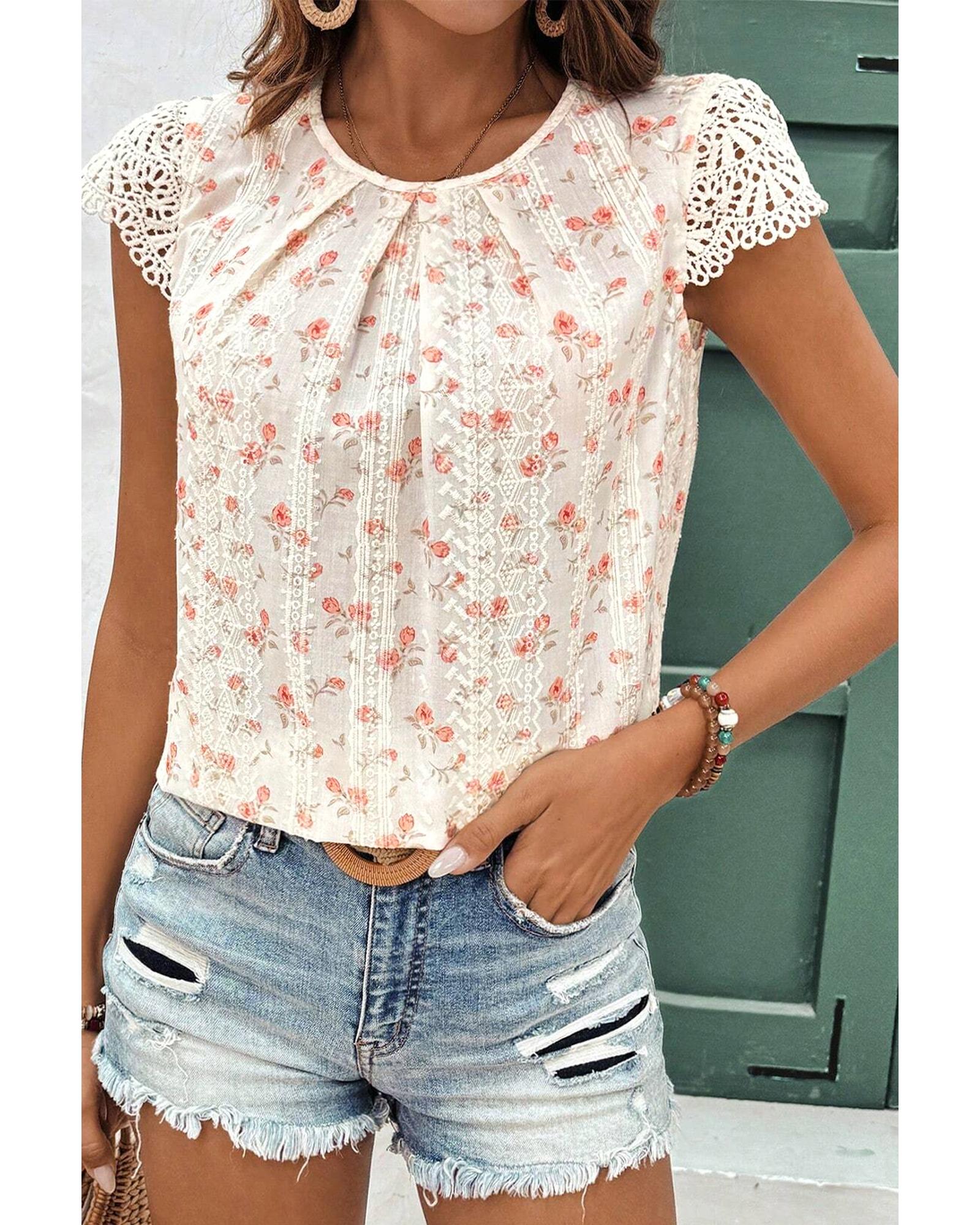 Pink Floral Print Embroidery Detail Crochet Cap Sleeve Blouse – L