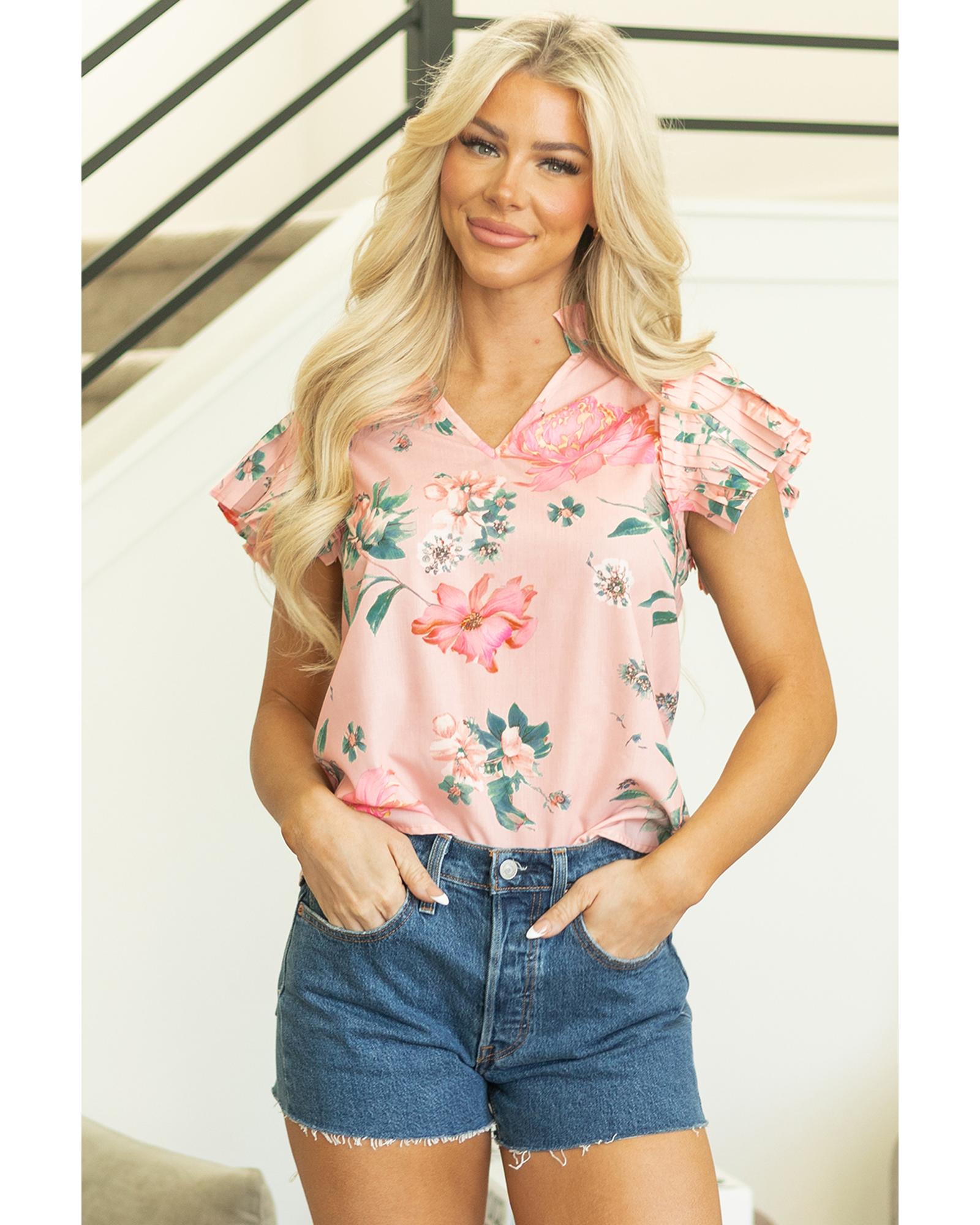 Pink Floral Print Frilled V Neck Pleated Sleeve Blouse – M