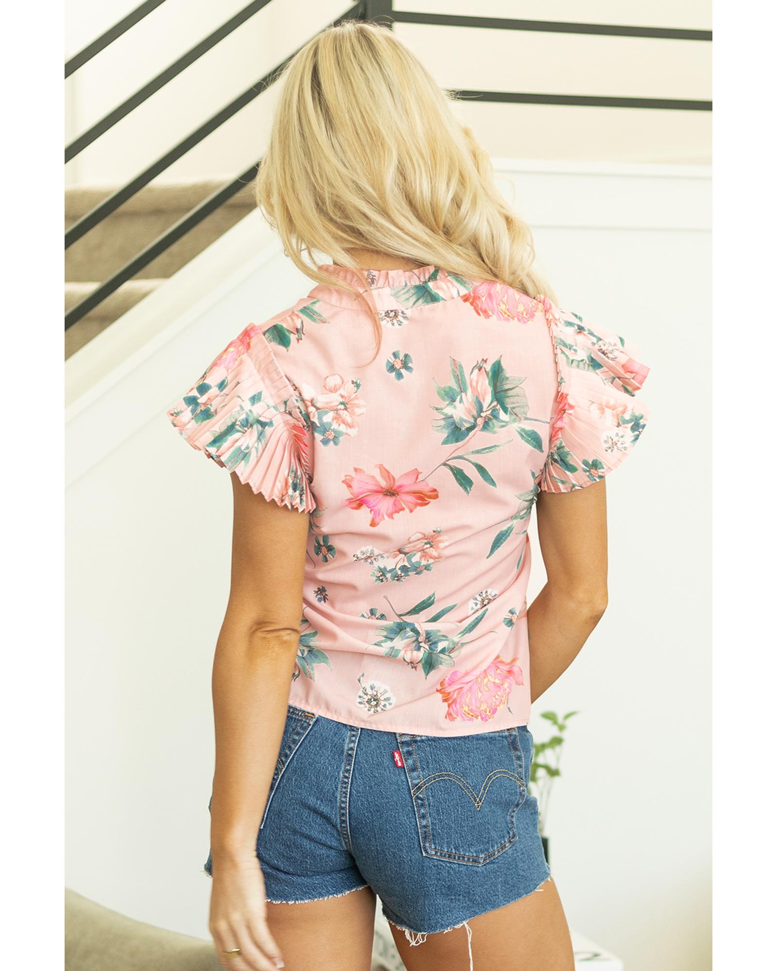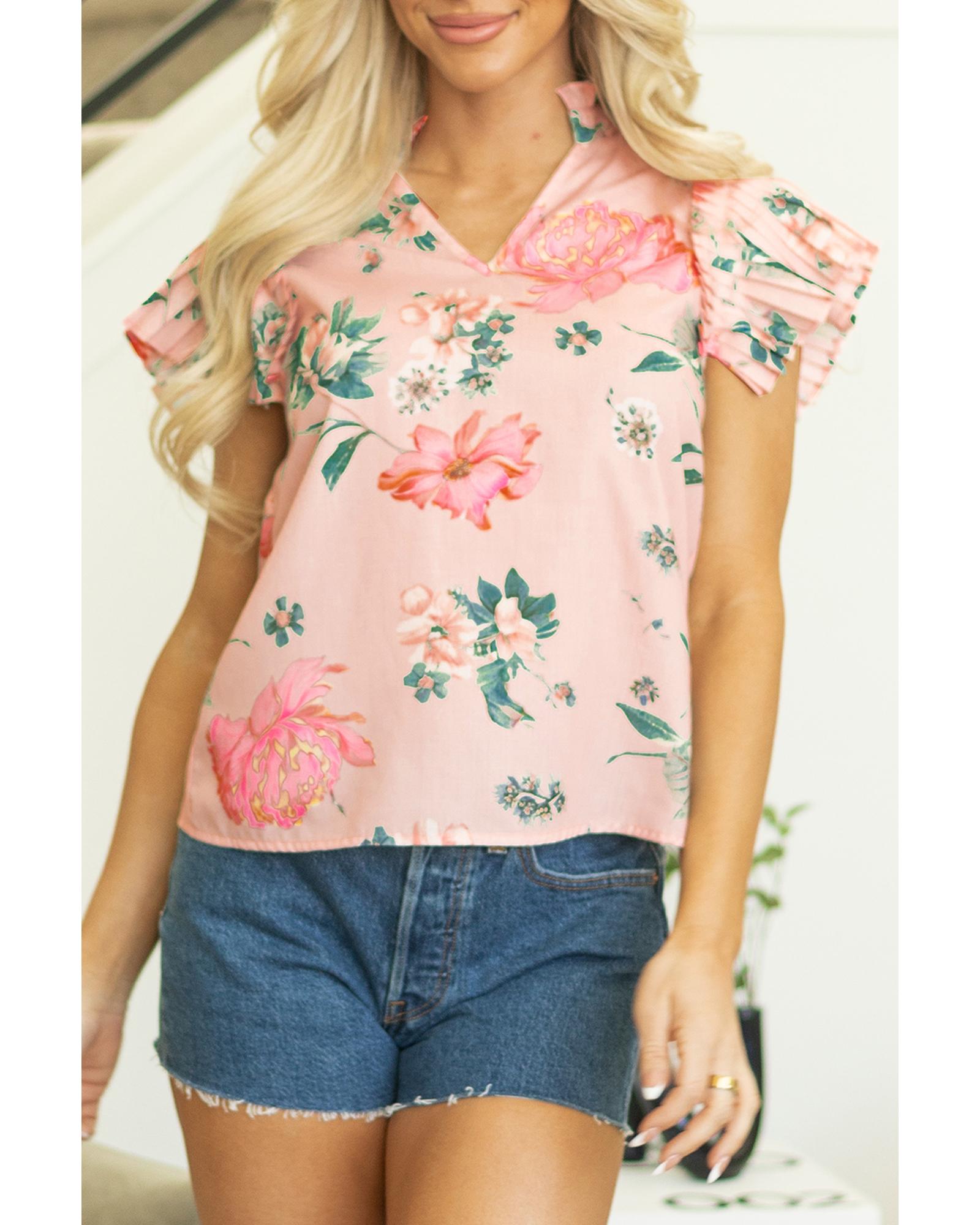 Pink Floral Print Frilled V Neck Pleated Sleeve Blouse – S