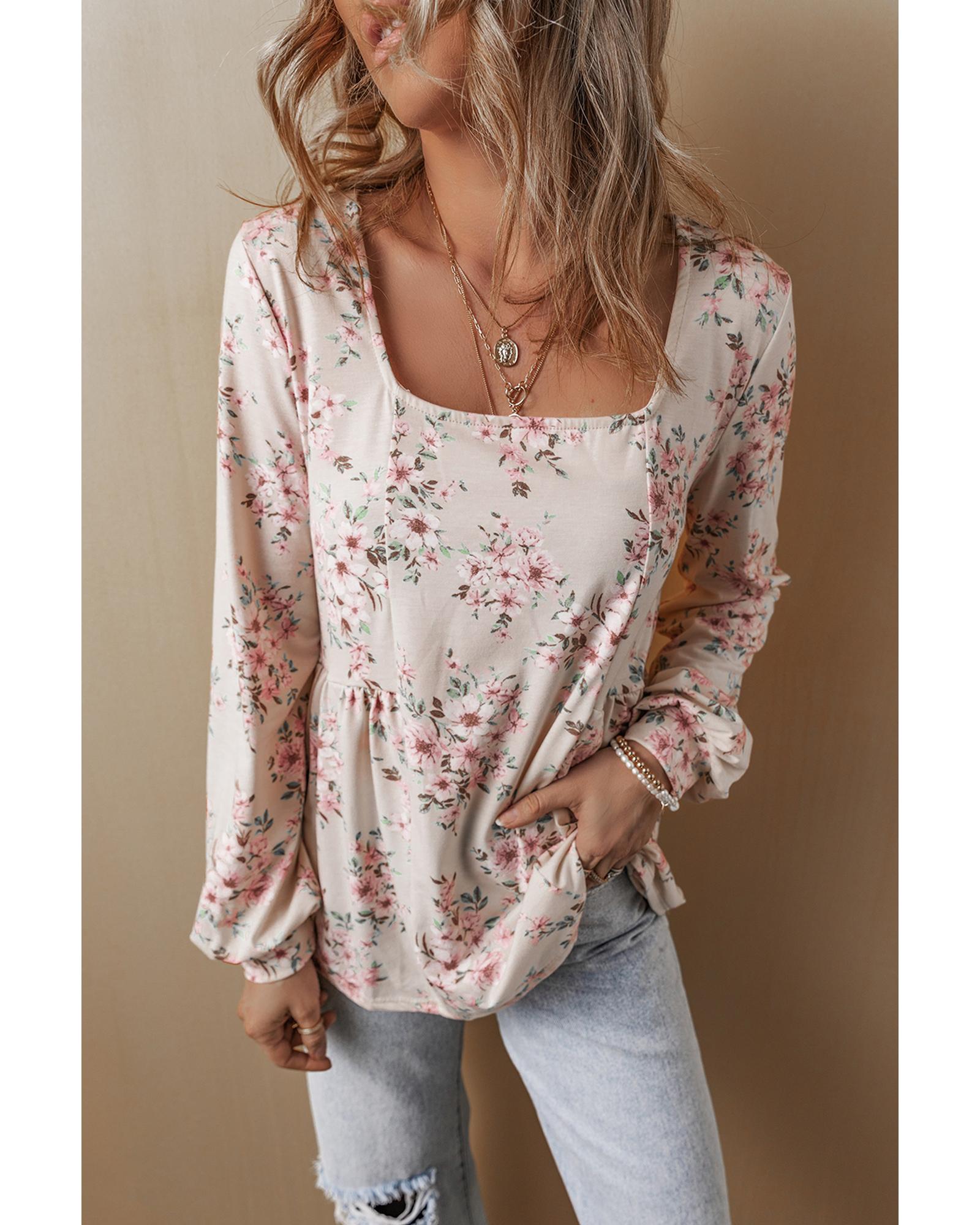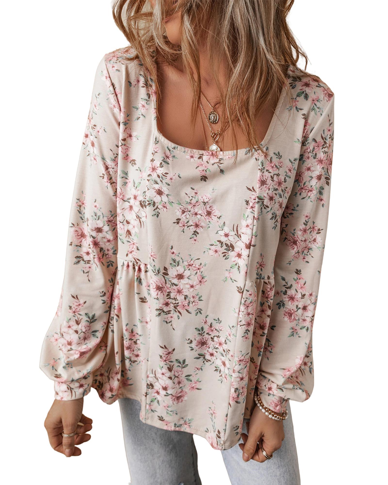 Pink Floral Print Pleated U Neck Loose Fit Blouse – XL