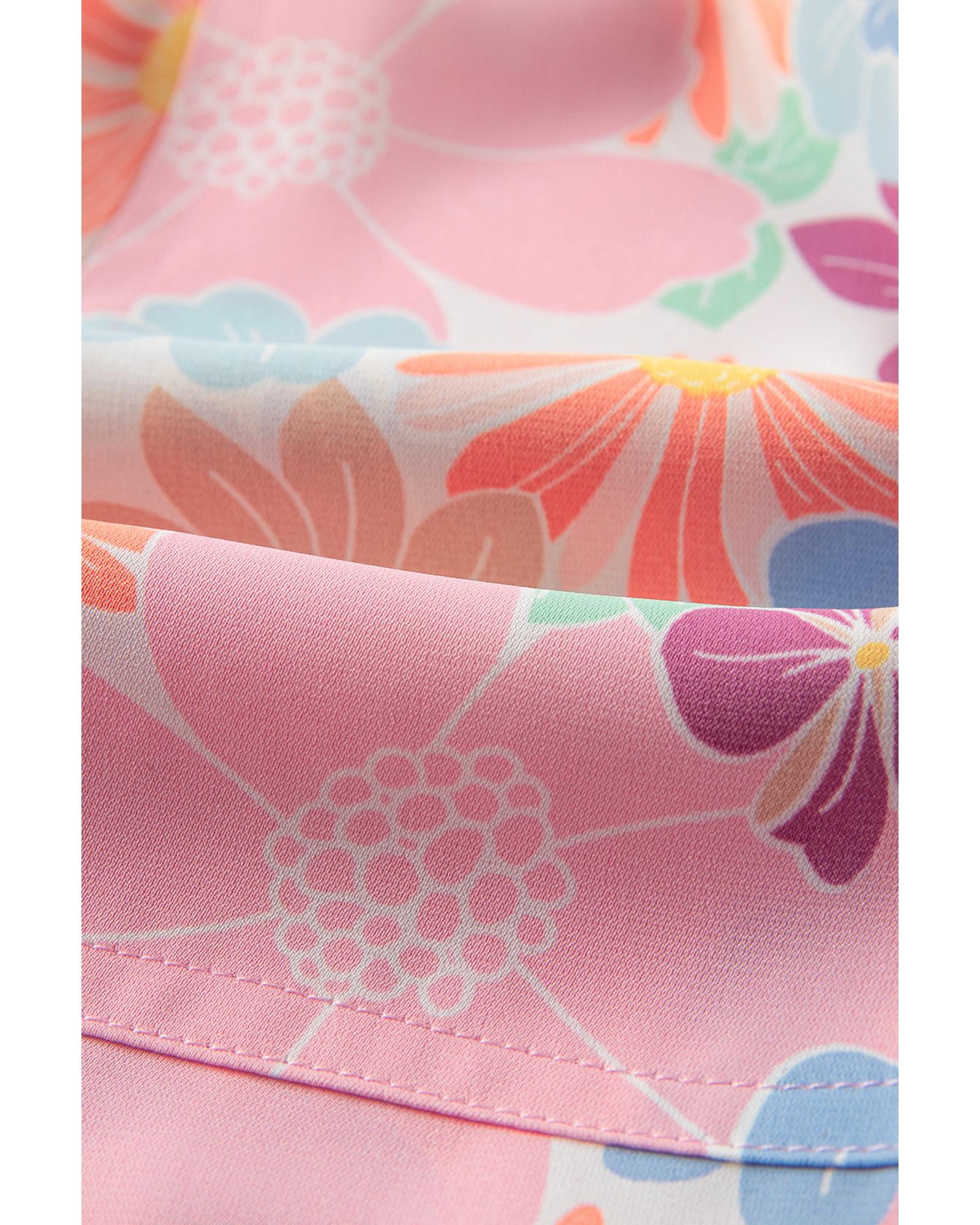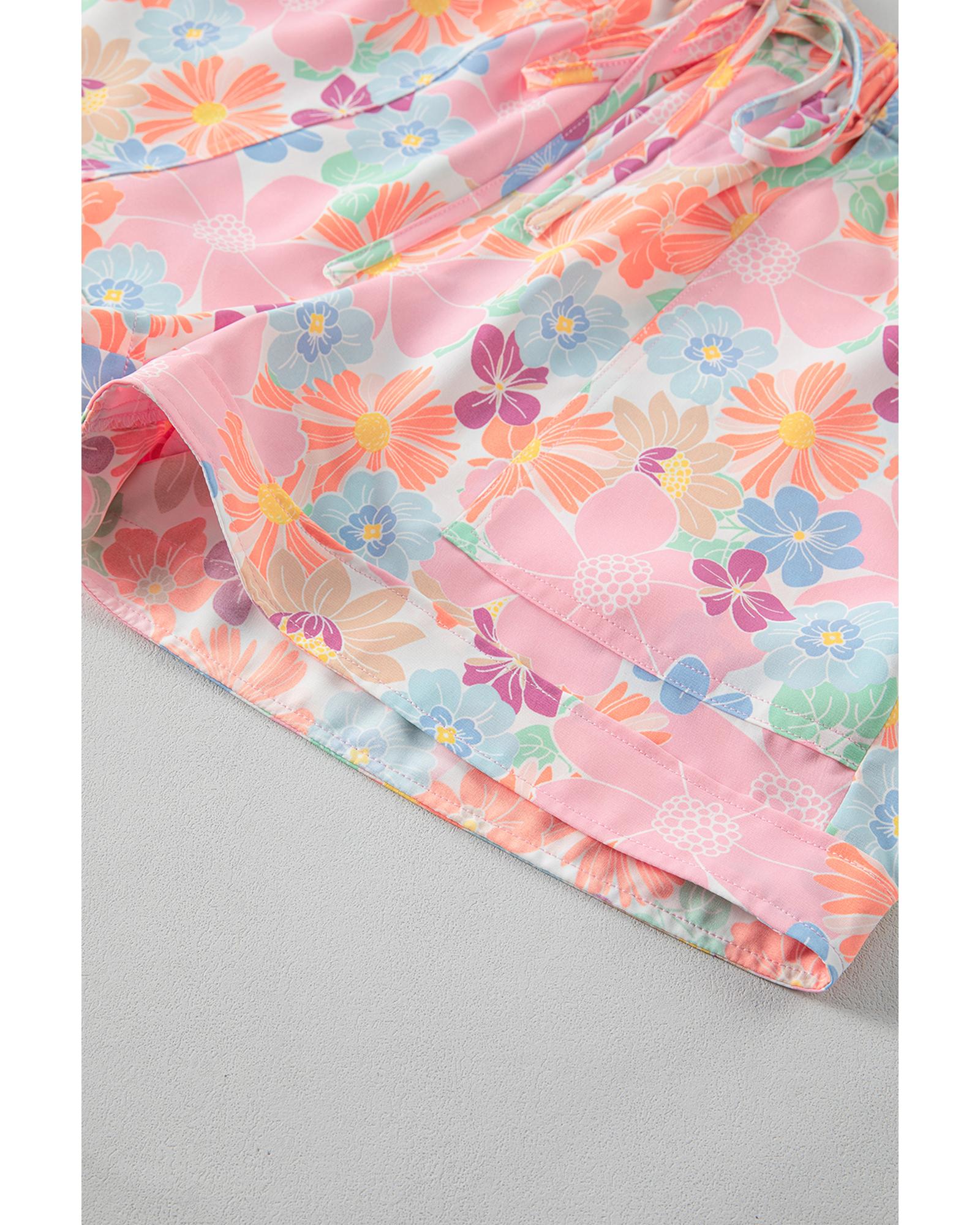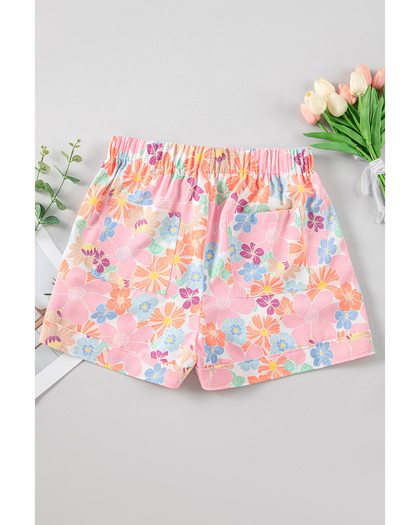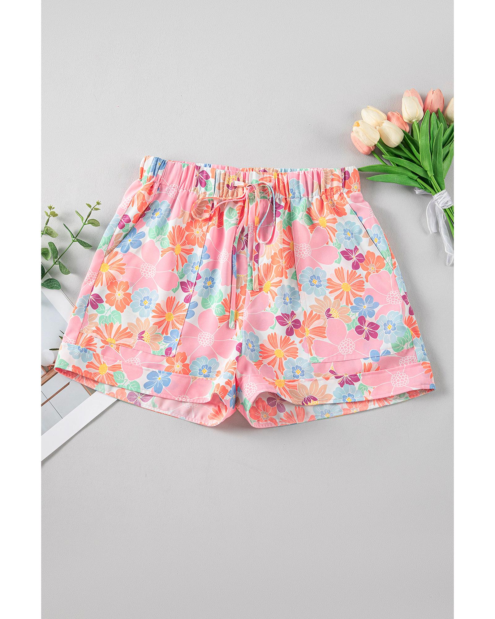 Pink Floral Print Side Pockets Drawstring Casual Shorts – L