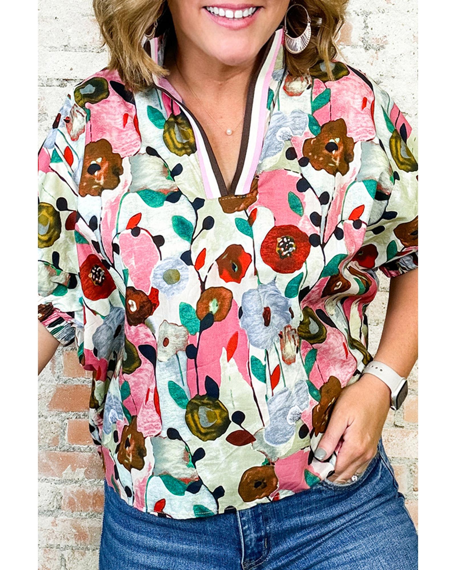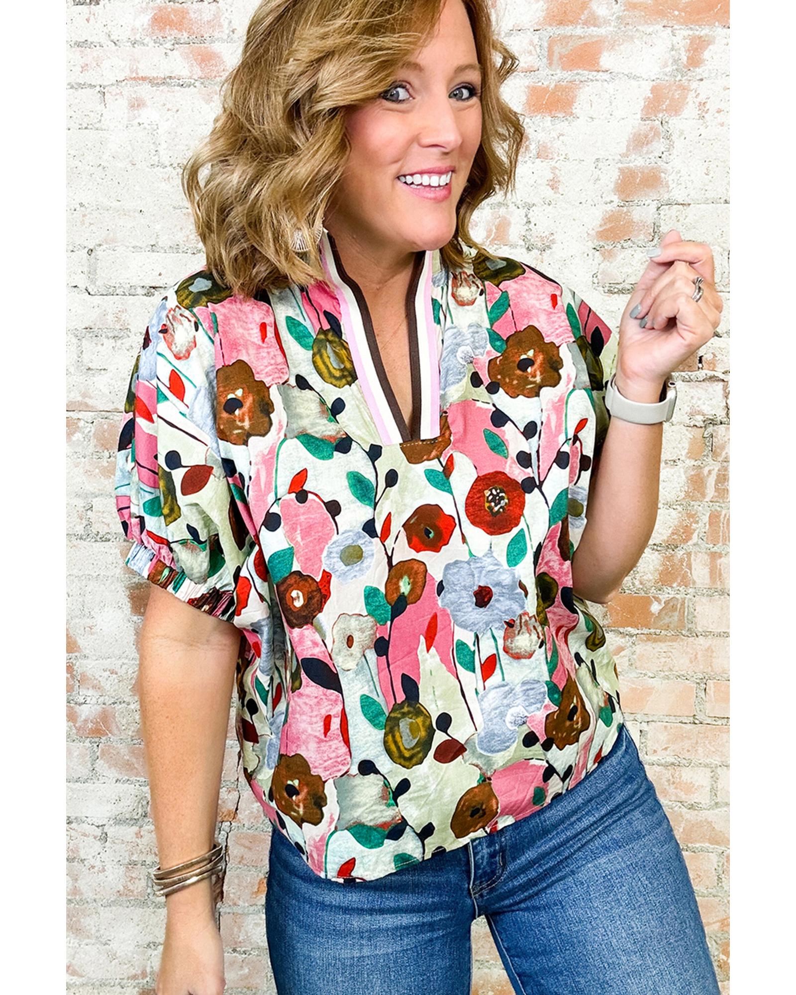 Pink Floral Print Slit V Neck Short Sleeve Blouse – M