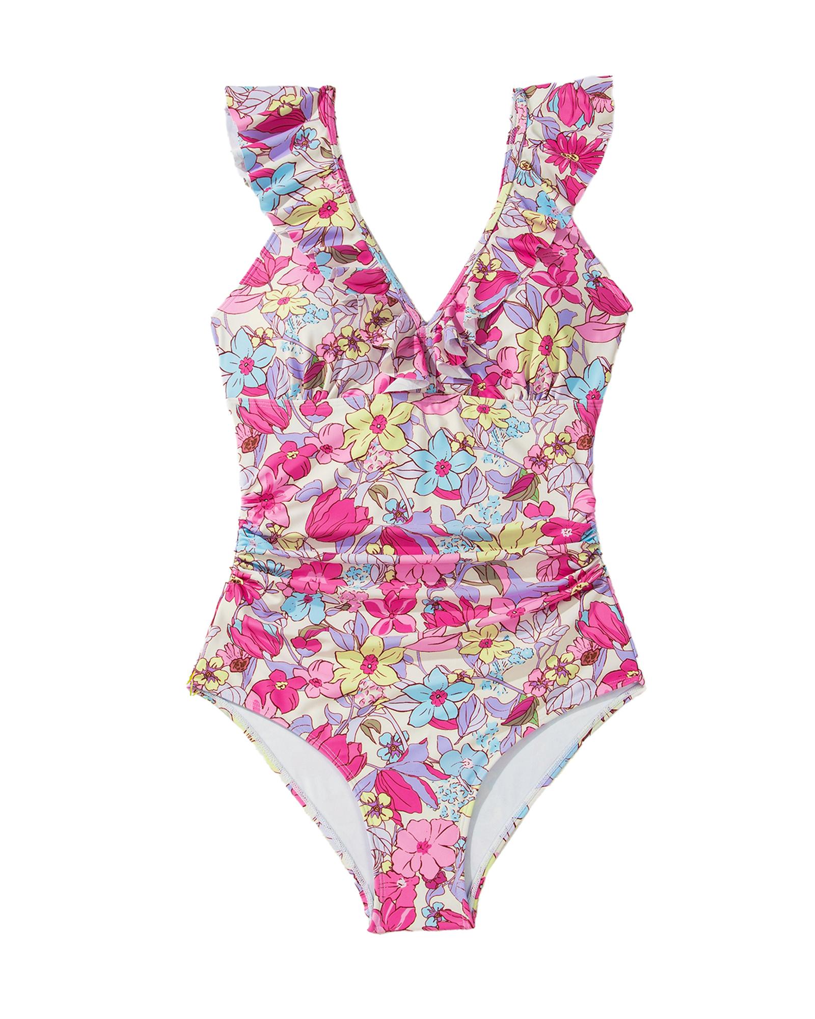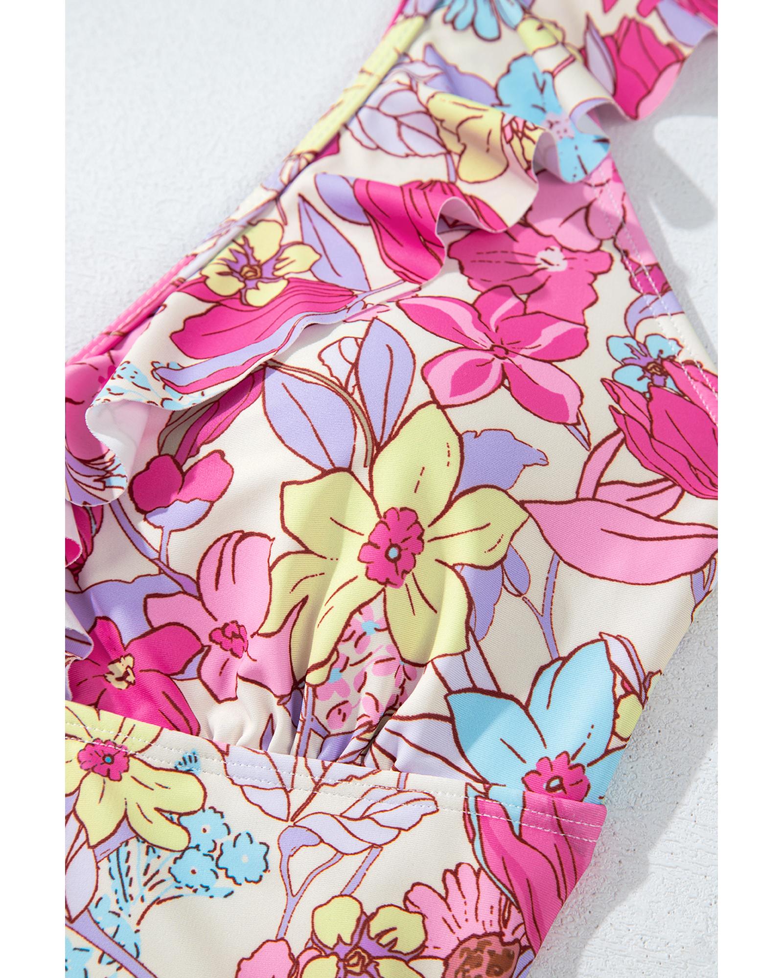 Pink Floral Ruffle Trim V Neck Lace-up Back Tummy Control One Piece Swimsuit – S