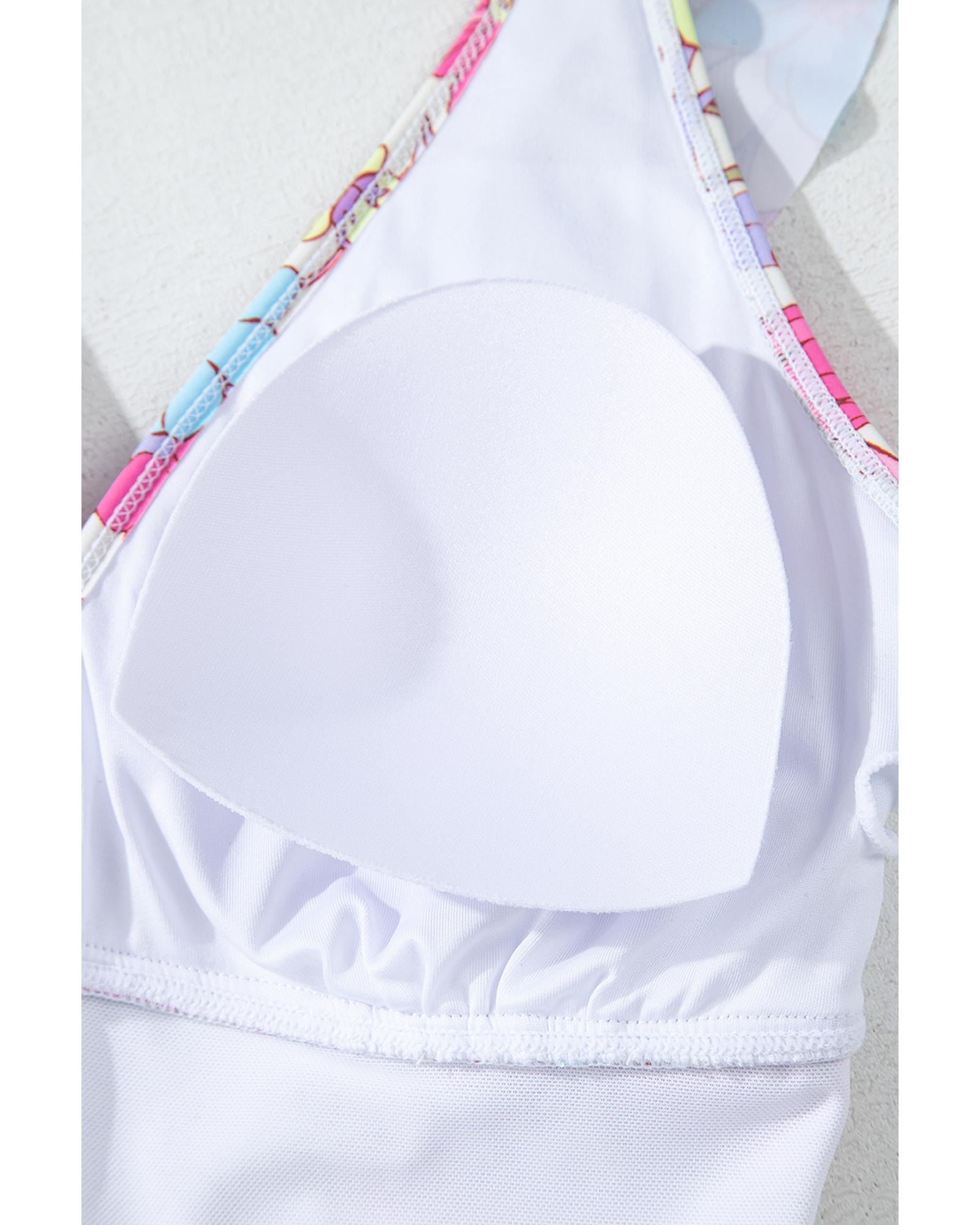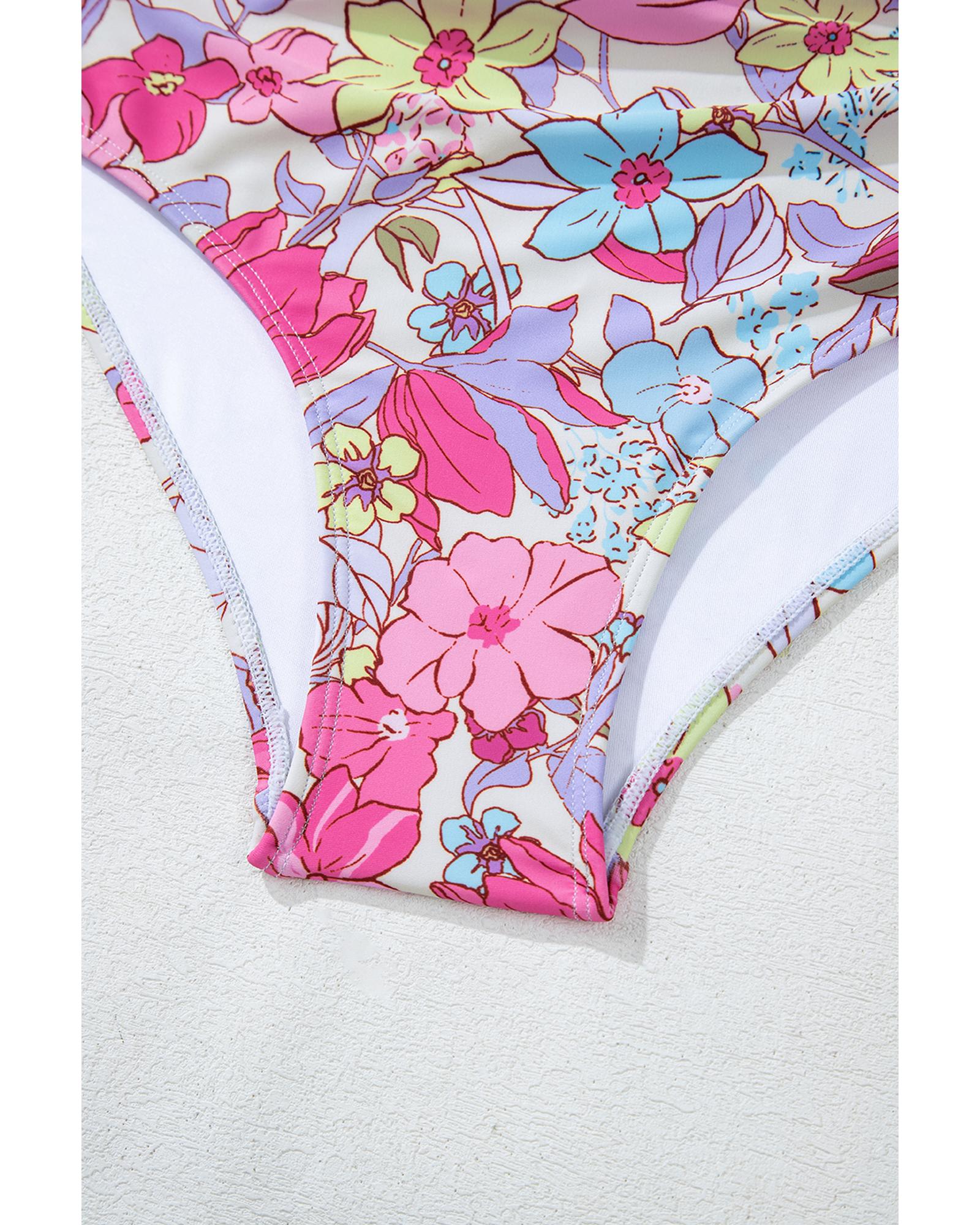 Pink Floral Ruffle Trim V Neck Lace-up Back Tummy Control One Piece Swimsuit – XL