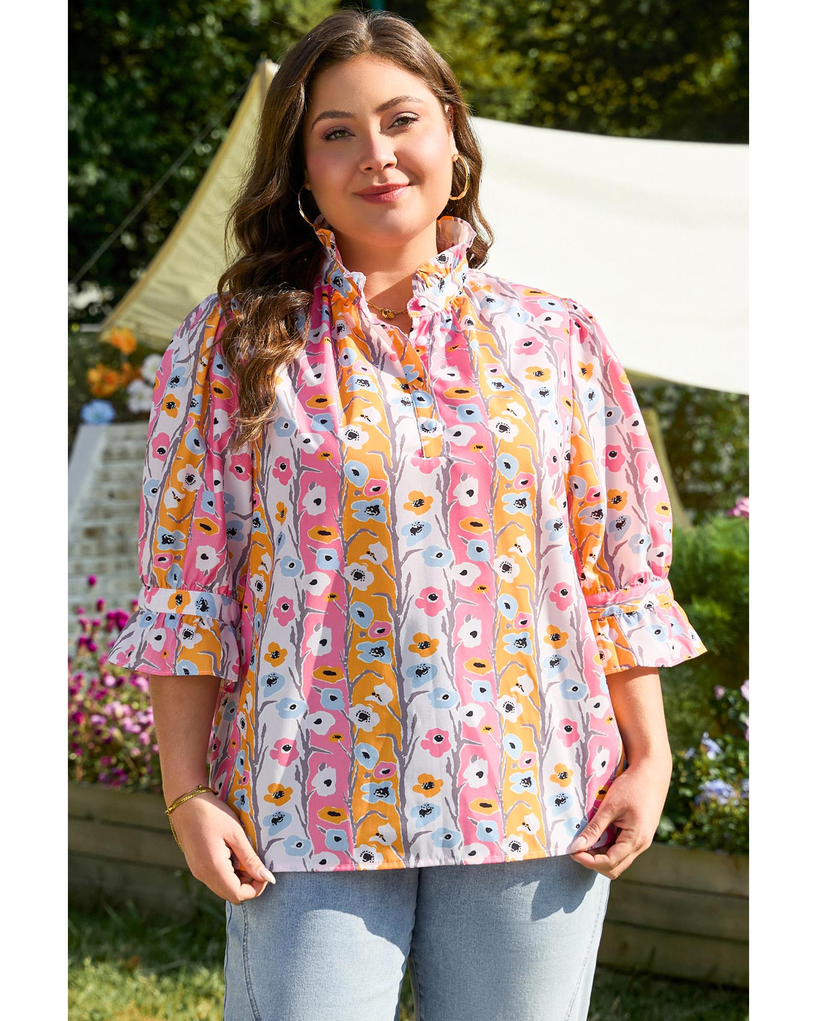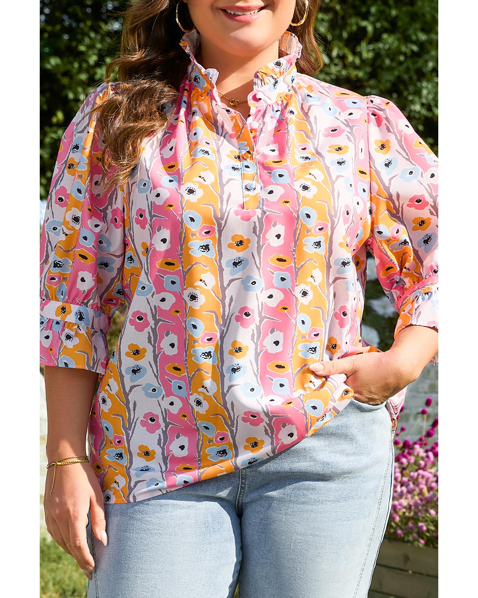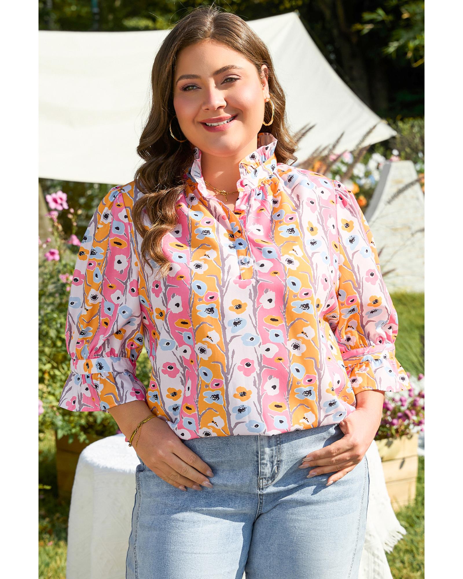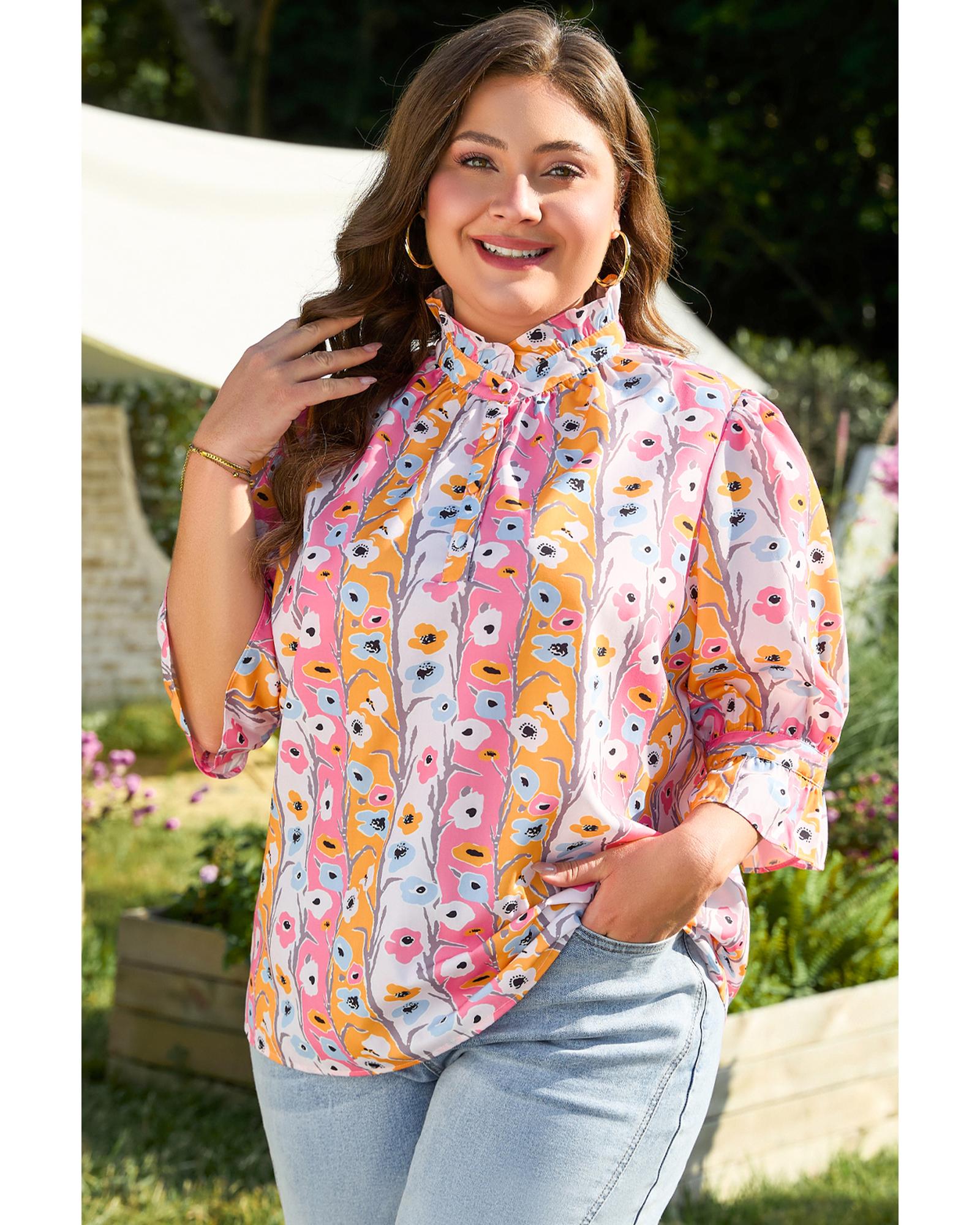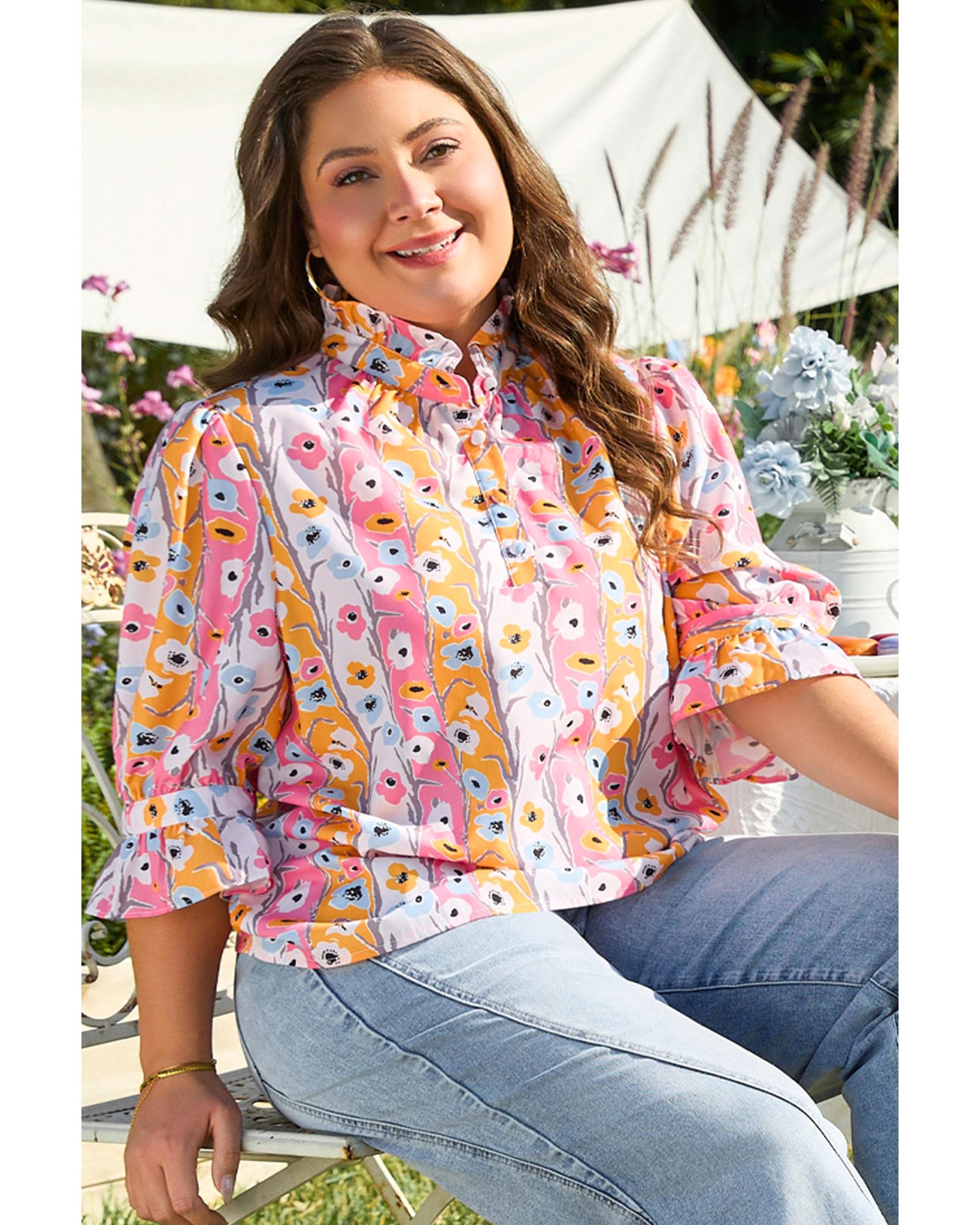 Pink Floral Ruffled Collar Bracelet Sleeve Plus Size Blouse Top – 4X
