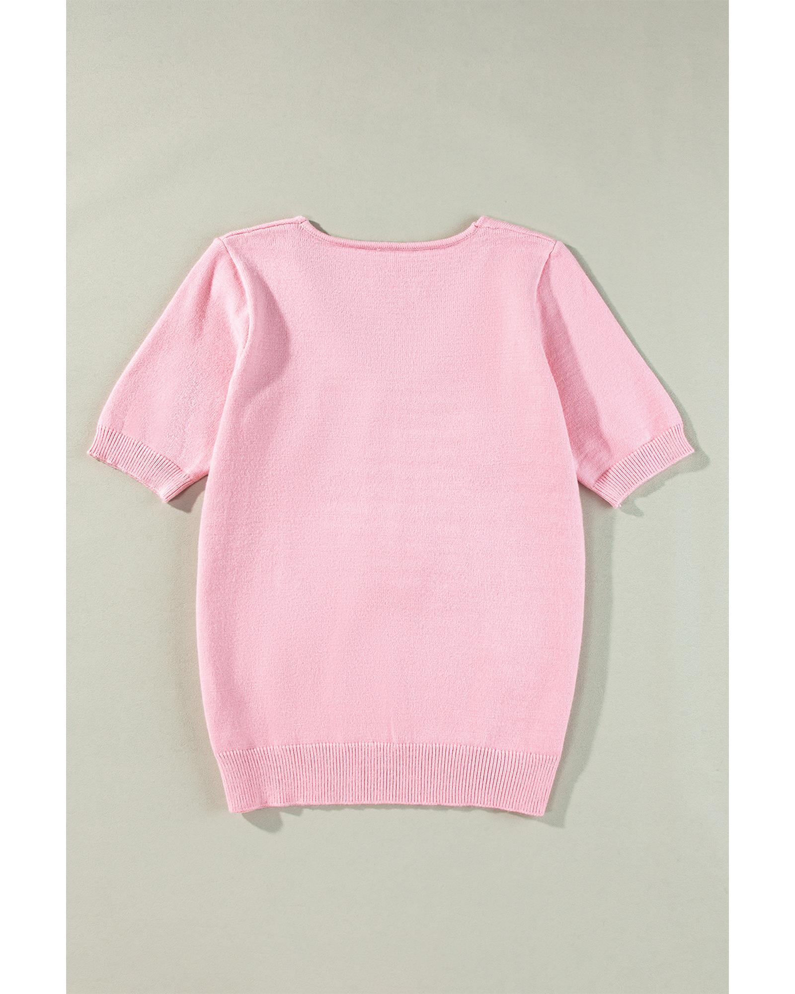 - Pink Flower Crochet V Neck Short Sleeve Sweater