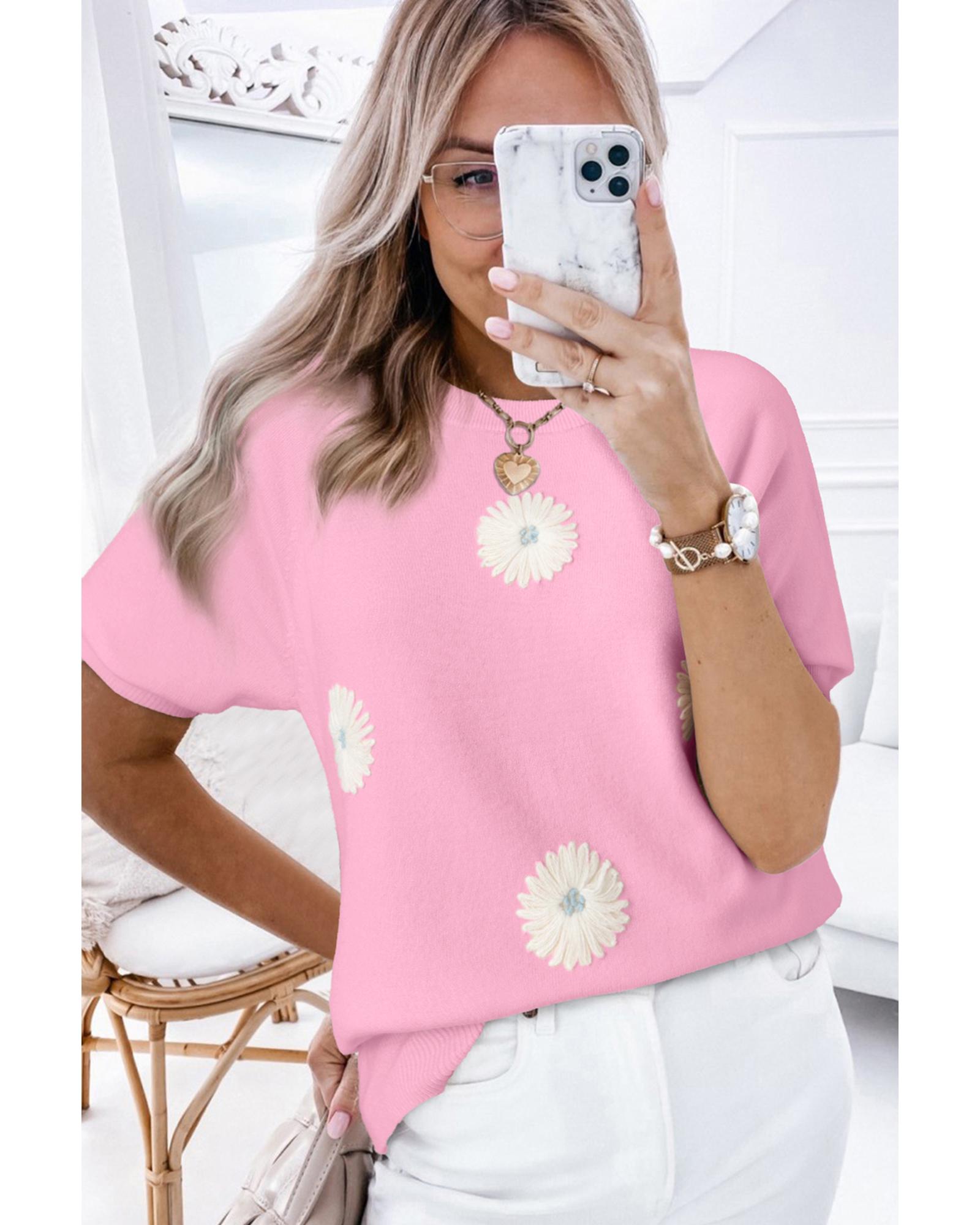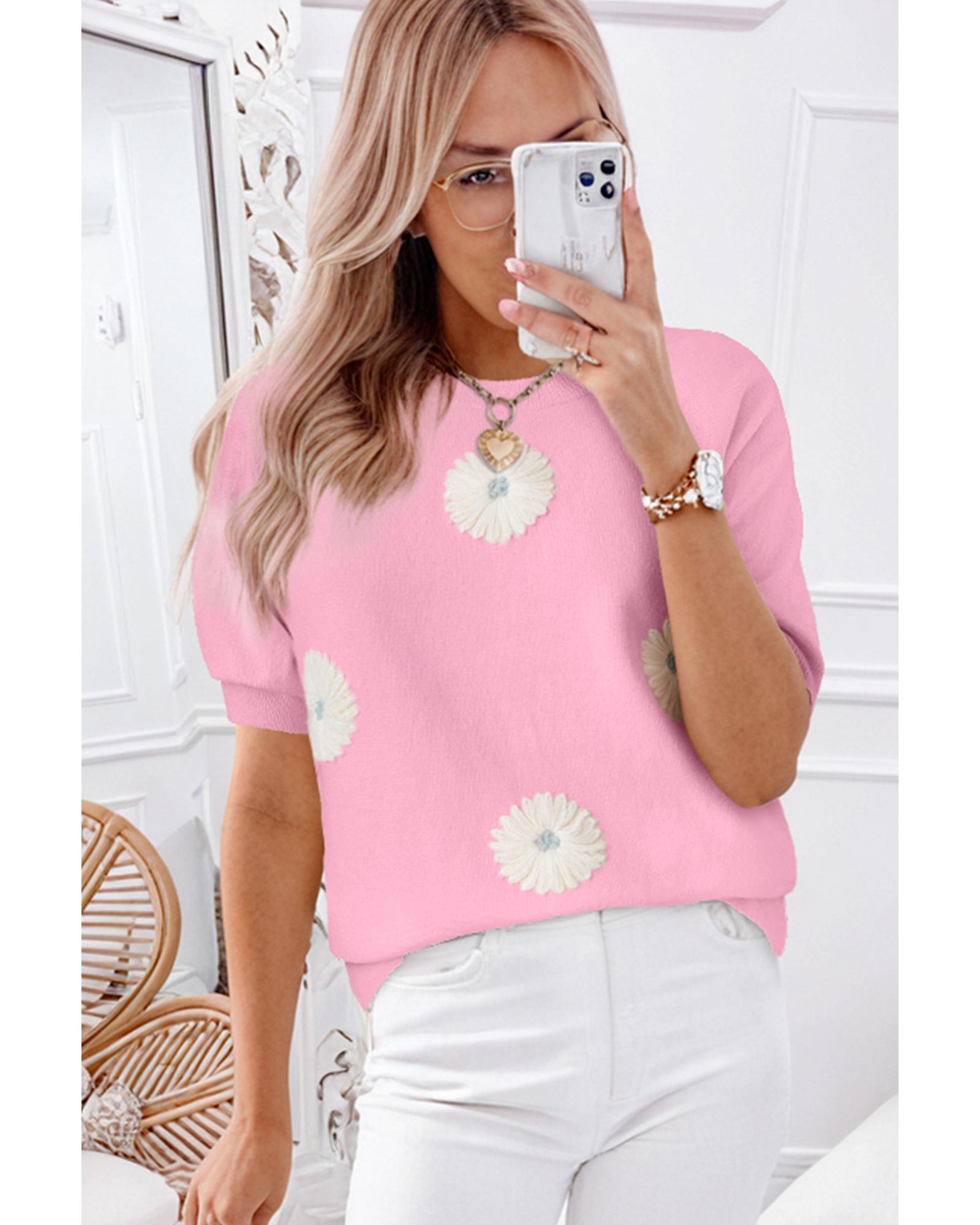 Pink Flower Pattern Short Sleeve Knitted Top – S