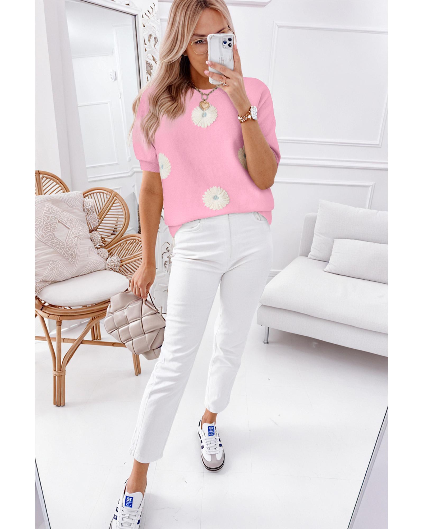 Pink Flower Pattern Short Sleeve Knitted Top – XL