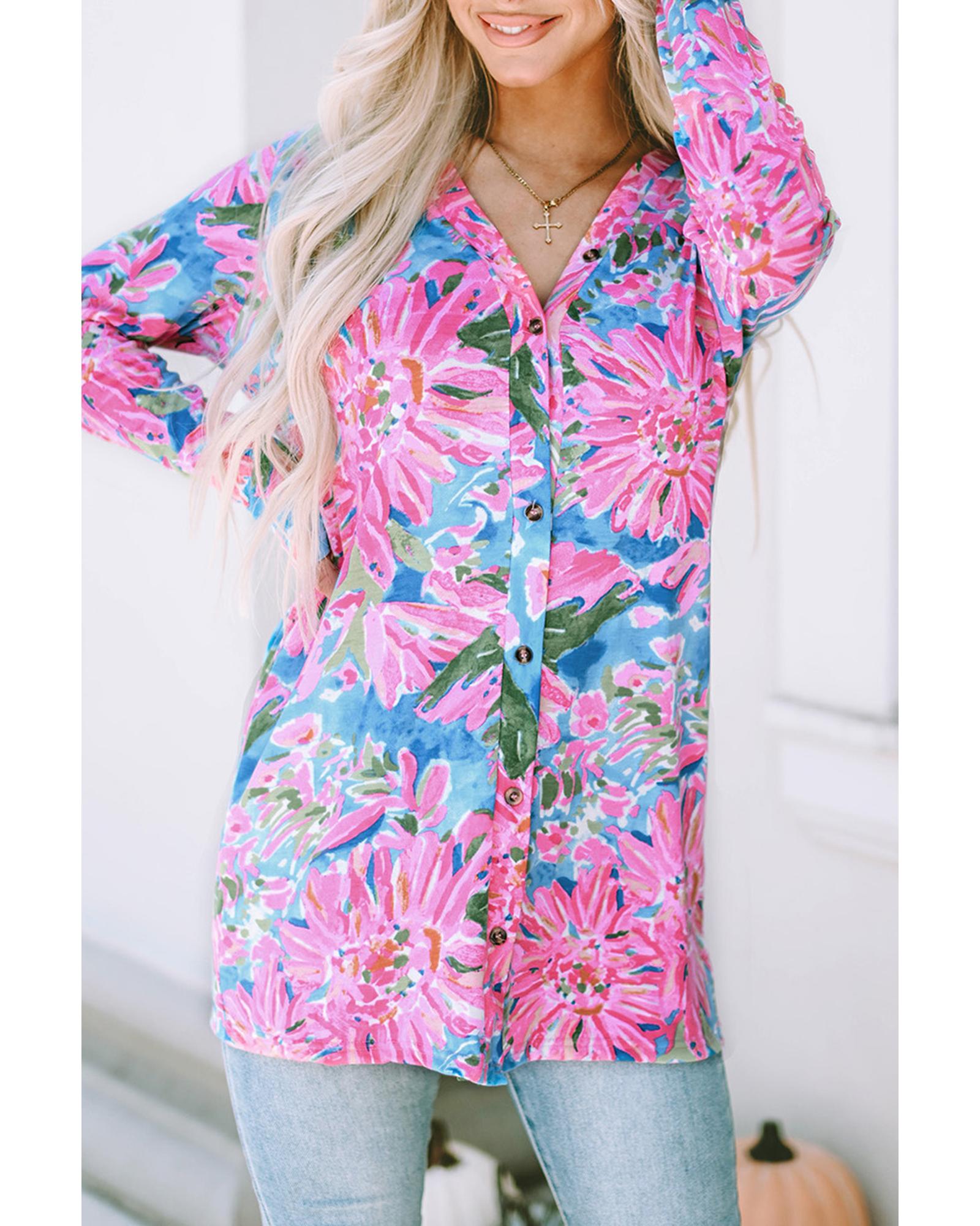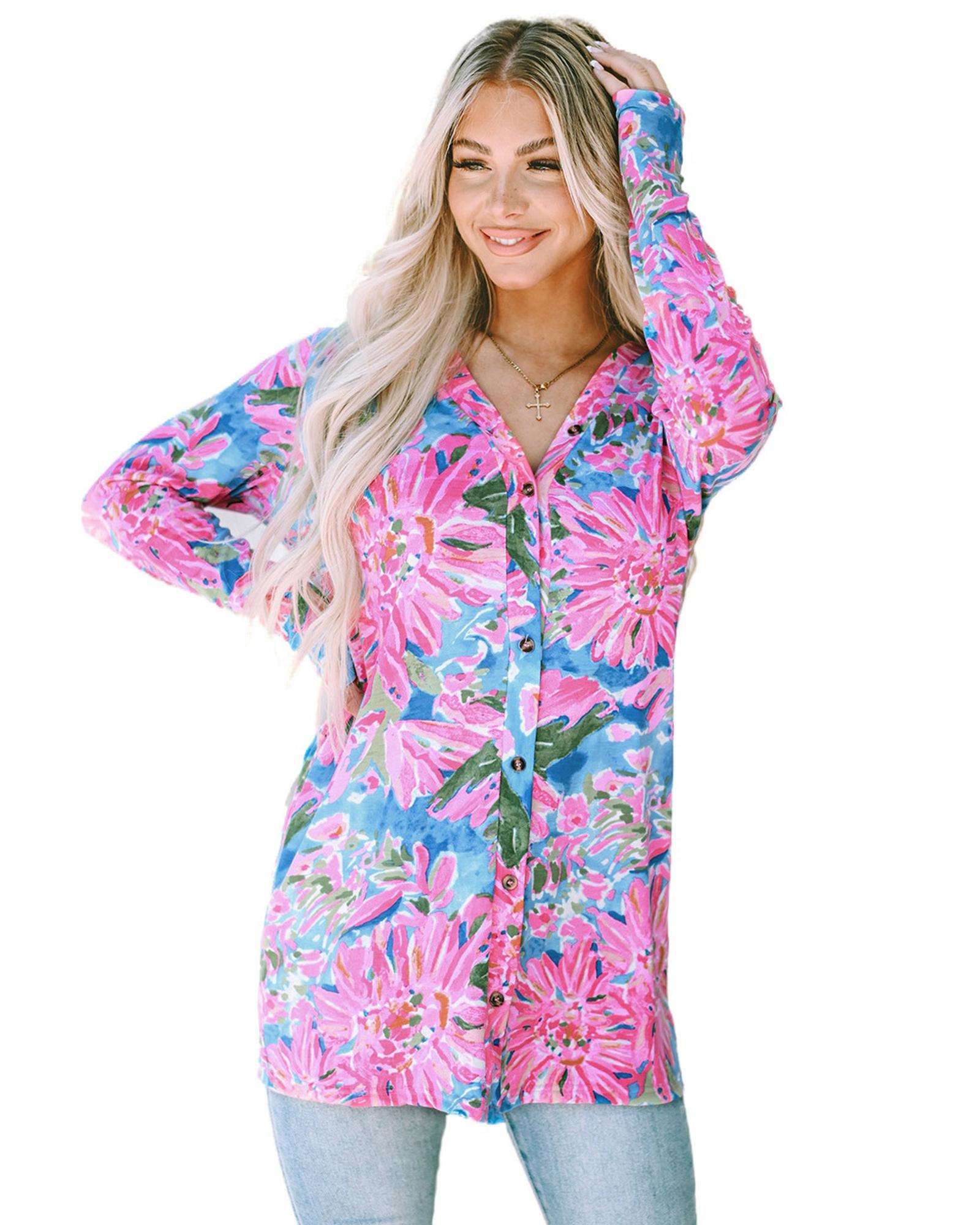 Pink Flower Print Long Sleeve Button Up Cardigan – S