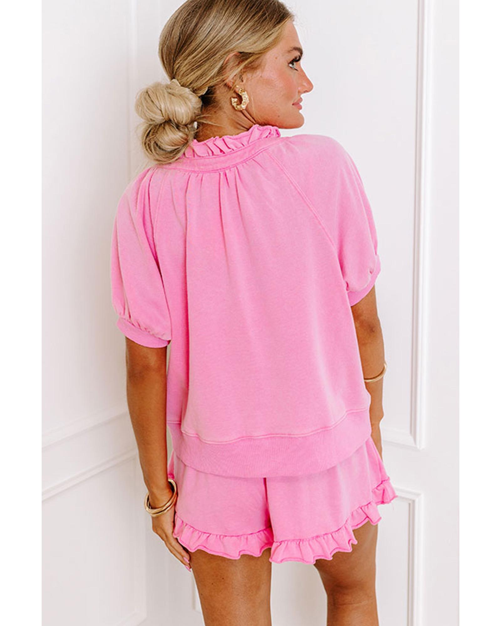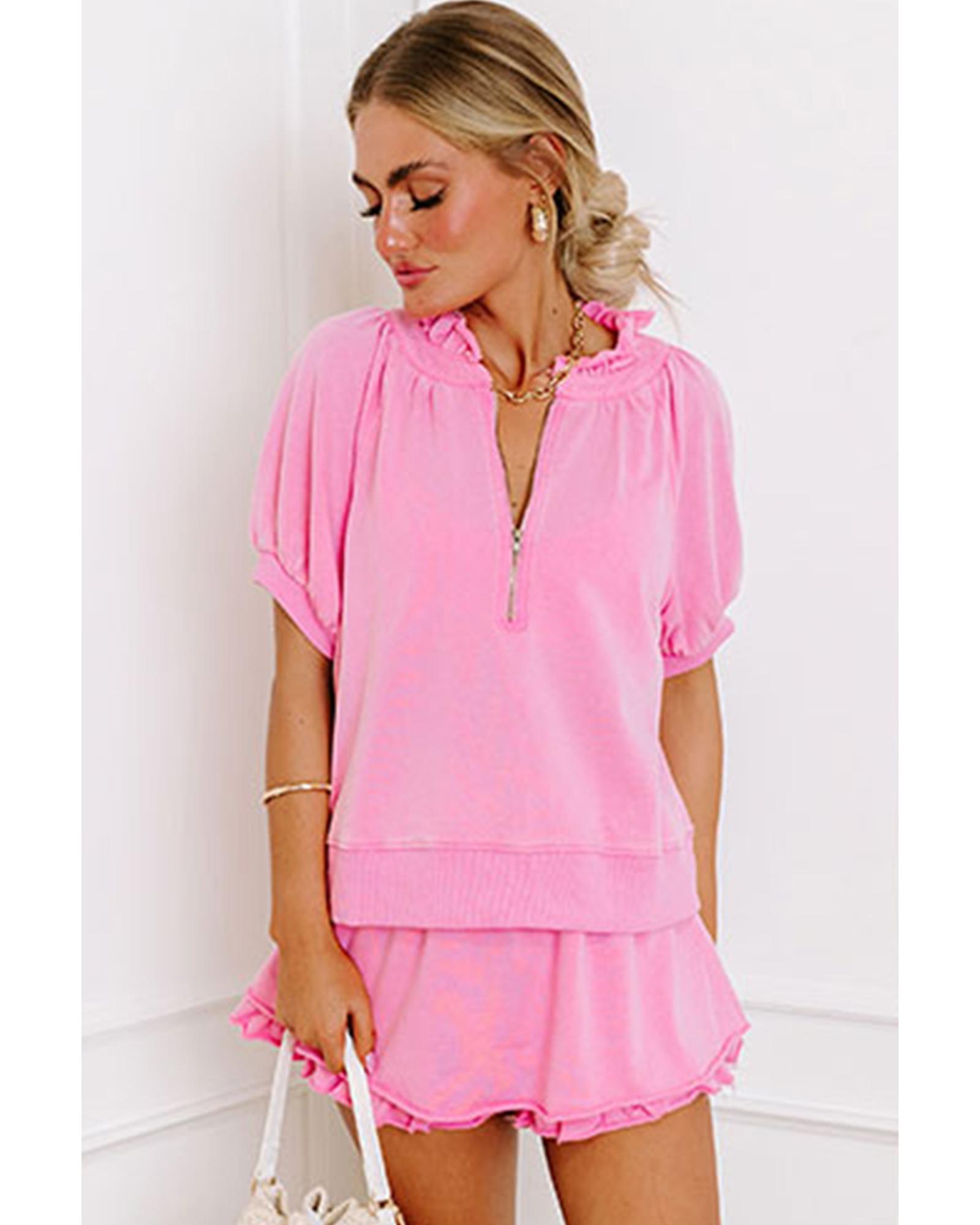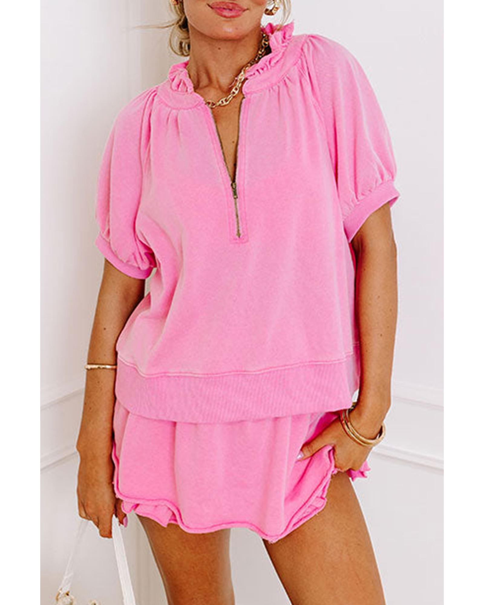 - Chic Pink Half Zip Puff Sleeve Top and Ruffled Shorts Set