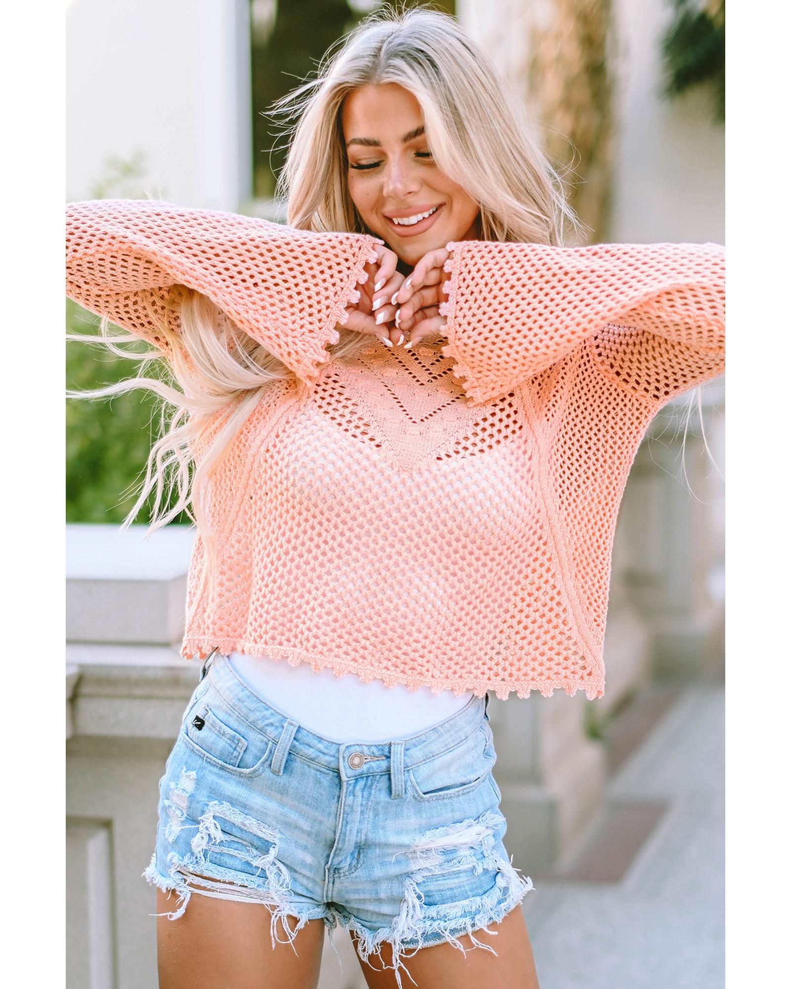 Pink Hollowed Eyelets Knit Bell Sleeve Sweater – M