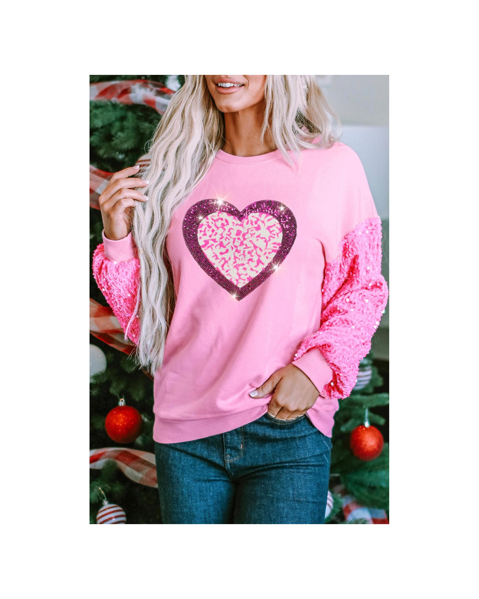 - Pink Leopard Heart Graphic Sequin Patchwork Long Sleeve Valentines Top