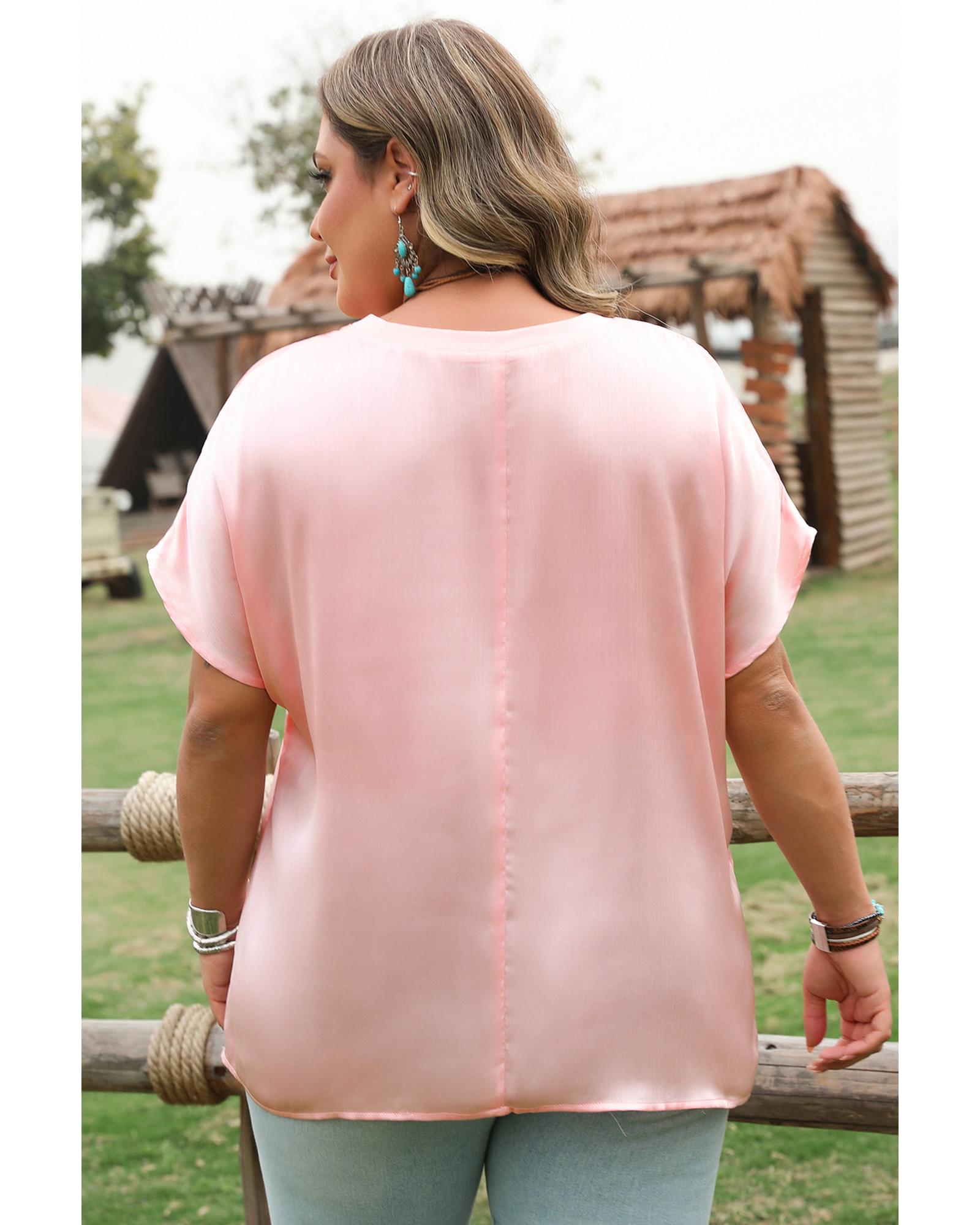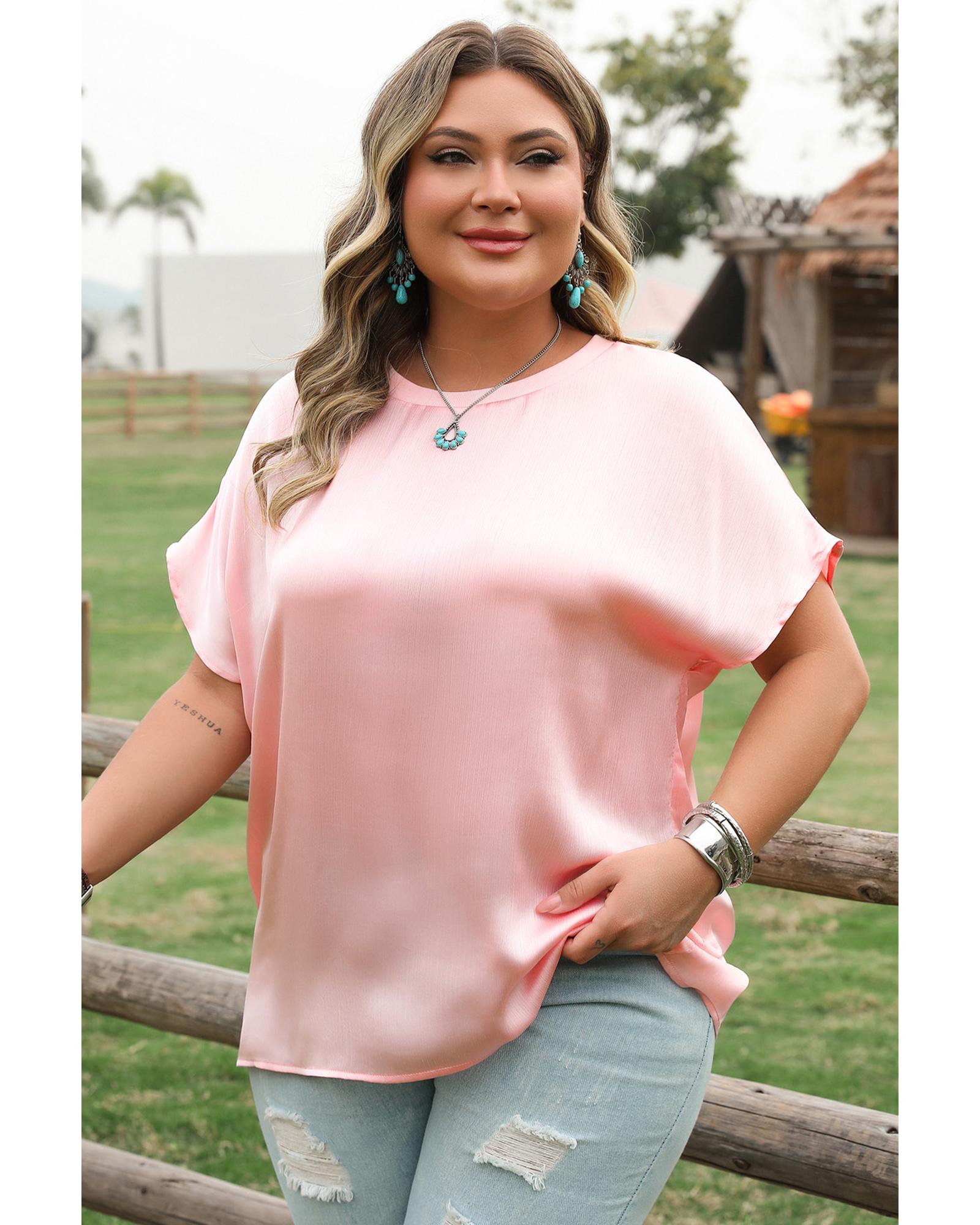 - Pink Metallic Gloss Short Batwing Sleeve Plus Size Top