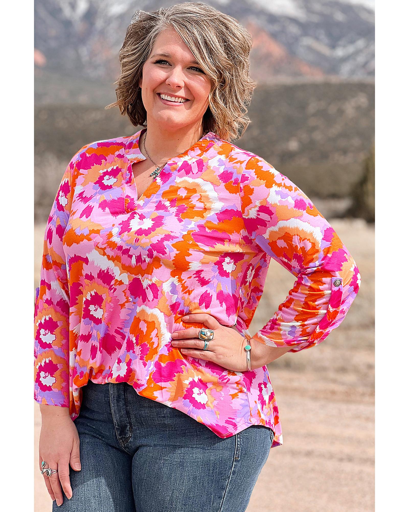 Pink Plus Size Abstract Floral Print V Neck Blouse – 1X