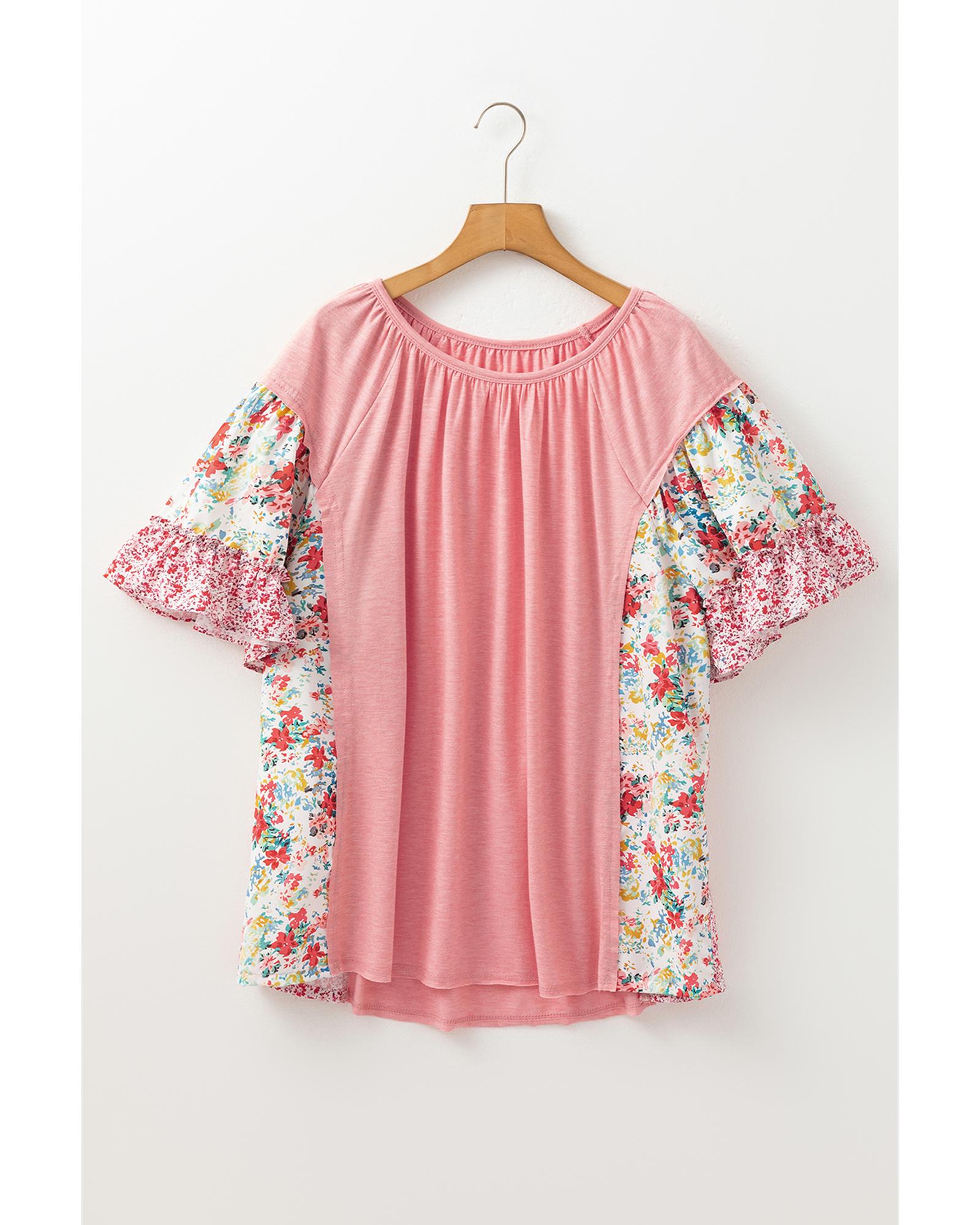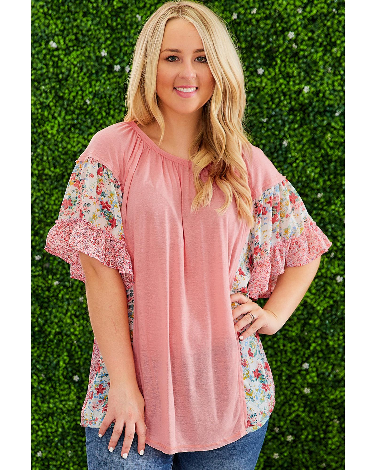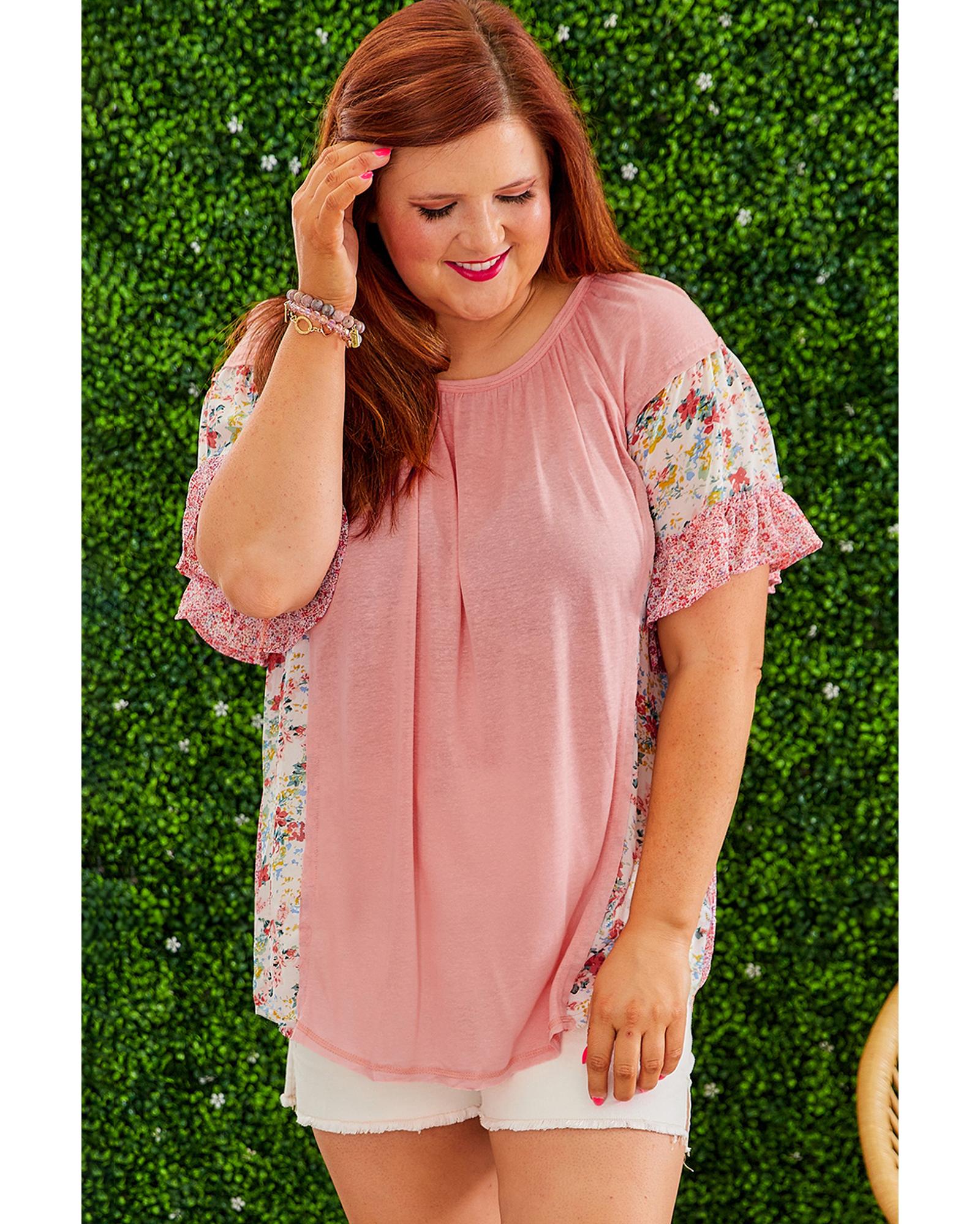 Pink Plus Size Floral Patchwork Ruffled Short Sleeve Blouse – 4X