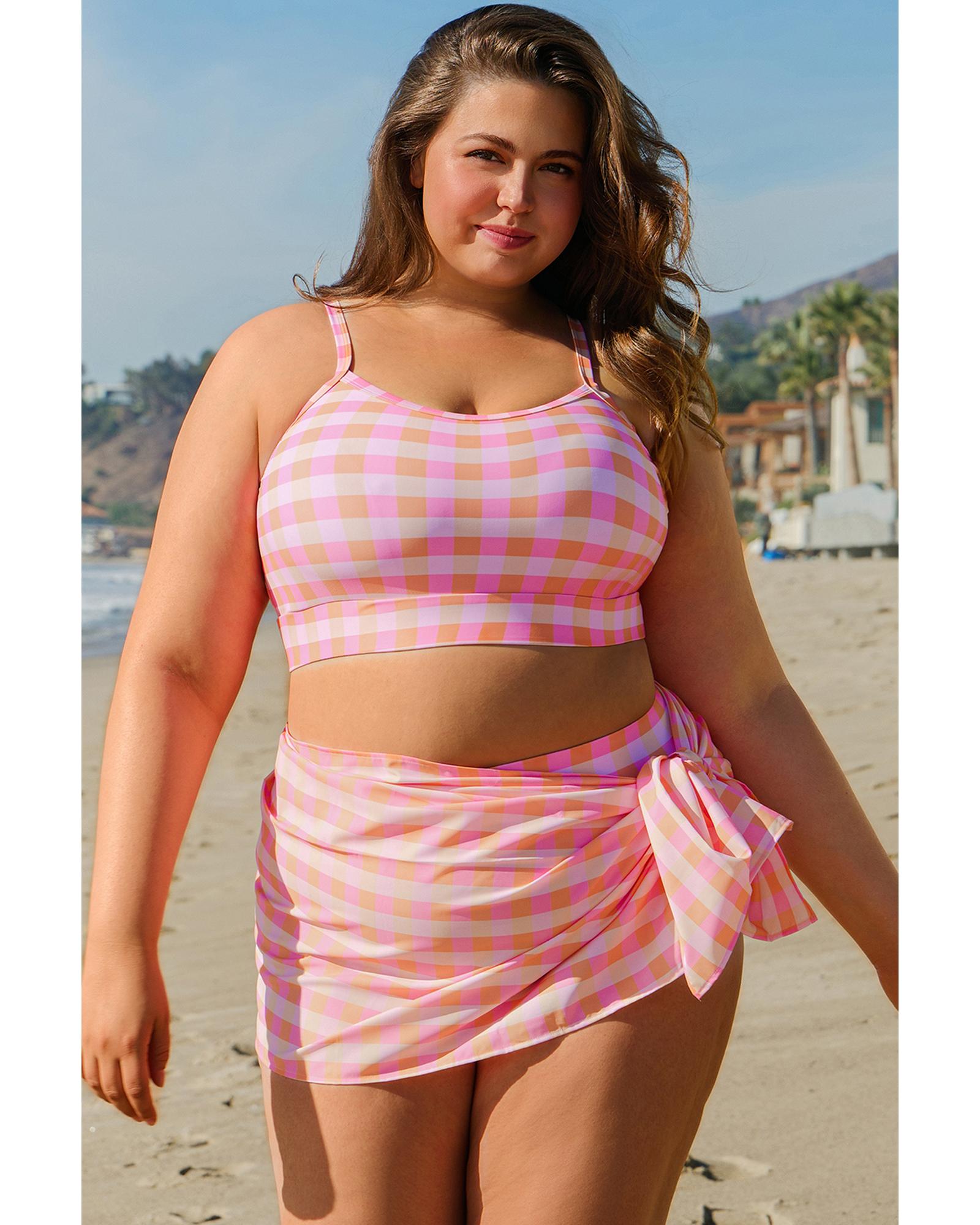 Pink Plus Size Plaid Print High Waist Bikini Set - 3X