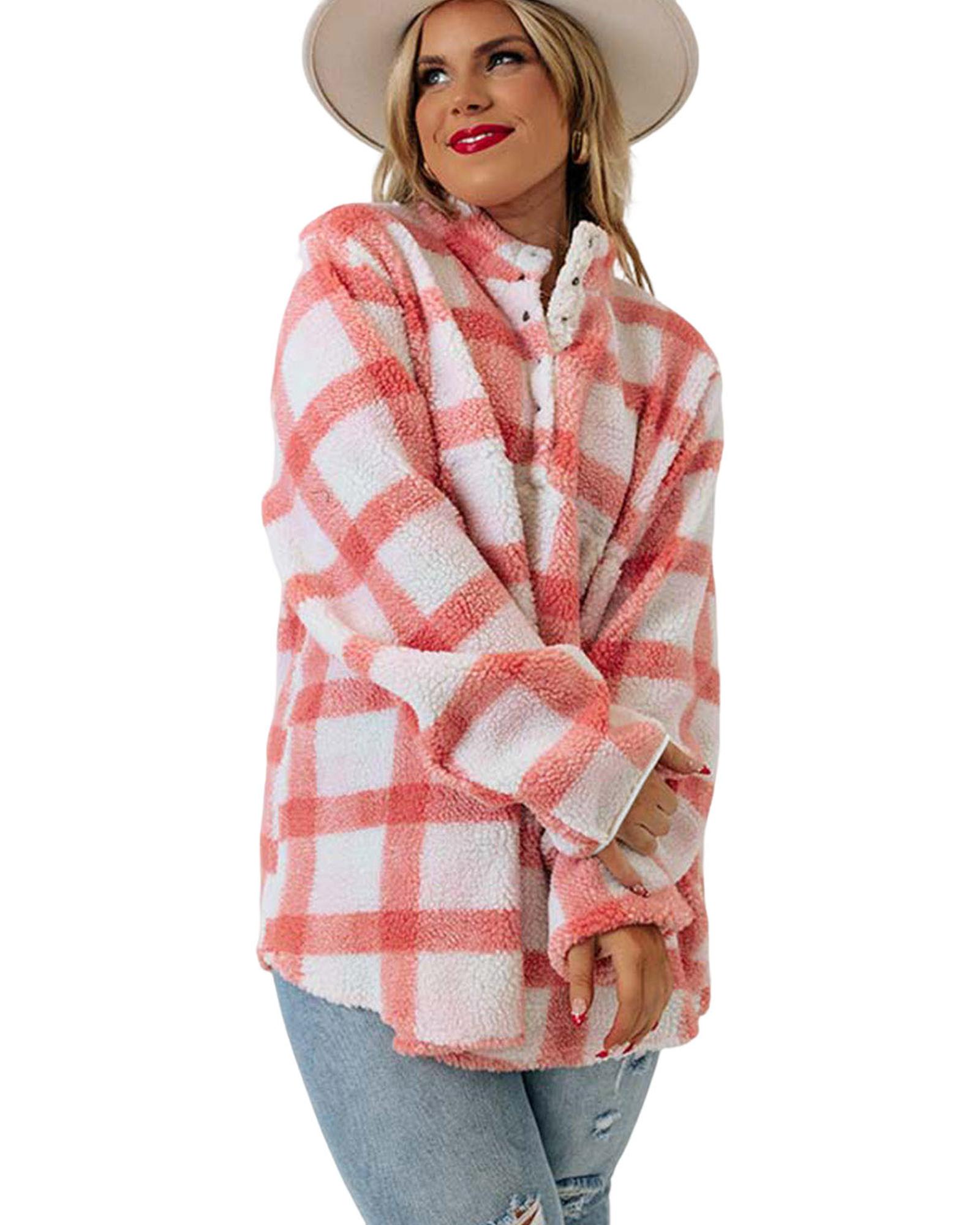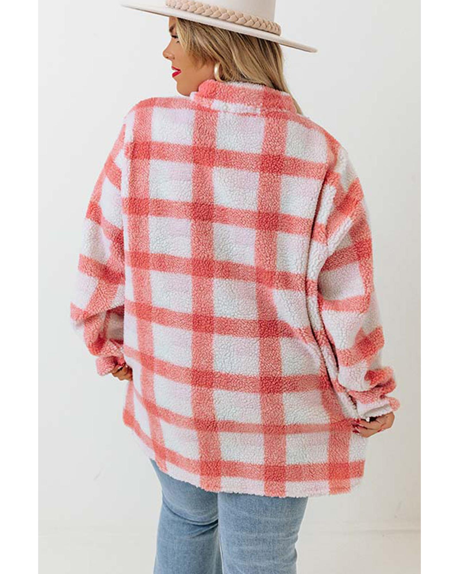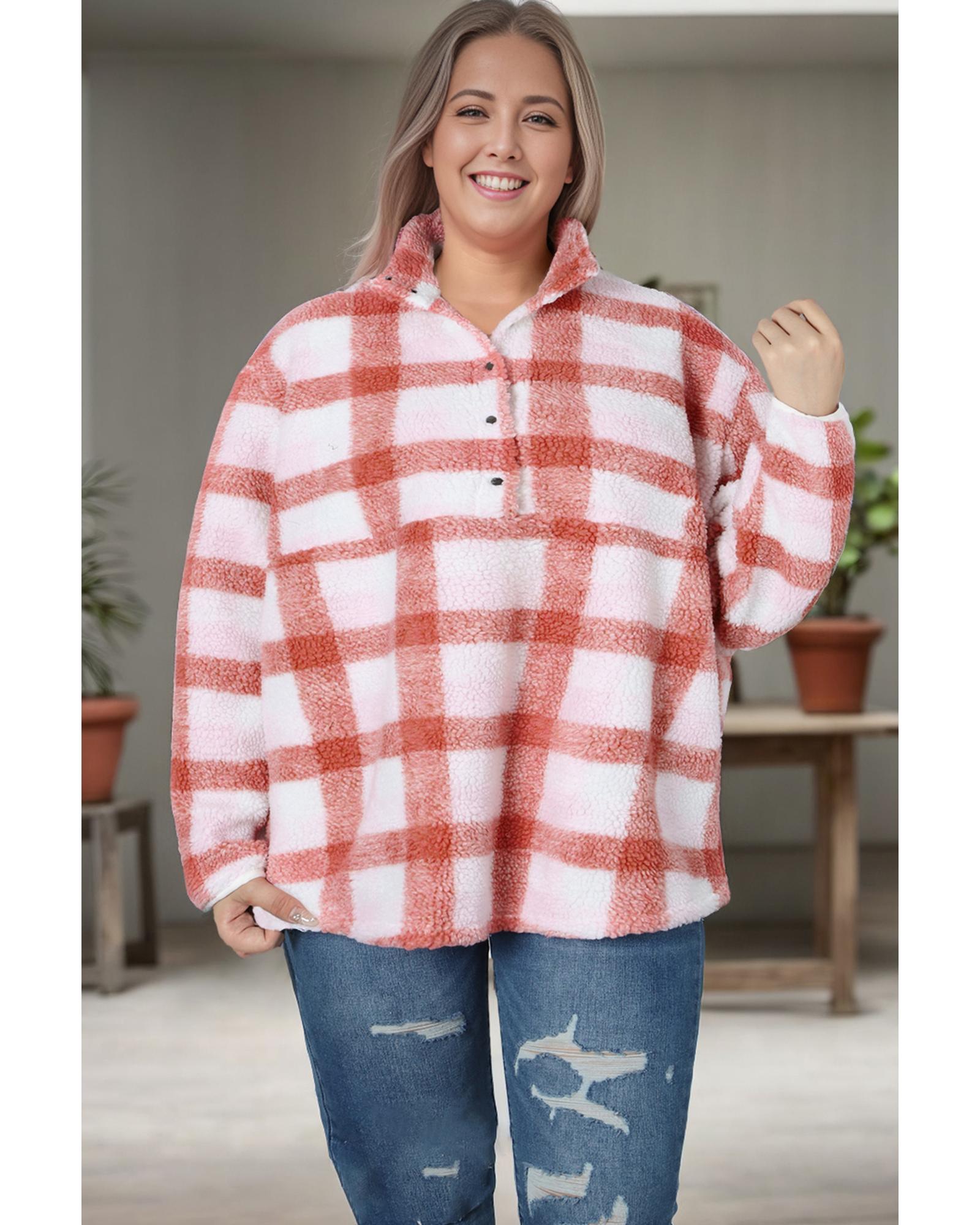 Pink Plus Size Tunic Plaid Sherpa Henley Sweatshirt – 2X
