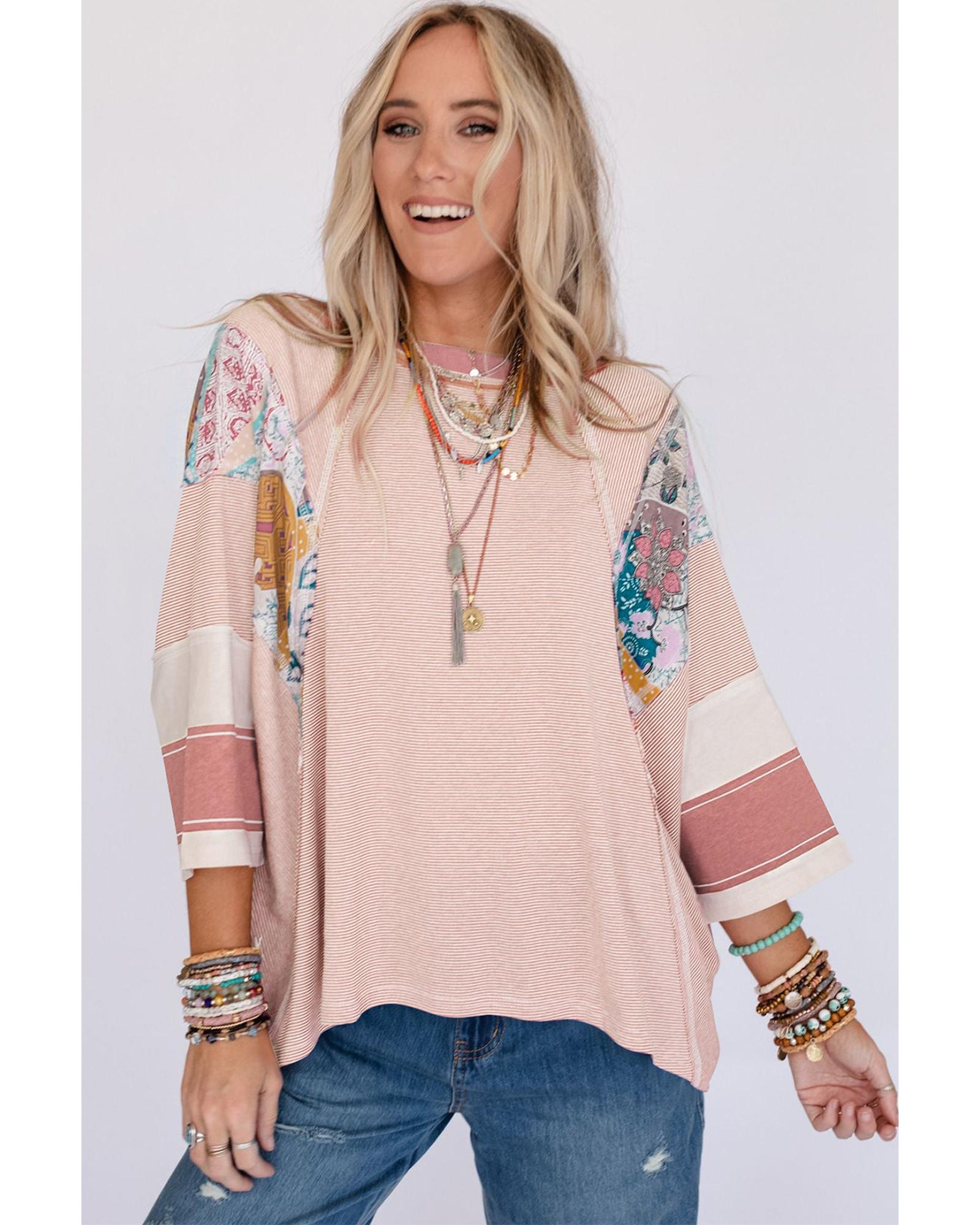 Pink Printed Pinstriped Color Block Patchwork Oversized Top – M