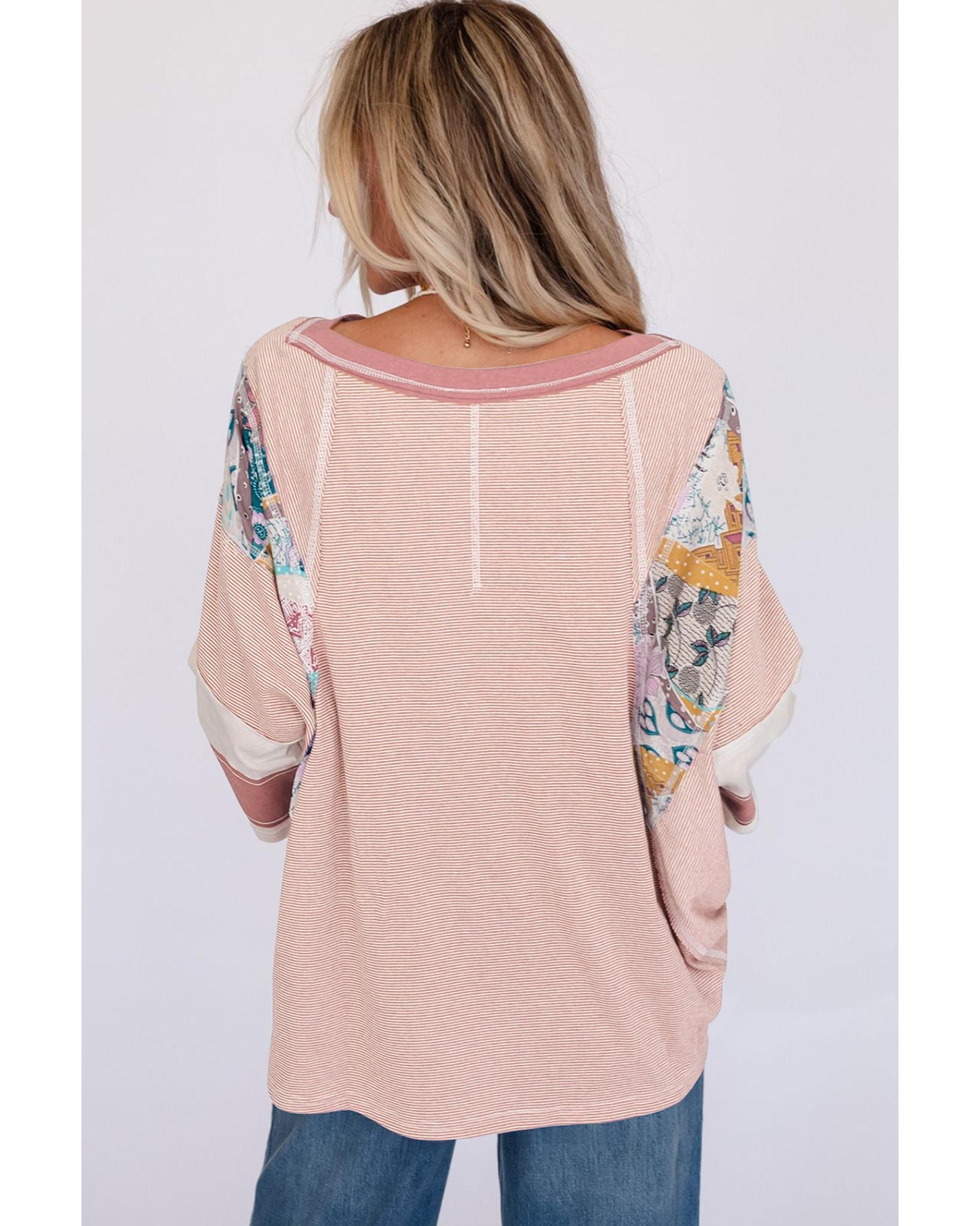 Pink Printed Pinstriped Color Block Patchwork Oversized Top – S