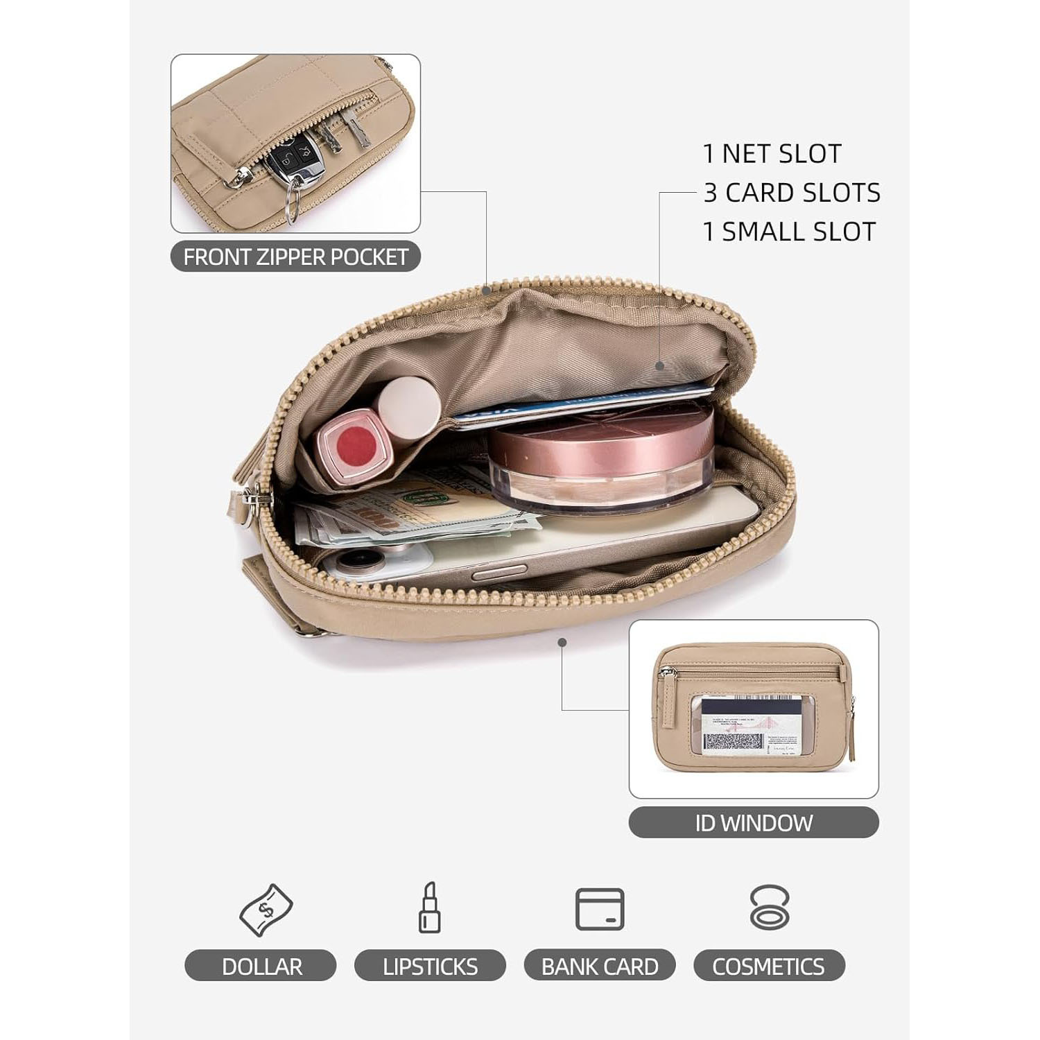 • Organized Interior: The main zippered compartment opens to reveal dedicated storage, including 3 card slots, 1 mesh slot (ideal for cash or receipts), and 1 small slip slot, keeping your items neatly arranged.