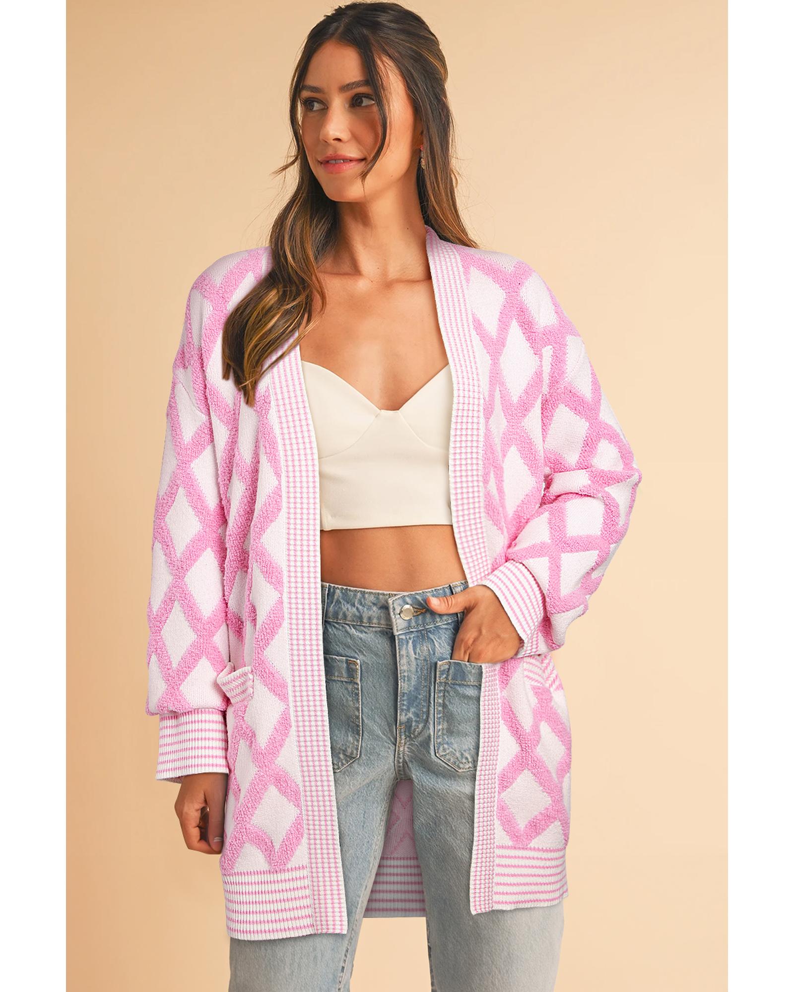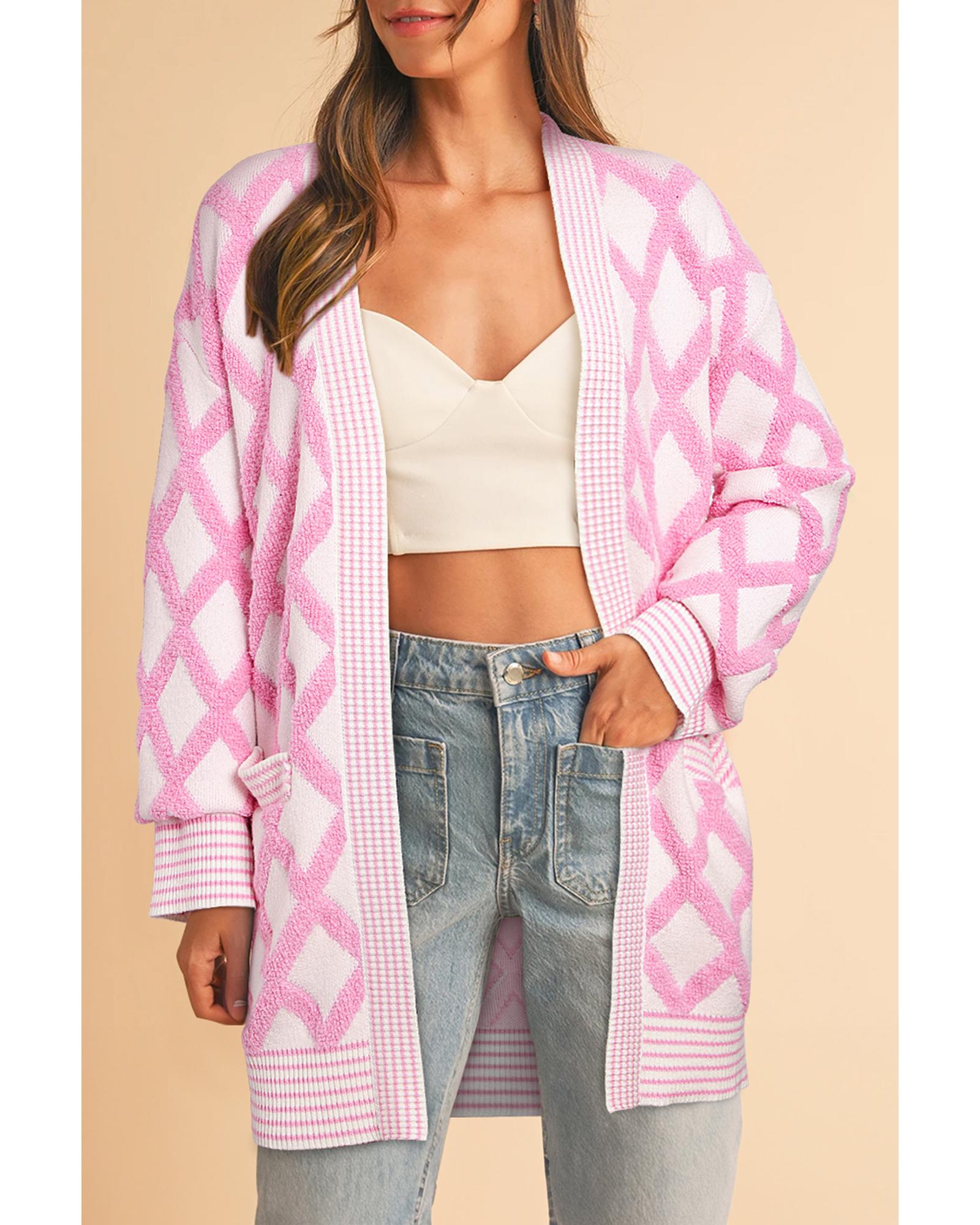 - Pink Rhombus Pattern Knit Open Front Pocketed Cardigans