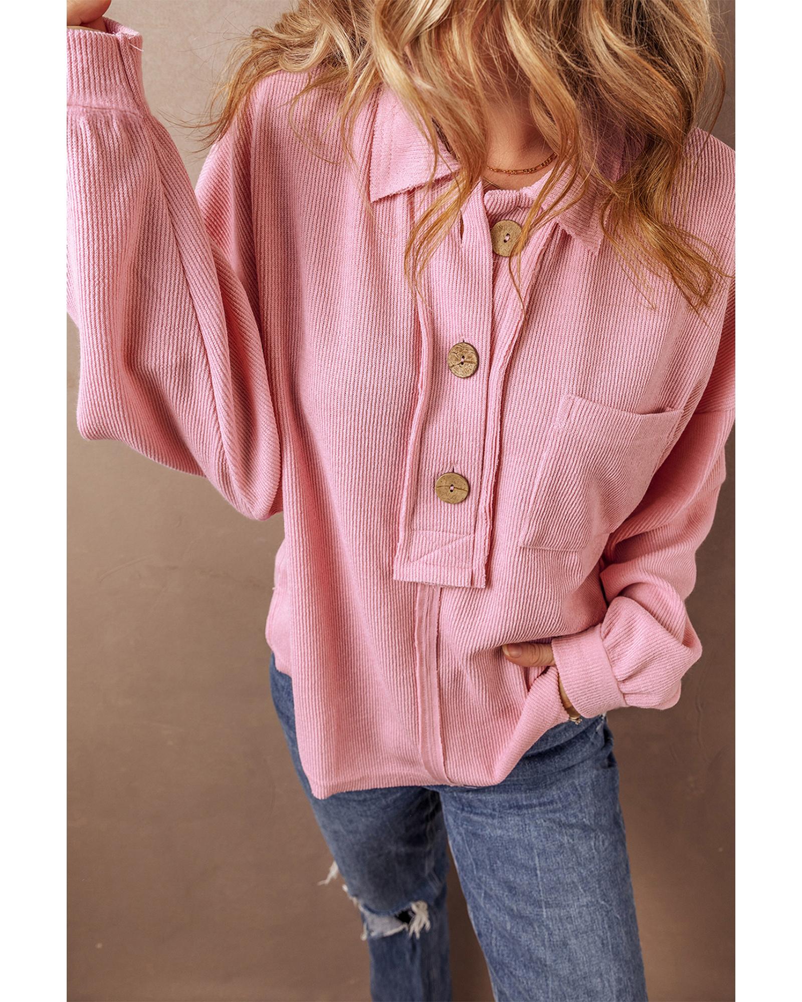 - Pink ribbed knit collared Henley top with chest pocket