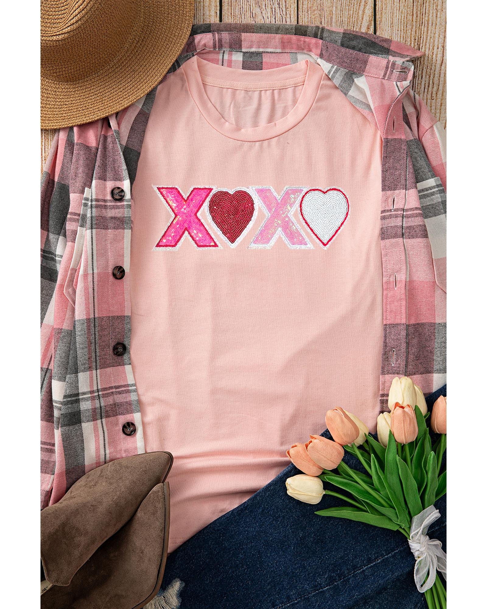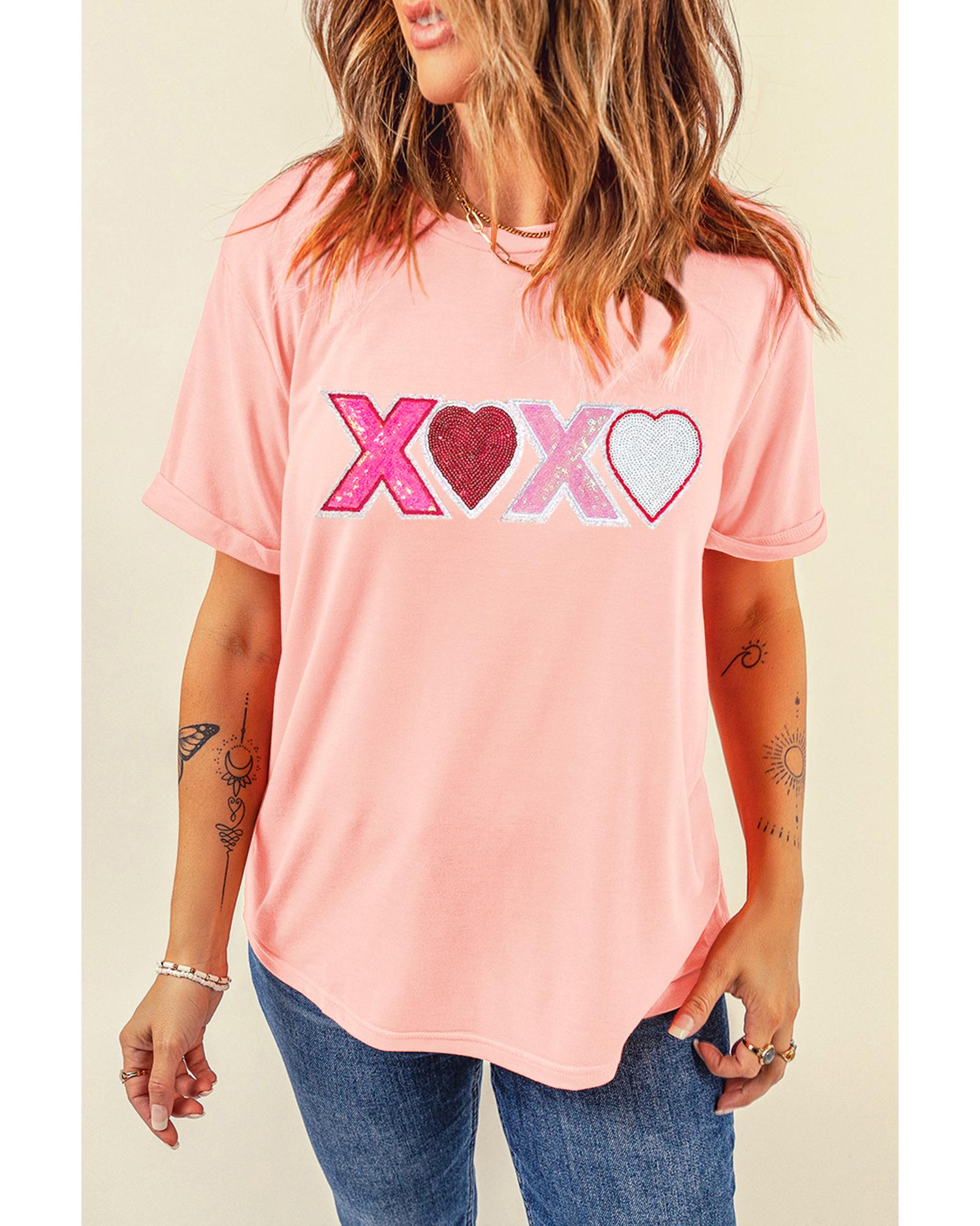 Pink Sequin Heart XOXO Patched Graphic Valentines T Shirt – 2XL