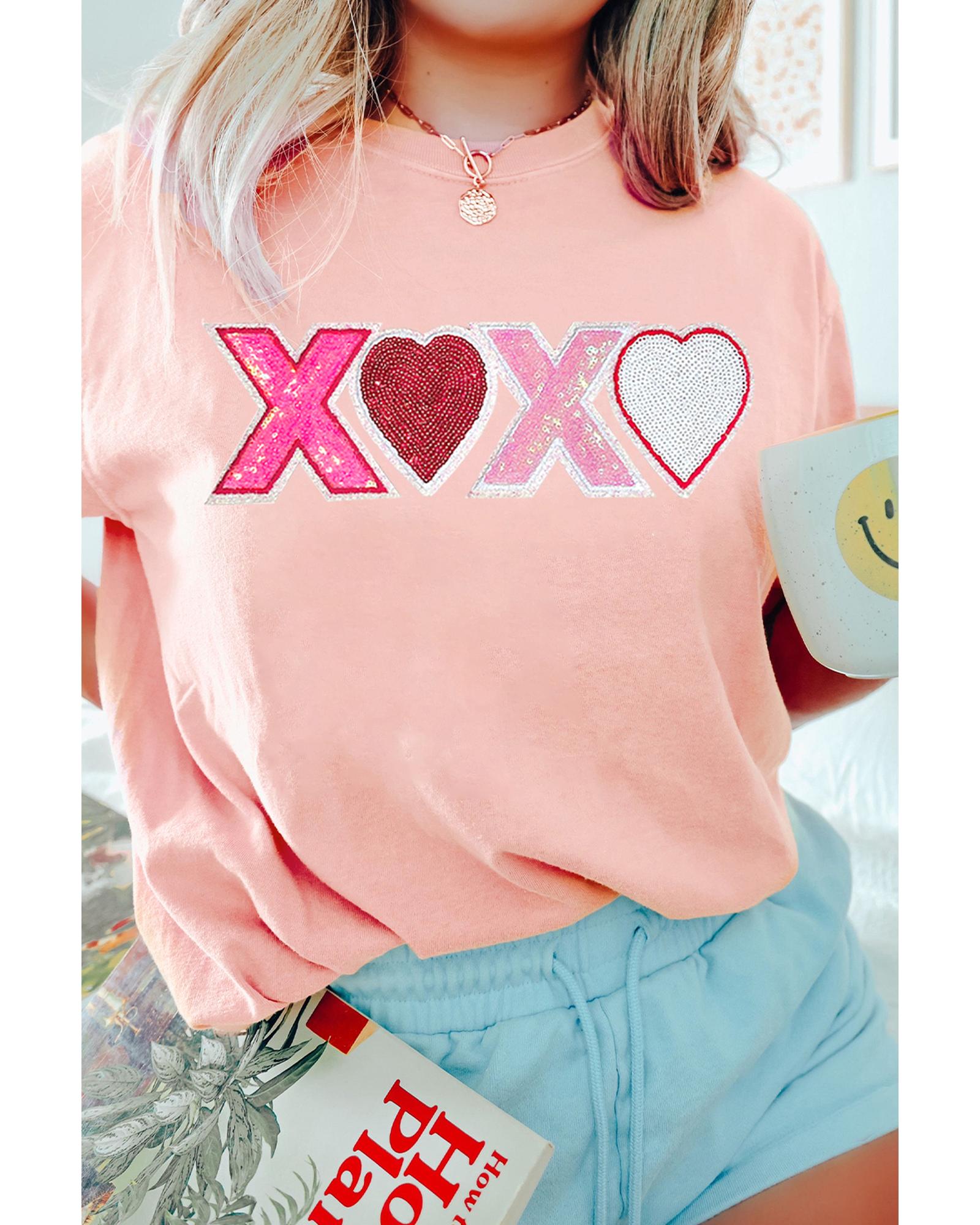 Pink Sequin Heart XOXO Patched Graphic Valentines T Shirt – L