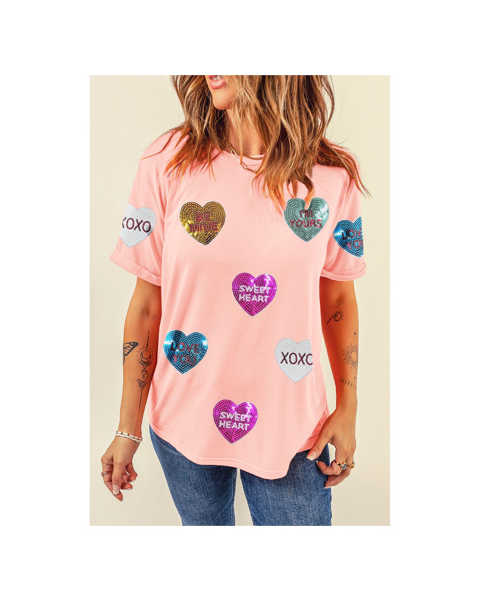 Pink Sequin Valentines Lettering Heart Patched Crewneck T Shirt – M
