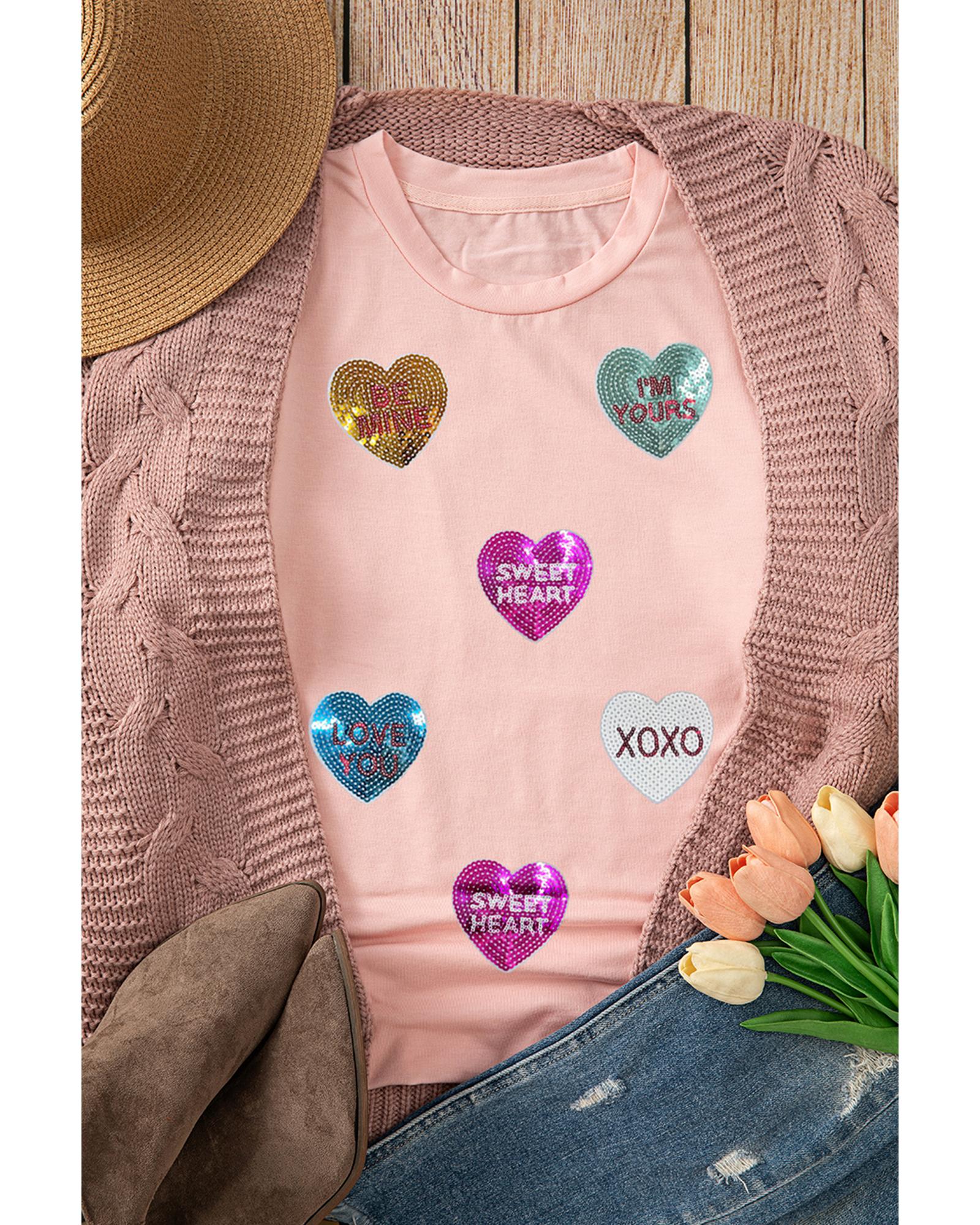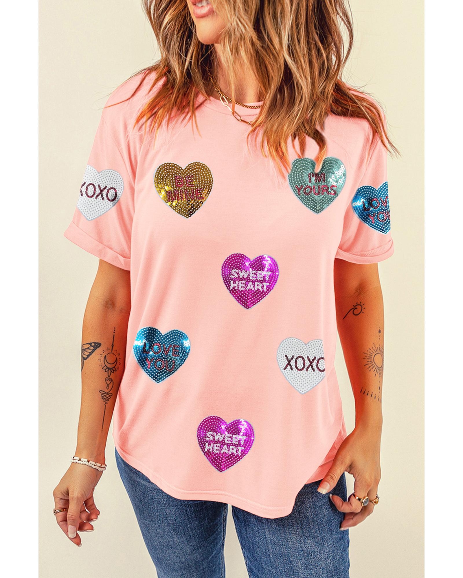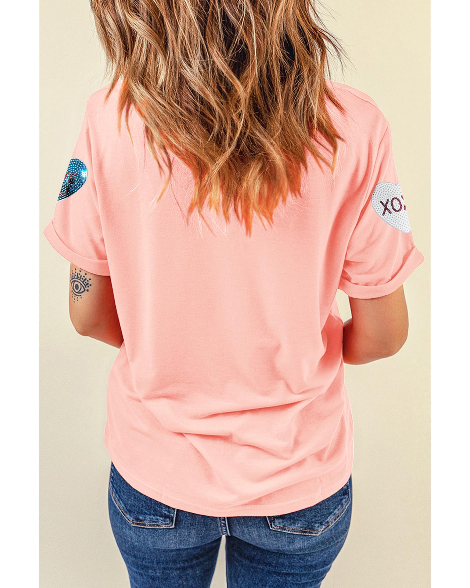 Pink Sequin Valentines Lettering Heart Patched Crewneck T Shirt – XL