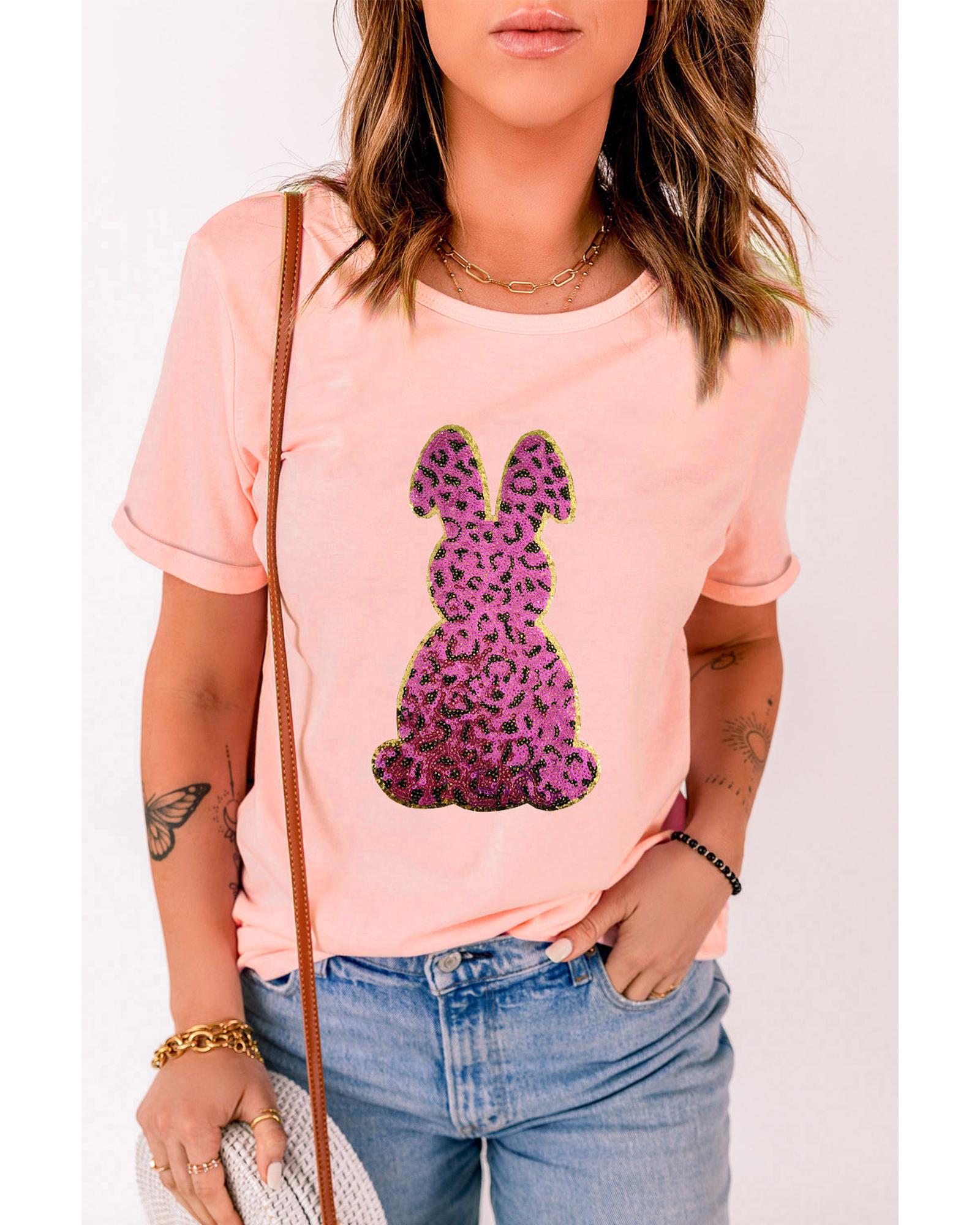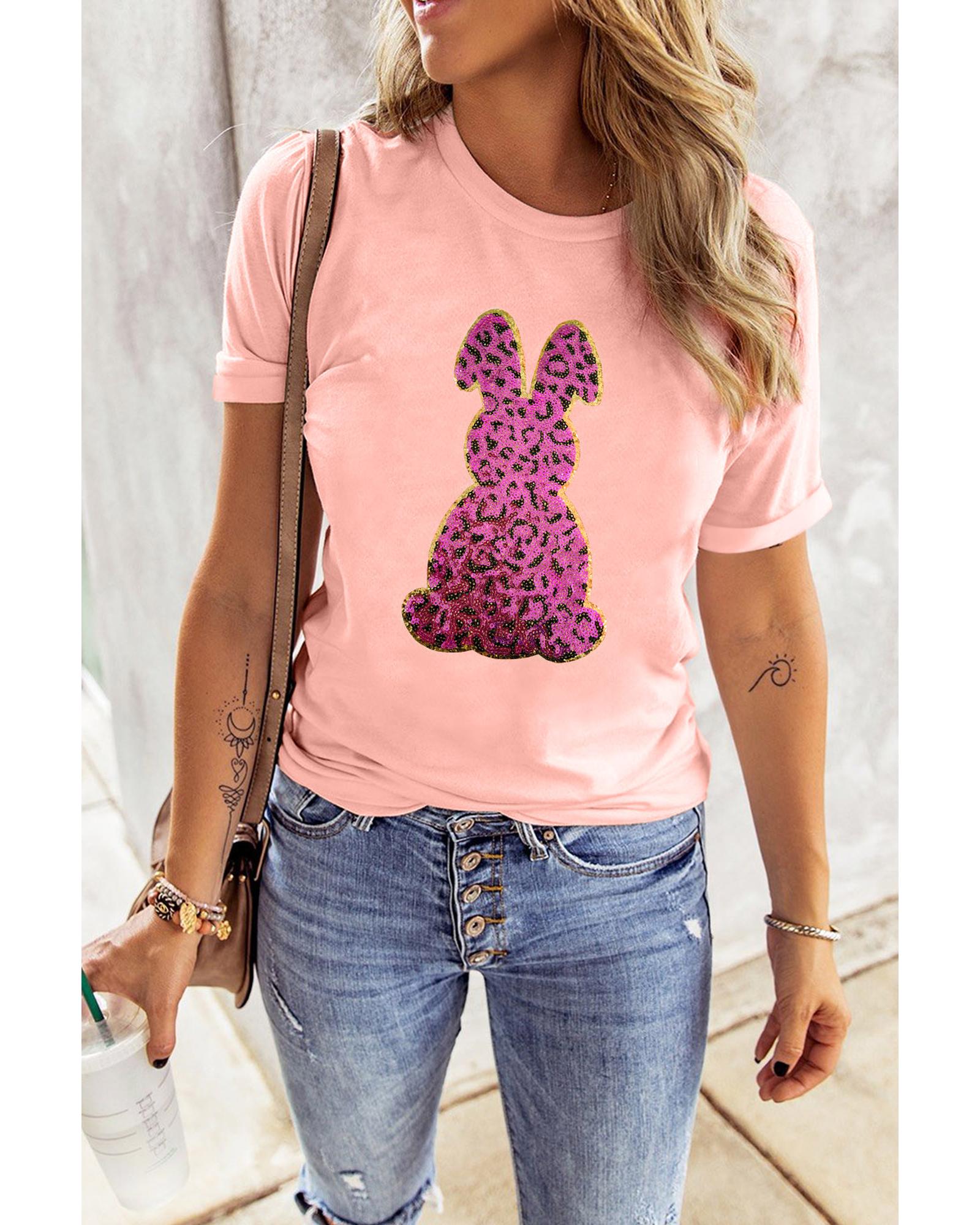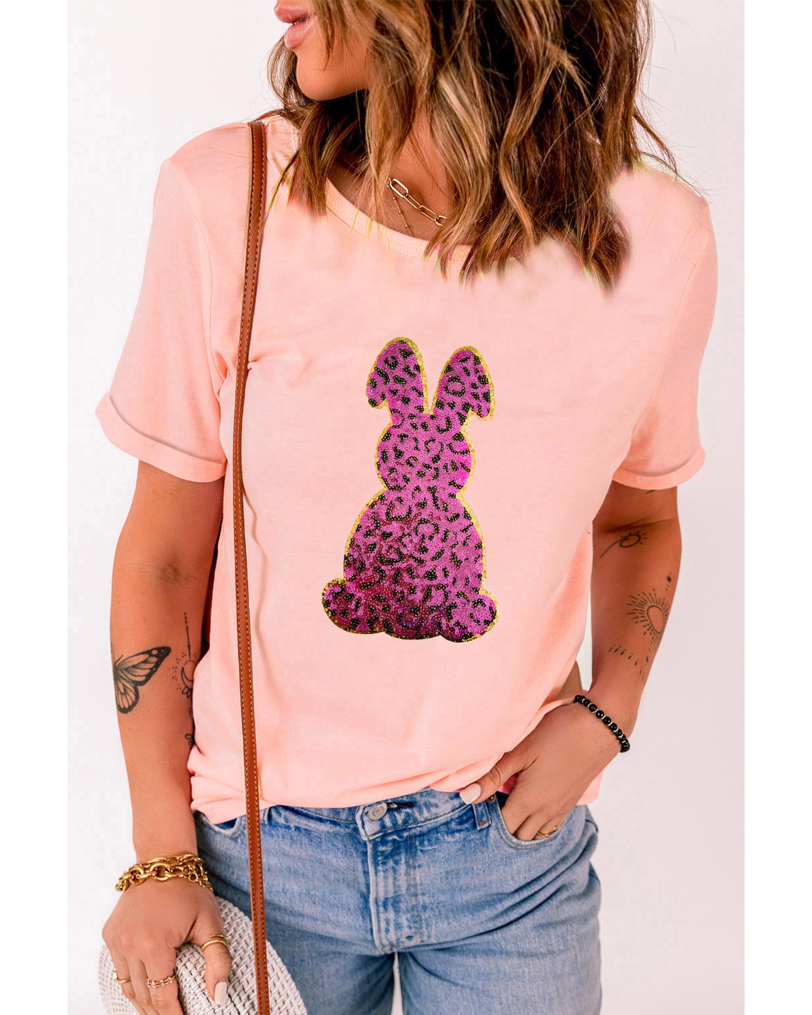 Pink Sequined Leopard Bunny Easter Graphic Tee – XL