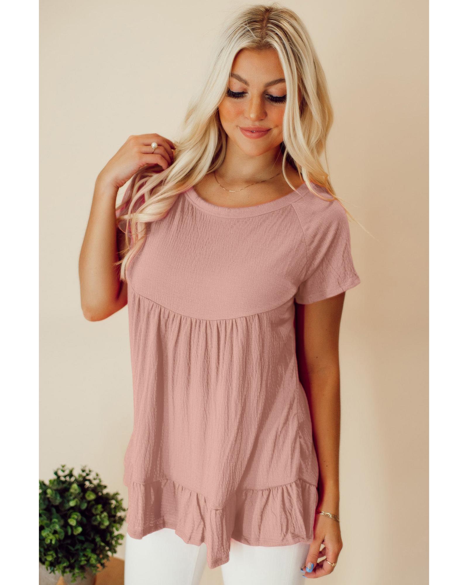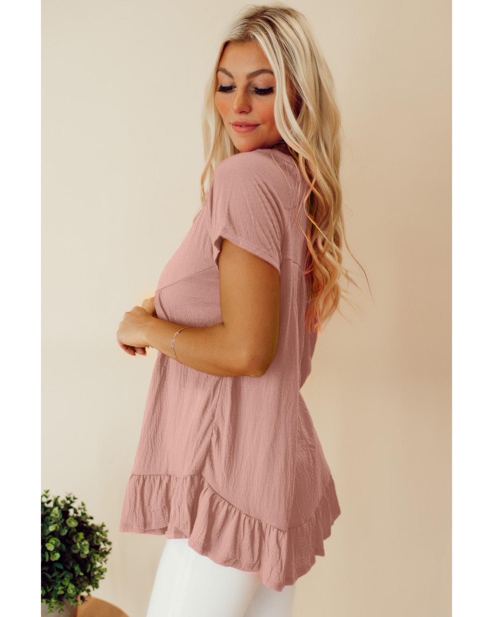- Pink solid short sleeve ruffle hem top