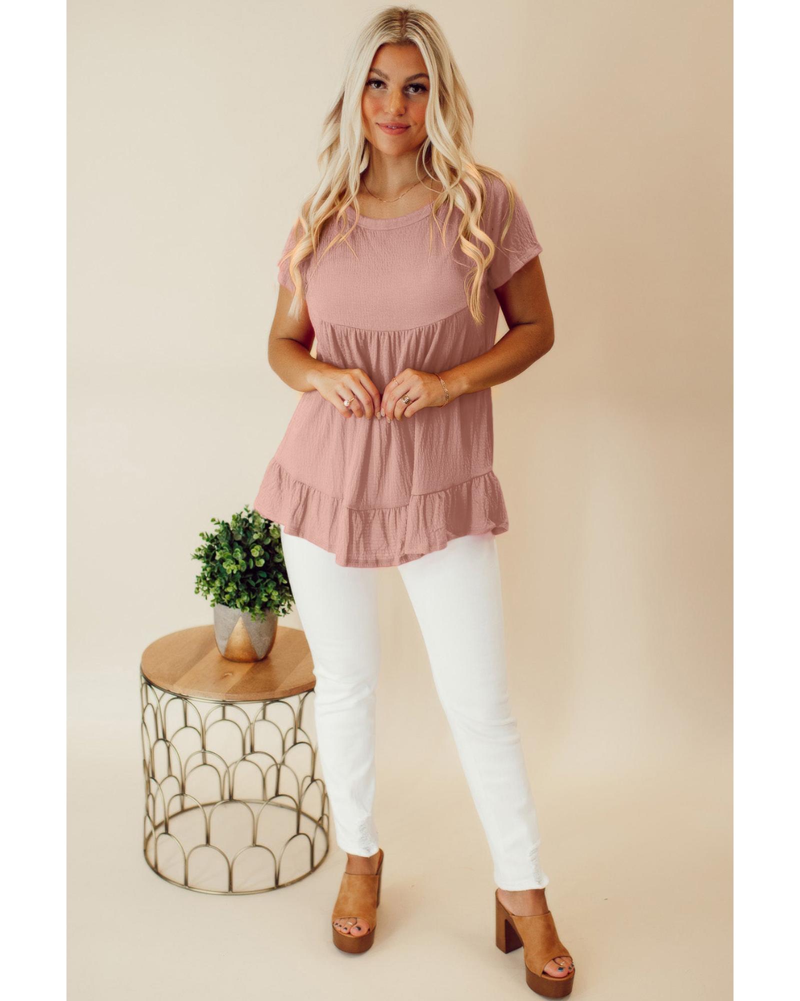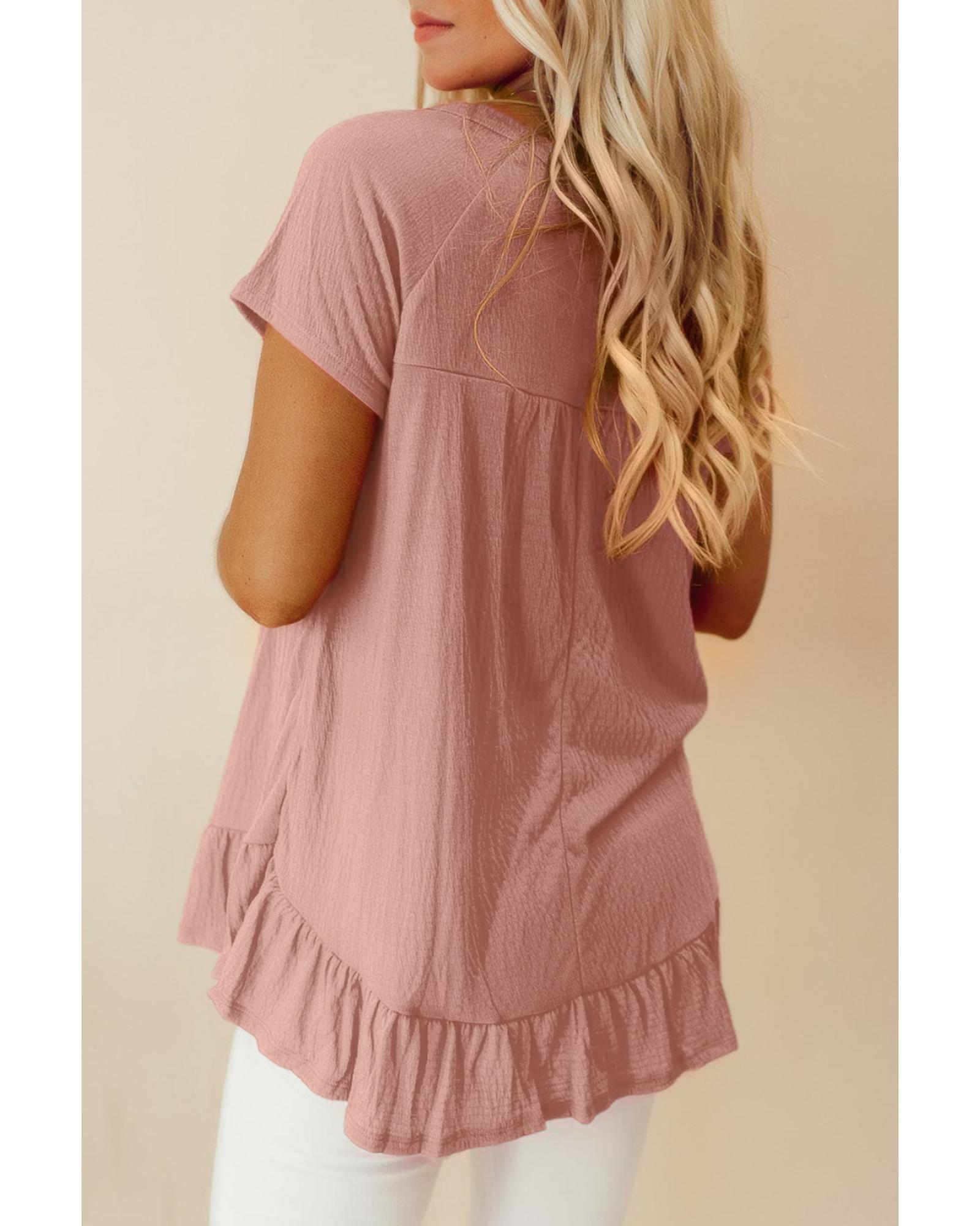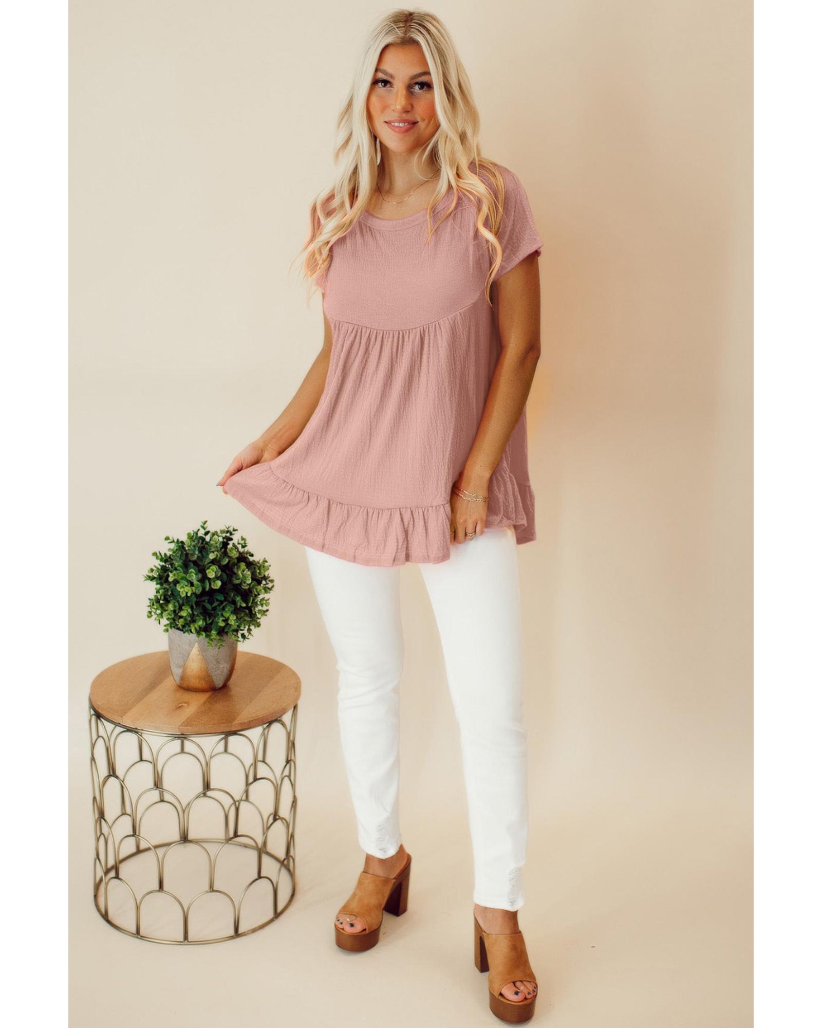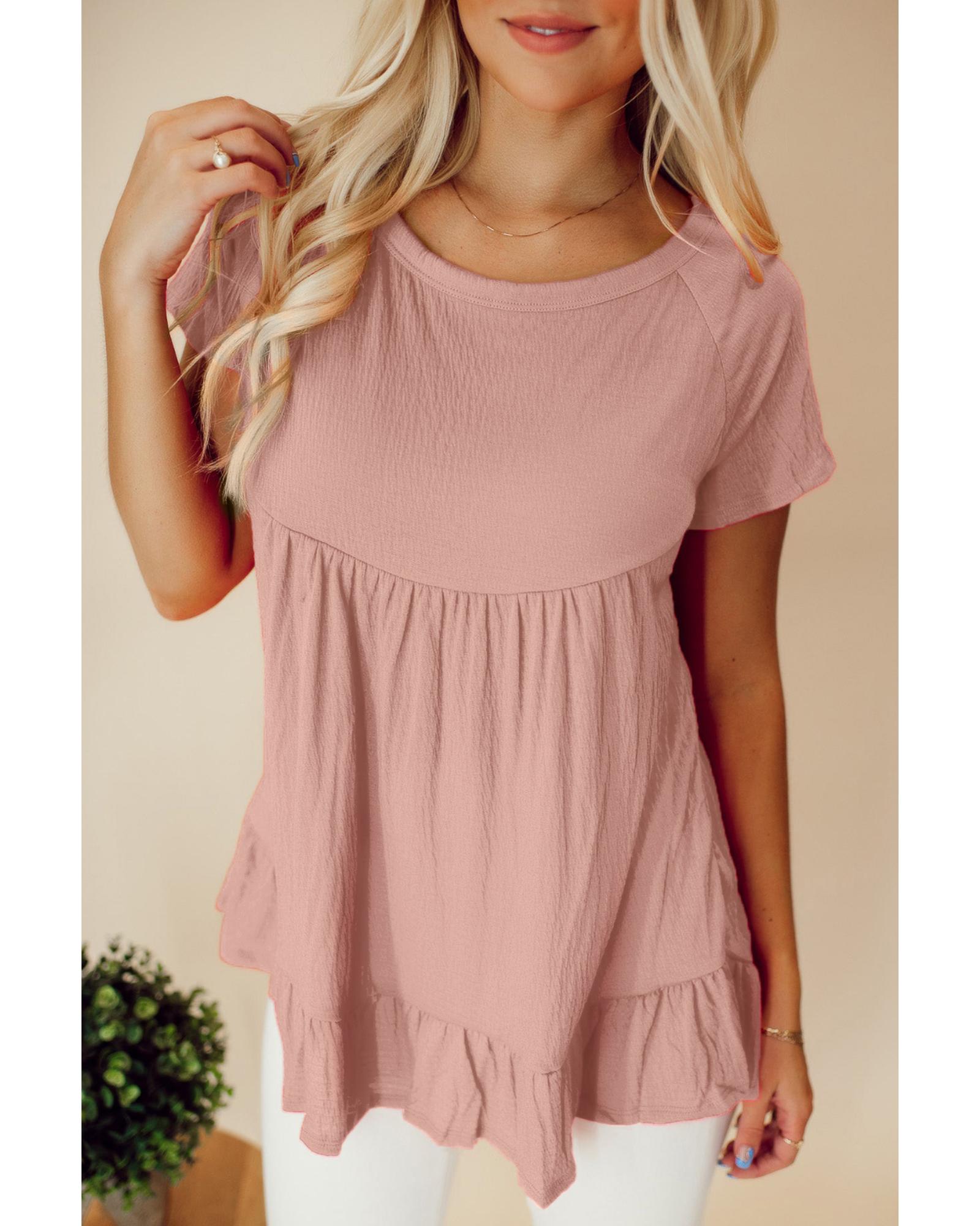 - Pink solid short sleeve ruffle hem top