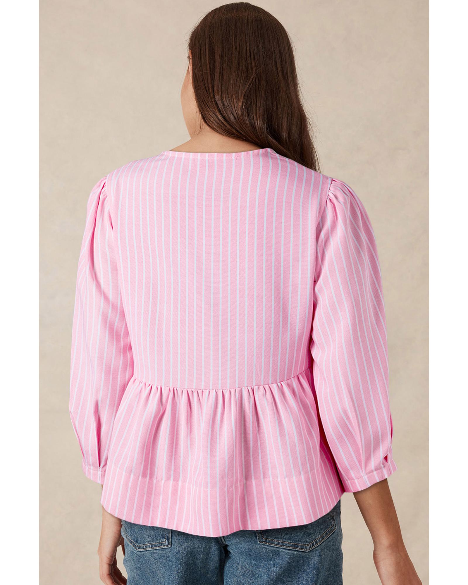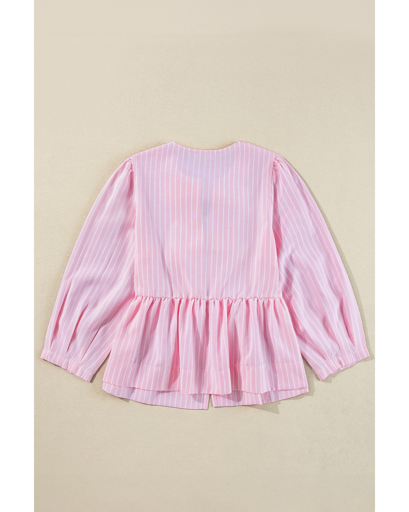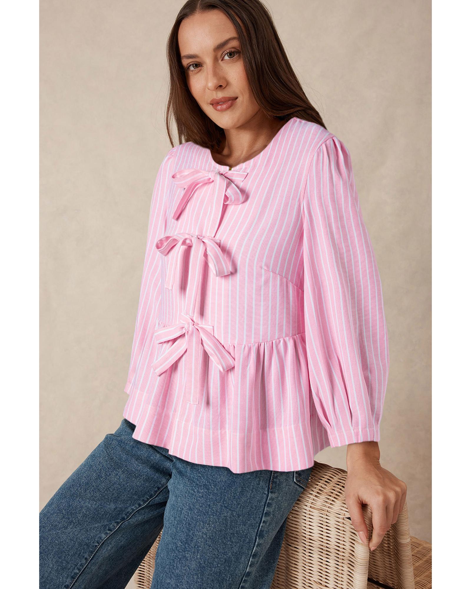 Pink Stripe Bowknot Front Crew Neck Puff Sleeve Blouse – XL